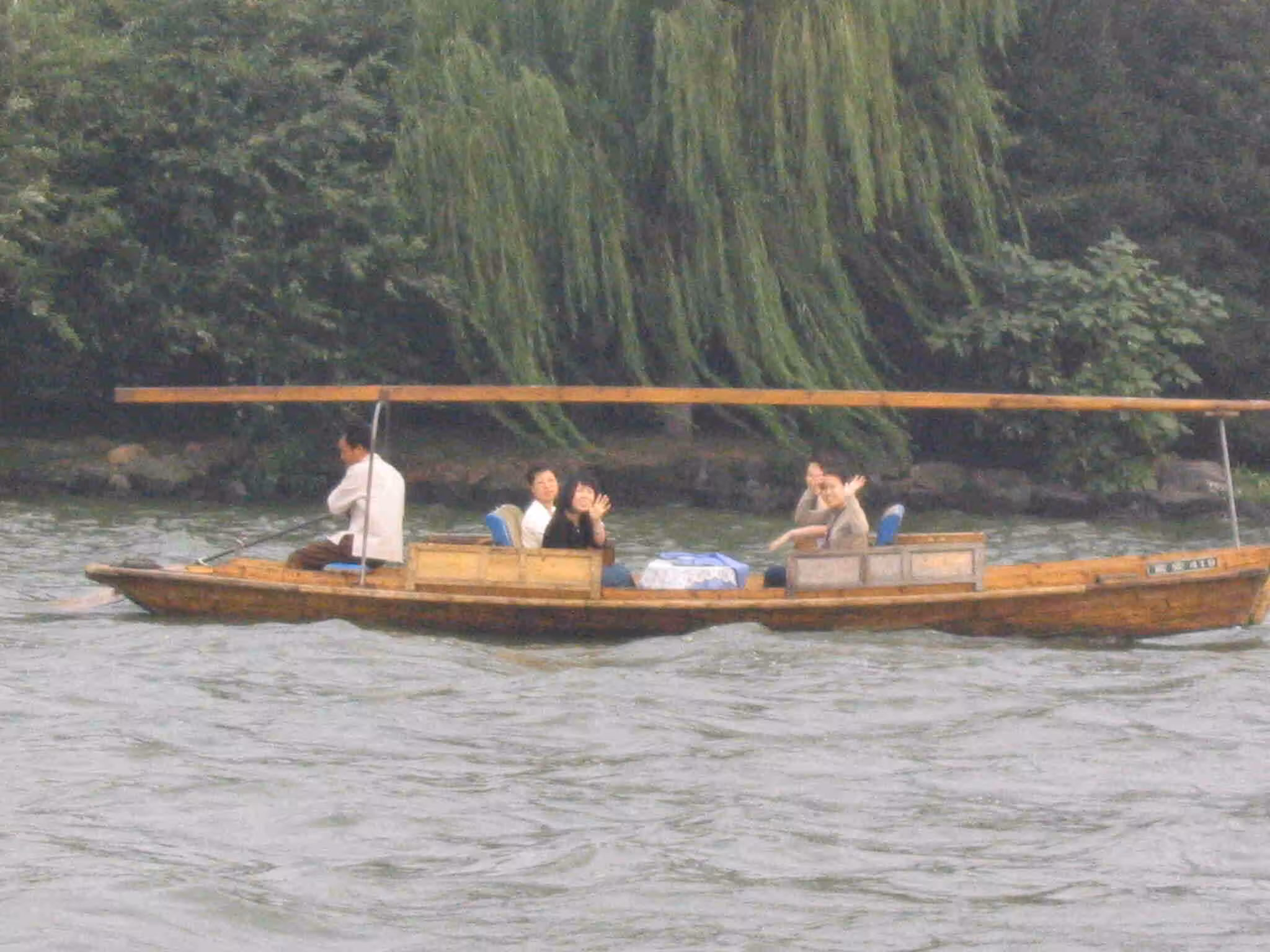 One of last tourist site we had planned to visit was Hangzhou. Victoria was eager to join us for the 2 hour train ride. This was yet another early morning wake-up to catch the 7am train. Our Lonely Planet travel guidebook states “For the Chinese, Hangzhou is the country’s most famous tourist attraction. The lake gives rise to what must be one of China’s oldest tourist blurbs: ‘In heaven there is paradise, on earth Suzhou and Hangzhou’”. From the train station, we took the local bus to the downtown area – east of the West Lake. We booked a reasonable hotel in a central location. We visited a few Internet Cafes – without spending much time there. We splurged for lunch by dropping by a Pizza Hut. We had KFC a few evening back with Jenny’s younger brother and nephew – a real big treat for them. In the afternoon, we walked a bit around West Lake. Strangely, I felt like a lot of Chinese were surprised to see a foreigner – some teenager girlss even asked Jenny’s permission to have my picture taken with them! Later we took a series of boat to visit some small islands. Jenny bought really fresh Longjing green tea leaves – it was still warm from its “roasting” process. At the end of the afternoon, we took a local bus to a very nice souvenir market area. We spent a few hours browsing for souvenirs. We noticed that it was not possible to bargain too hard over here. We took the taxi back to the hotel. We went for supper to a very popular Chinese fast food across from our hotel. The place was chaotic and operated in an unusual way. We had to buy “x” amount worth of tickets then line-up at different parts of the counter for different food items – somewhat like a cafeteria but with the cash register at the beginning of the line!