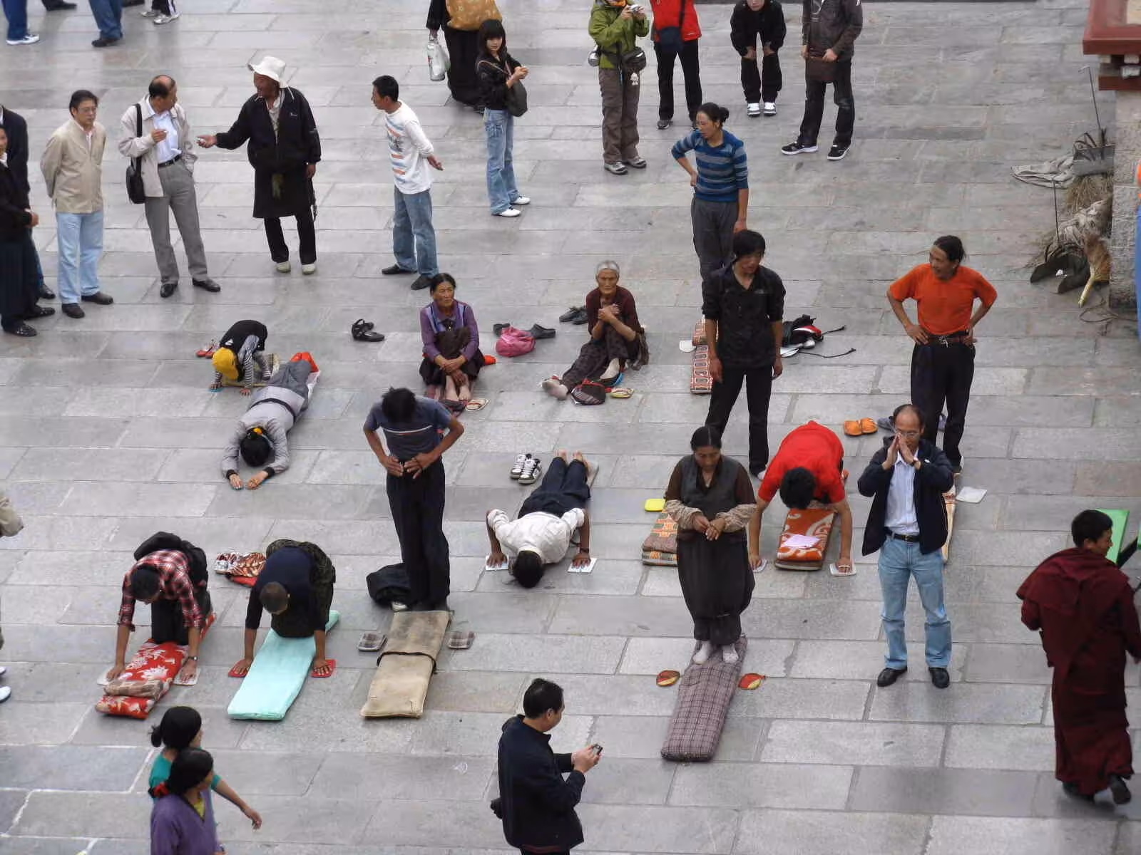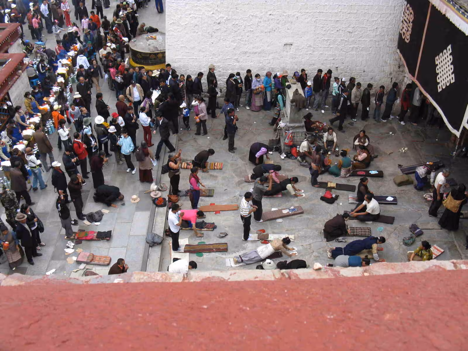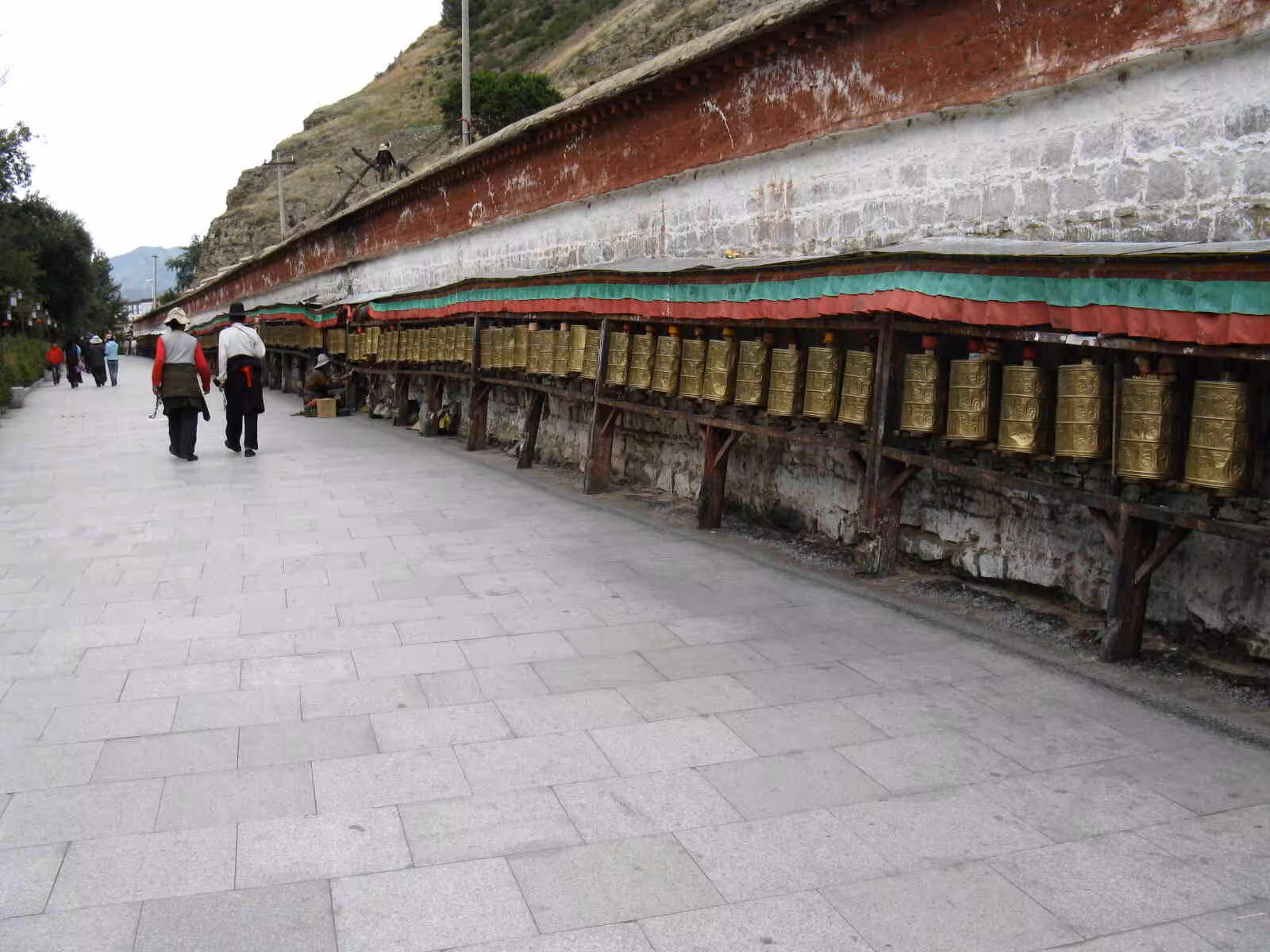 Since our arrival in Lhasa, we’ve felt immersed into a different culture within China. Although we’ve seen many Buddhist temples throughout out trip, we have a hard time relating to the devout pilgrims that queue several hours each morning at the Jokhang Temple in order to pray in the various chapels contained in the temple. We’ve seen an ongoing flow of pilgrims turning their hand-held prayer wheel or stationary prayer wheel. From our western Christian perspective, it is a bit hard to comprehend the extent of the Buddhist faith. As we understand, although the Buddhism was imported from India, it appears that Tibet has blended to it some of its own particularities.