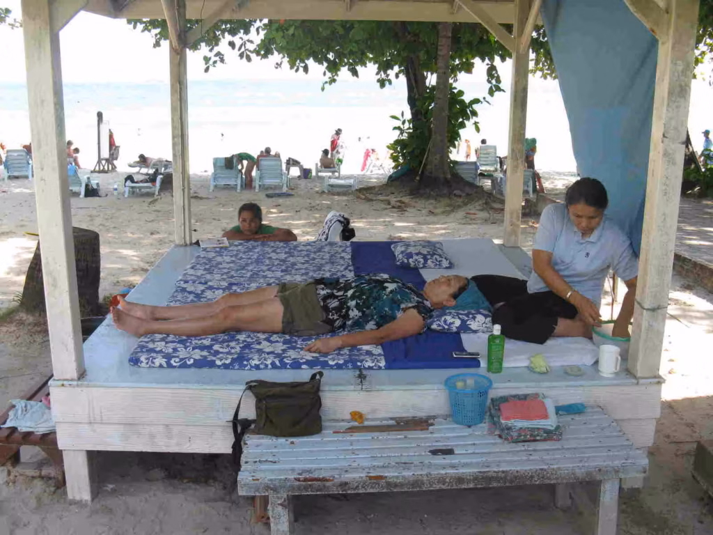 On Christmas day, we’d planned to visit Ko Pha-Ngan island which was made famous of its full moon parties and its Sunrise and Sunset beaches. Unfortunately, the ferry scheduled did not offer us too many choices and we opted to spend the rest of the day at our own beach again. Jenny got herself a 45 mins facial massage (for $13) right in front of the beach. The competition among restaurants is pretty fierce.