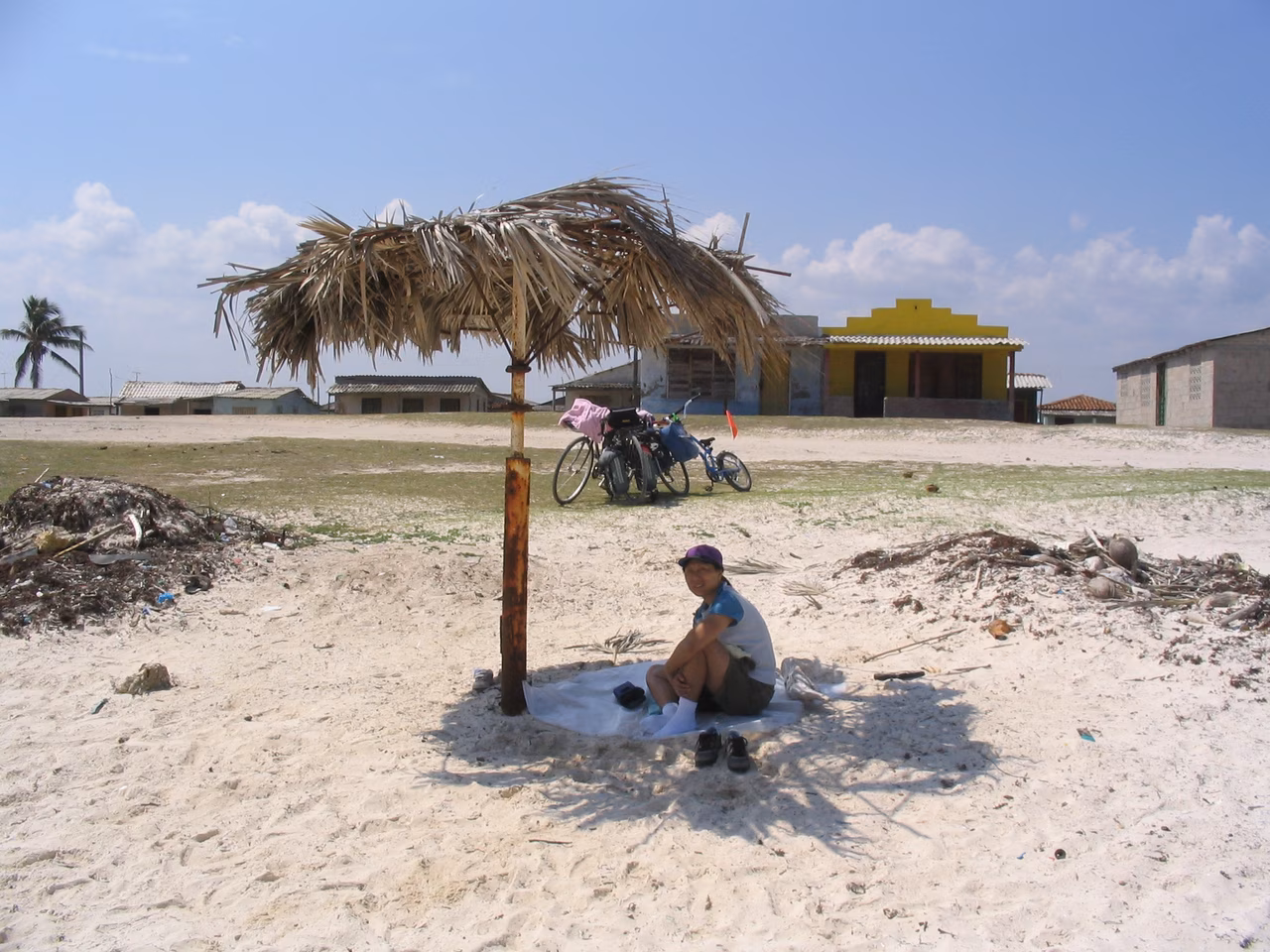 Nous entendons le chant du coq. Ce matin nous ne faisons pas de grâce matinée. Nous plions nos bagages tranquillement. Notre hôtesse nous attends déjà pour le déjeuner. Nous déjeunons une dernière fois sur les lieux. Nous chargeons les bagages sur les vélos. On règle la note pour notre séjour et repas (101$). Toute la maisonnée et même le guide qui nous as amené ici sent son place pour notre départ. Le guide espérait un T-shirt mais je lui ai dit que j’en avait seulement deux. Nous prenons quelques photos avant notre départ – très émotionnelle. Le soleil est de la partie pour la route. Nous nous engageons sur la route pour Playa Caletones. La route de terre est très carrossable en vélo. À l’entrée de la Playa Caletones, les locaux nous proposent un dîner à leur maison. La plage est très décevante. Jenny est agacé par les chiens. Nous négocions l’aide d’un guide à vélo afin de nous amener à Playa Herradura – car la route n’est pas très bien identifié. Nous prenons une seule assiette de poisson à trois pour appuyer l’économie locale. Après notre repos à la plage, nous dînons à une casa très modeste. Vers 13h, nous quittons Playa Caletones avec notre guide. Il fait chaud, mais la route près de la mer est agréable. Dès la première fourche, nous réalisons les avantages d’un guide – car il n’y a pas de direction ni trop de gens sur la route. En route, nous arrêtons à tous les 7 à 10 kms pour donner un petit repos à Victoria. Nous faisons un arrêt à un petit village où les jeunes écoliers sont très intéressés par Victoria. Nous poursuivons notre route sur un chemin de terre beaucoup plus cahoteux. À 7 kms de Playa Herradura, nous retrouvons la route principale en asphalte. Arrivé sur les lieux après 1km de route de terre additionnelle, notre guide nous fait visiter quelques casas. On s’arrête à la deuxième, une petite chambre avec un lit. Nous soupons aux d’énormes poissons entiers – c’est délicieux.