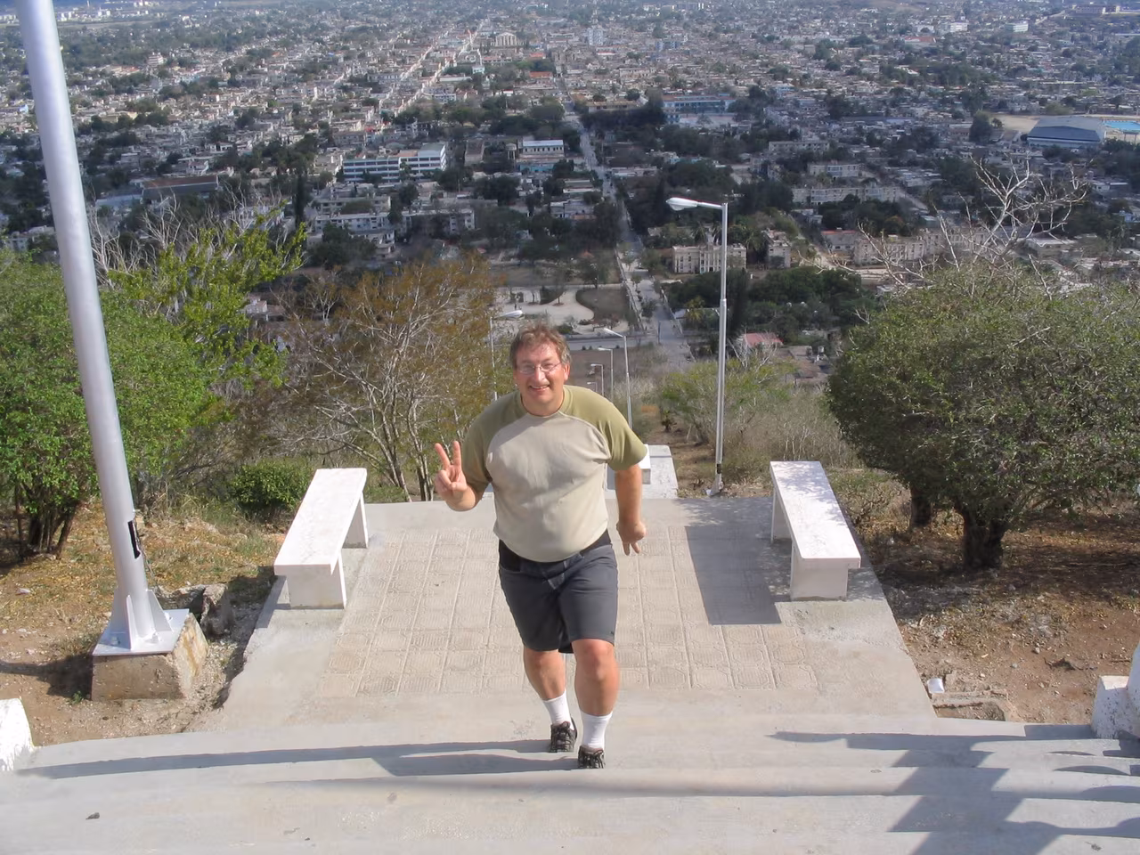 Jenny a expérimenté avec le ventilateur et l’air climatisé au cours de la nuit afin de trouver le bon compromis. Après notre grâce matinée nous déjeunons à la casa. Après nous passons à la banque pour une avance de fonds sur carte de crédit. – C’est assez facile. Nous visitons quelques parcs. Nous faisons un “tour de calèche local”, et j’achète une “pizza locale” et nous mangeons des arachides rôtis avec de la monnaie locale que nous avons converti. ($5). Après une coupe de crème glacée et un peu de temps à un terrain de jeu pour enfants, nous retournons à la casa vers 14h pour un peu de repos. Je fais un peu de lecture. Vers 15h30, Jenny et moi nous nous engageons sur les marches menant au Mirador de Holguín. Jenny conclue que c’est facile. Nous amenons Victoria à un parc d’amusement où les manèges coûte