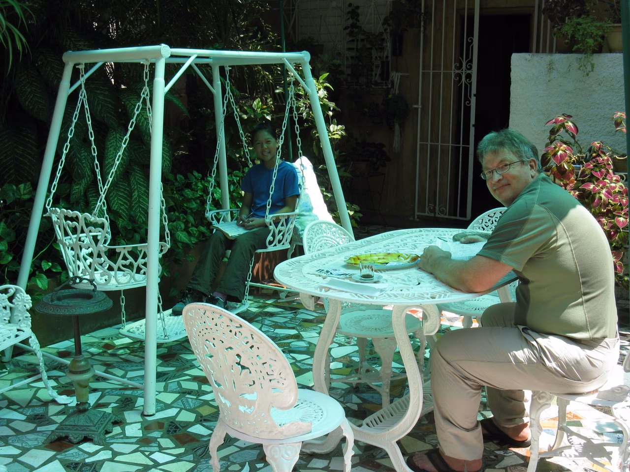 One last morning in the garden of our casa. We had croissant and coffee at the local pastry shop. We went to purchase a few more souvenirs for Victoria. We strolled along the Malecon and enjoyed seeing the waves hit the wall. We arranged for a Coco taxi pickup at 1:30 pm from our casa. We went to eat some more of Victoria’s favorite lunch meal: hot-dogs (peso lunch). After one last visit to the Malecon to watch folks swimming, we headed back to our casa.
