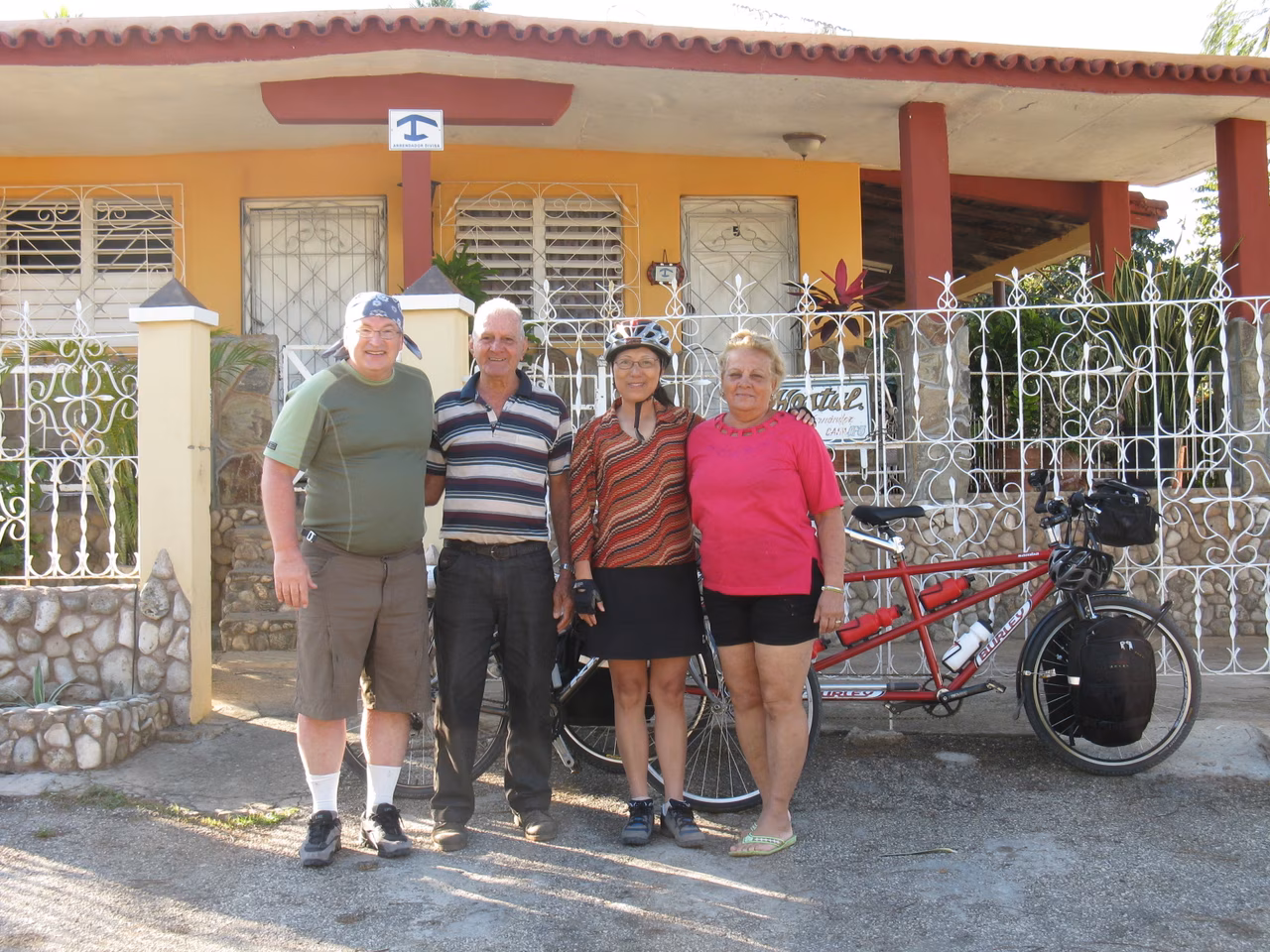 The Cuban custom in Santa Clara was pretty efficient – although our bags and bicycles got quite an inspection. We assembled the bicycles and left the airport. On the road, Jenny got a flat tire. We quickly fixed it and we got back on the road. The public transportation here relies partly on horses and buggy – that leaves a lot of horse manure on the road. Upon arriving in Santa Clara, we went directly to the Cadeca (casa de cambio). We then headed to our target casa (Hostal Florida). Unfortunately the place was full, but the owner was quick to refer us to another casa nearby. We appreciated the comfrot of our new casa. We were all pretty tired. We went to Hostal Florida for supper. We enjoyed some fish and shrimps in a beautiful garden setting. The owner made reservations for a casa particular in Remedios and gave us other recommendations for other towns we’ll be stopping at. Before returning to our casa, we walked around the plaza. We bought several bottles of water today. The rest of the evening was spent reading in our room. Jenny was able to get our washing done in our host’s washing machine.