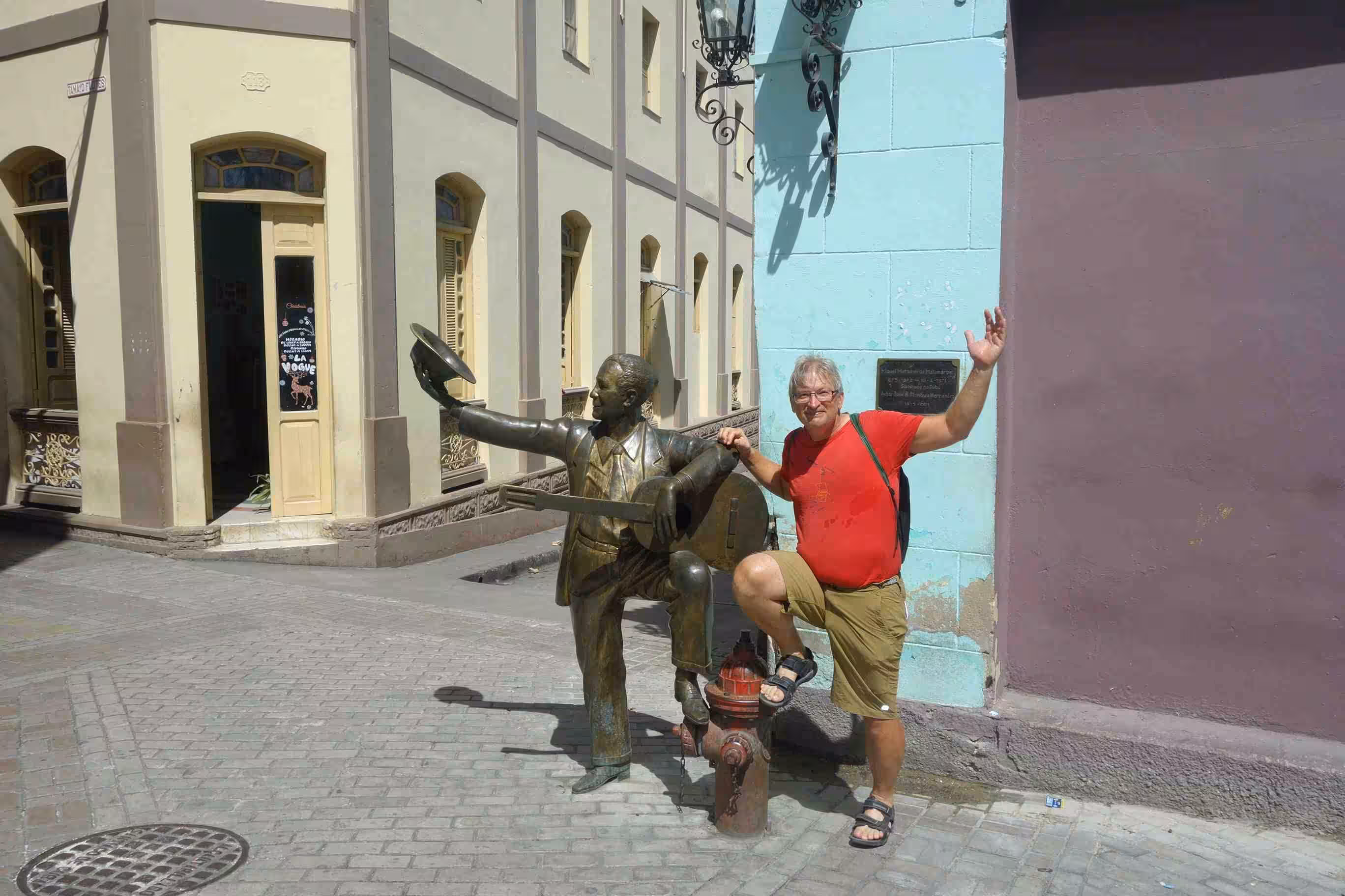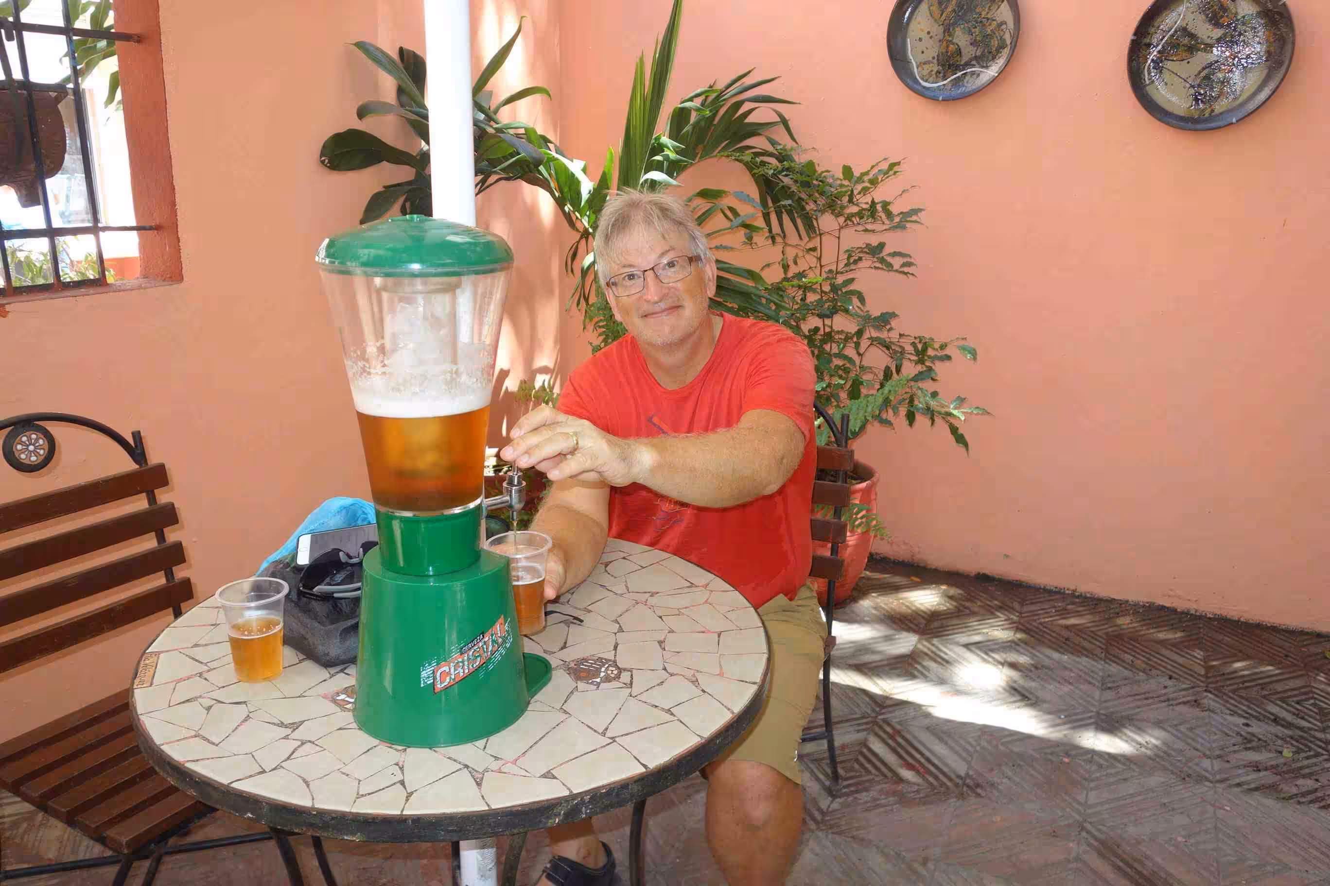 2019.02.26 – [CU] Santiago de Cuba ==> Santiago de Cuba (0 kms | Total: 2125 kms) – After breakfast, we posted our latest blog entry. Later we walked over to the pedestrian street. We stopped at a bank for some additional funds. We located the beer garden that we had visited in 2016 and bought a 1.5 liter beer column to enjoy. While drinking beer, a patron greeted us and introduced himself as the waiter that served us our lunch at yesterday’s town of Chivirico. After purchasing some water and beer, we returned to our casa to relax. We had a repeat of yesterday’s evening meal. After our meal, we walked along the Boulevard (pedestrian street) and had a brief internet session in the park.