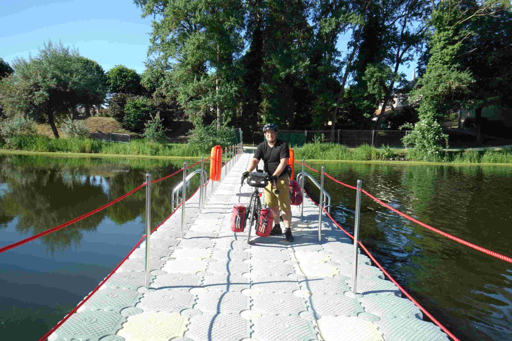 After leaving our hotel, we struggled a bit to rejoin our cycling path as we were confronted by narrow impassable gate and later by closed bridge. Nonetheless, we found our way across a floating bridge.