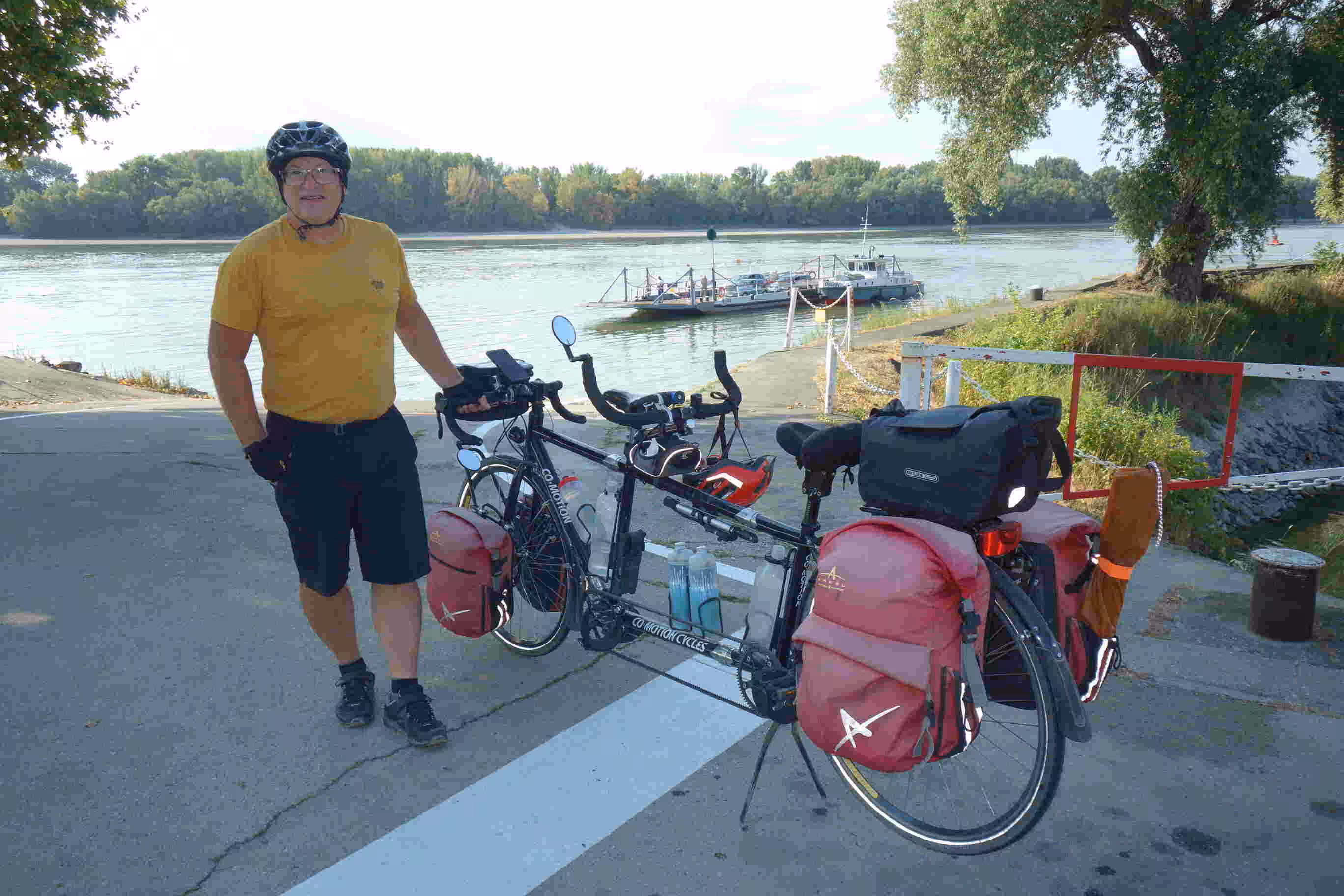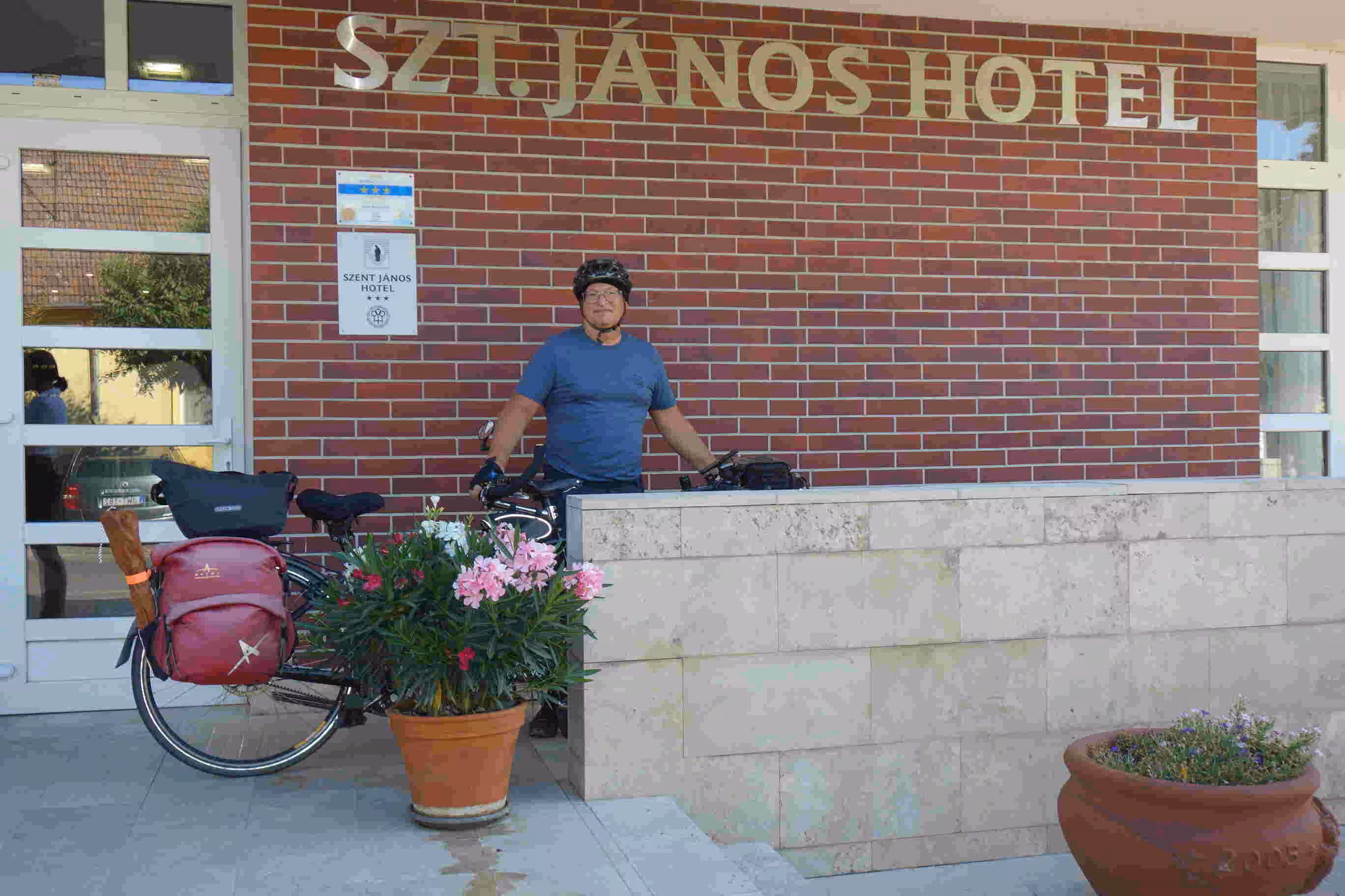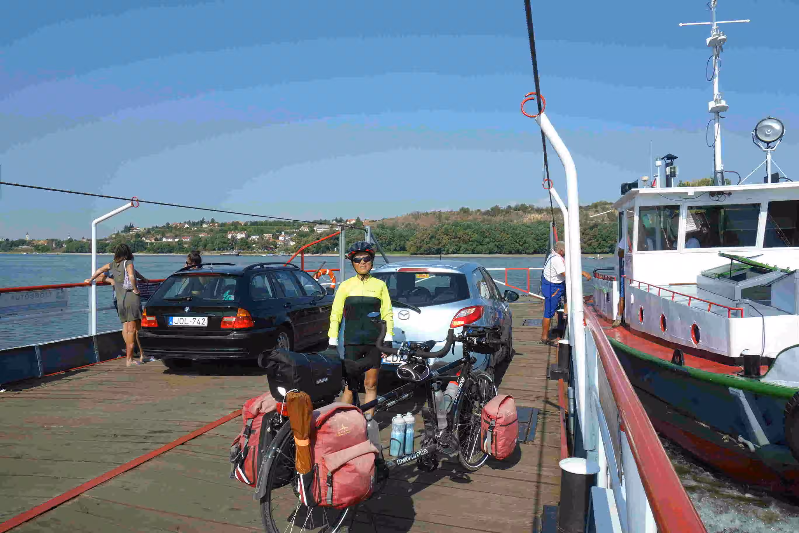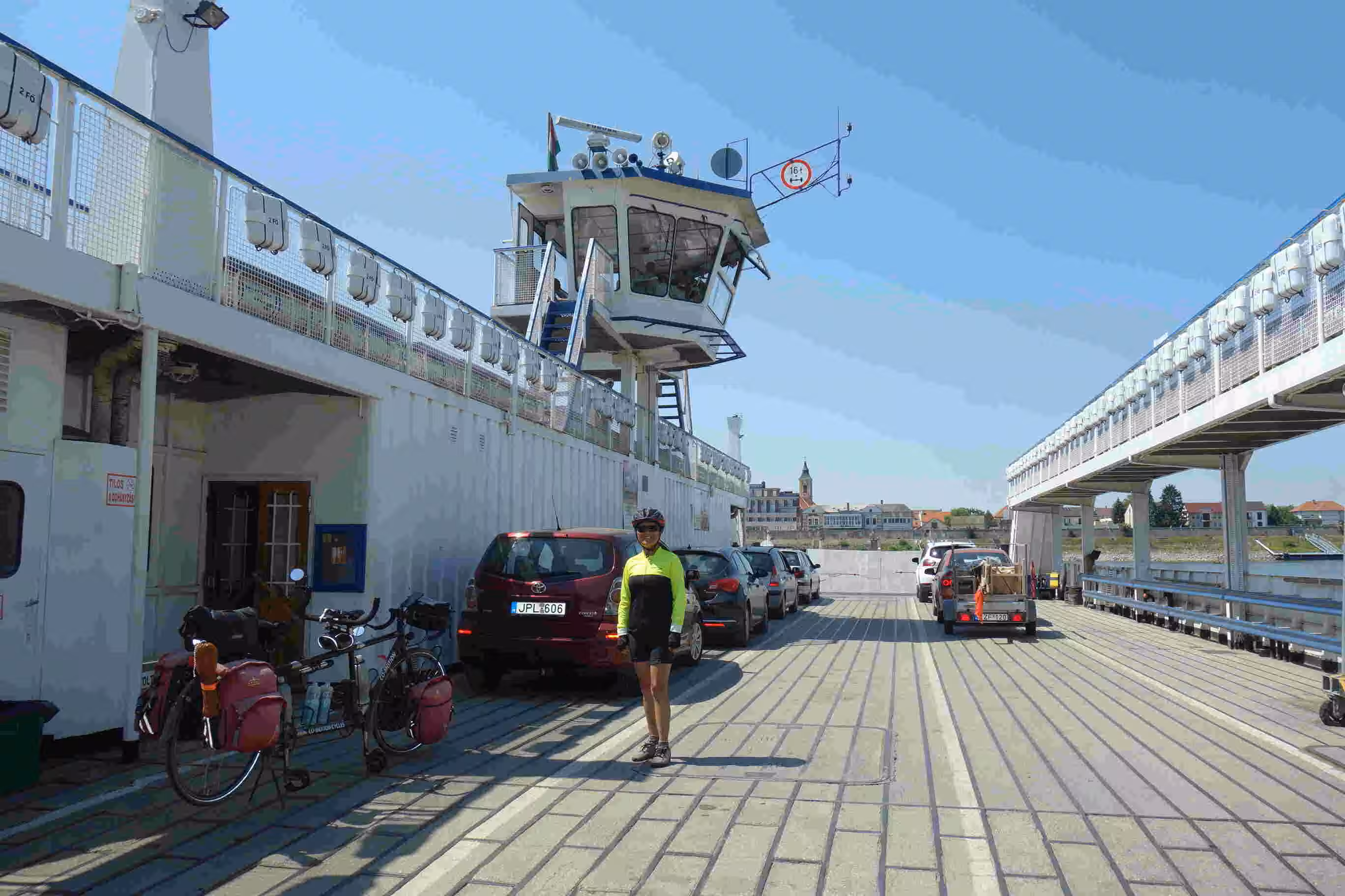 After breakfast we left our hotel and cycled back to the town center for a few pictures. Giving the small size town, we were surprised to have to struggle a bit to rejoin our EV6 route. Shortly after leaving town, we started to cycle atop a level on a gravel road which later changed to a sealed surface. The road appeared to support quite a bit of local vehicle traffic. We managed to ride onto the ferry almost immediately after purchasing our tickets at a booth atop the ramp – unlike most ferries which collected the fees during the river crossing. The hotel registration desk initially pushed back on our early checking request, but they ultimately allowed us in after we returned from the grocery store. In the evening, we visited a number of restaurants before settling on a Hungarian one. Looked forward to a good night sleep to help me recover from a cold I picked up a few days ago.