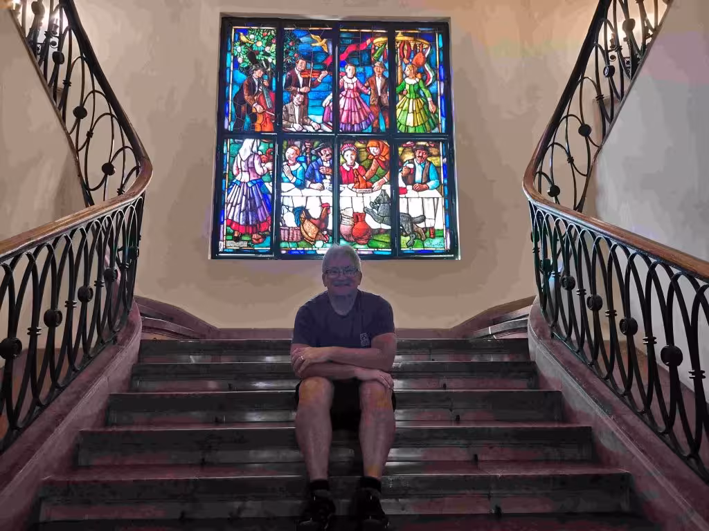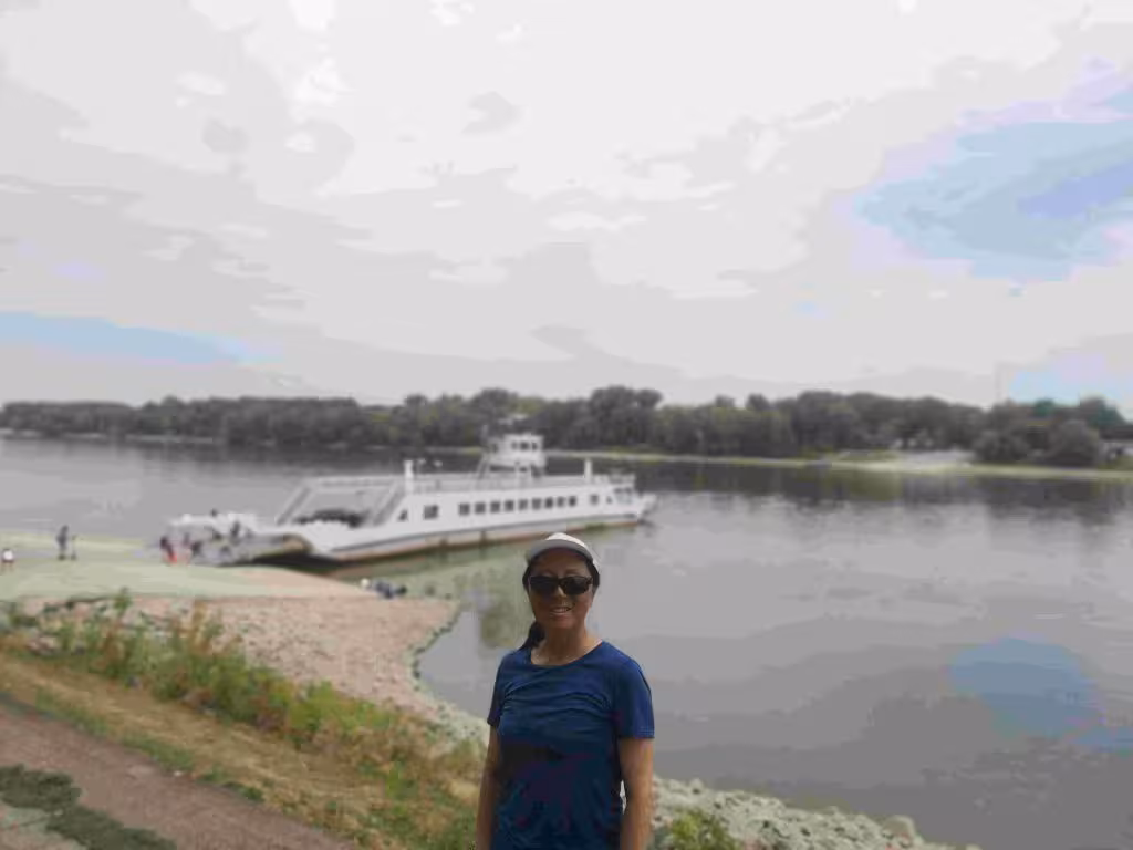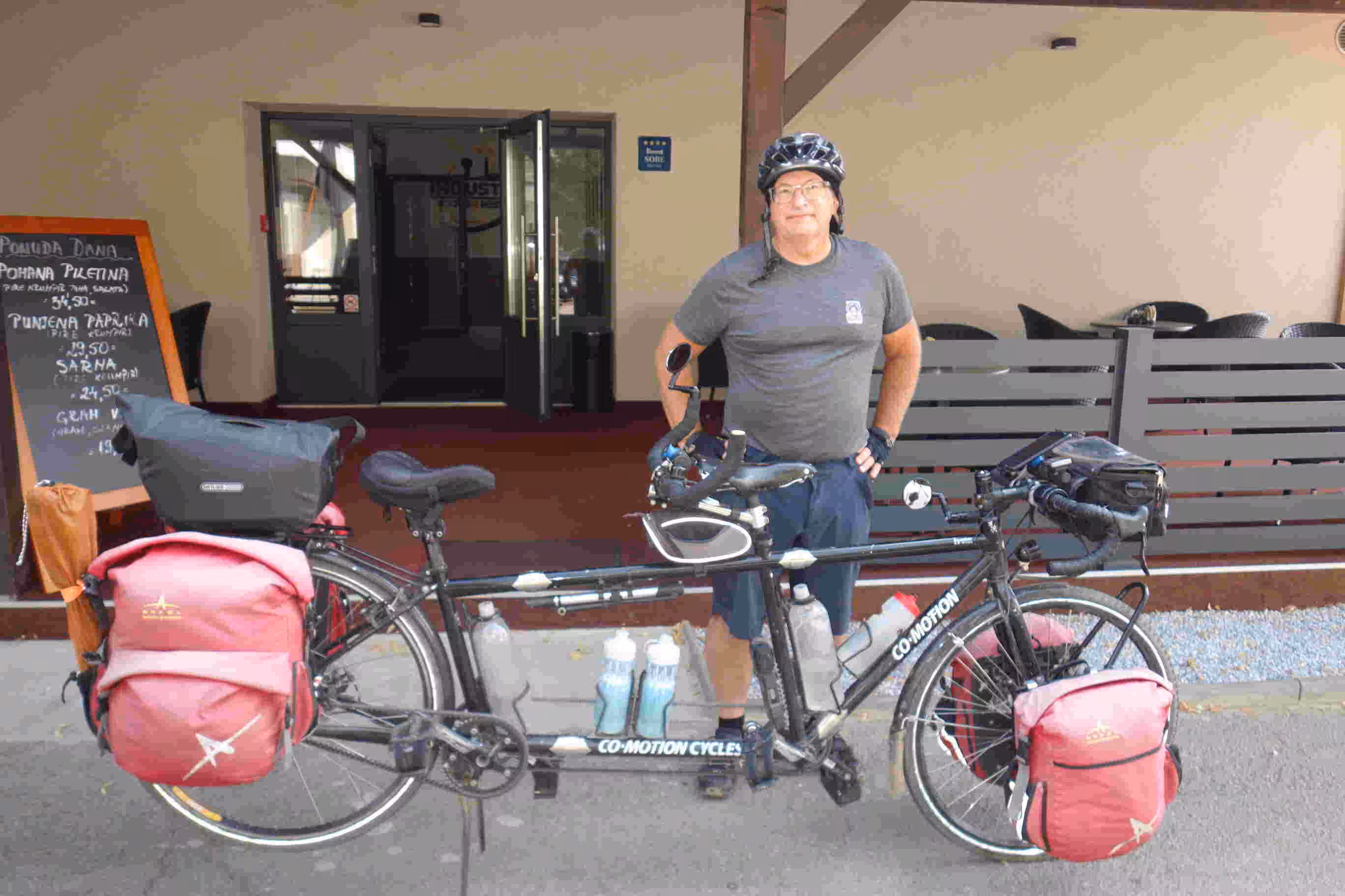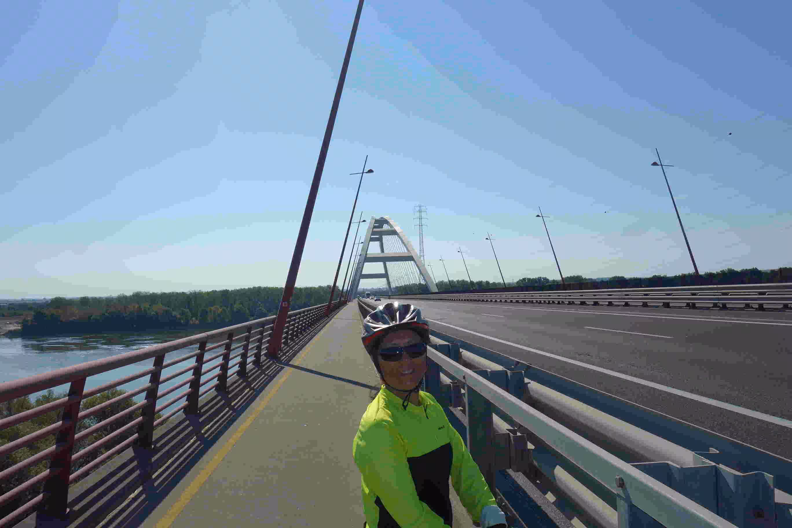 After breakfast we left our hotel and cycled back to the town center for a few pictures. Giving the small size town, we were surprised to have to struggle a bit to rejoin our EV6 route. Shortly after leaving town, we started to cycle atop a level on a gravel road which later changed to a sealed surface. The road appeared to support quite a bit of local vehicle traffic. We managed to ride onto the ferry almost immediately after purchasing our tickets at a booth atop the ramp – unlike most ferries which collected the fees during the river crossing. The hotel registration desk initially pushed back on our early checking request, but they ultimately allowed us in after we returned from the grocery store. In the evening, we visited a number of restaurants before settling on a Hungarian one. Looked forward to a good night sleep to help me recover from a cold I picked up a few days ago.