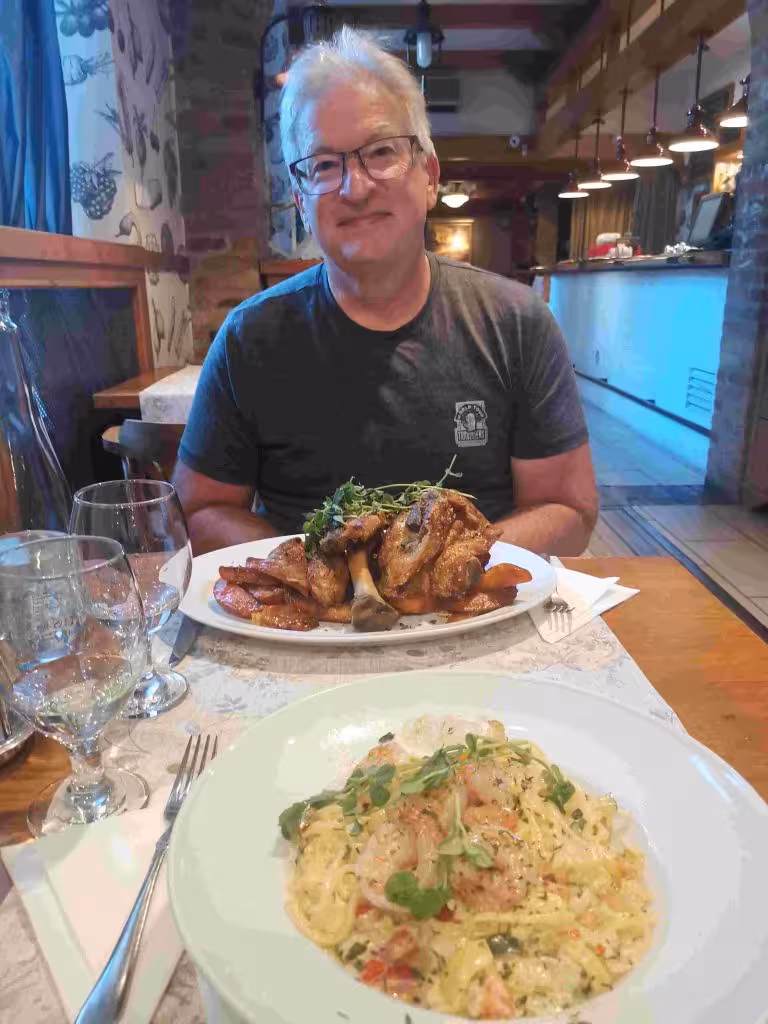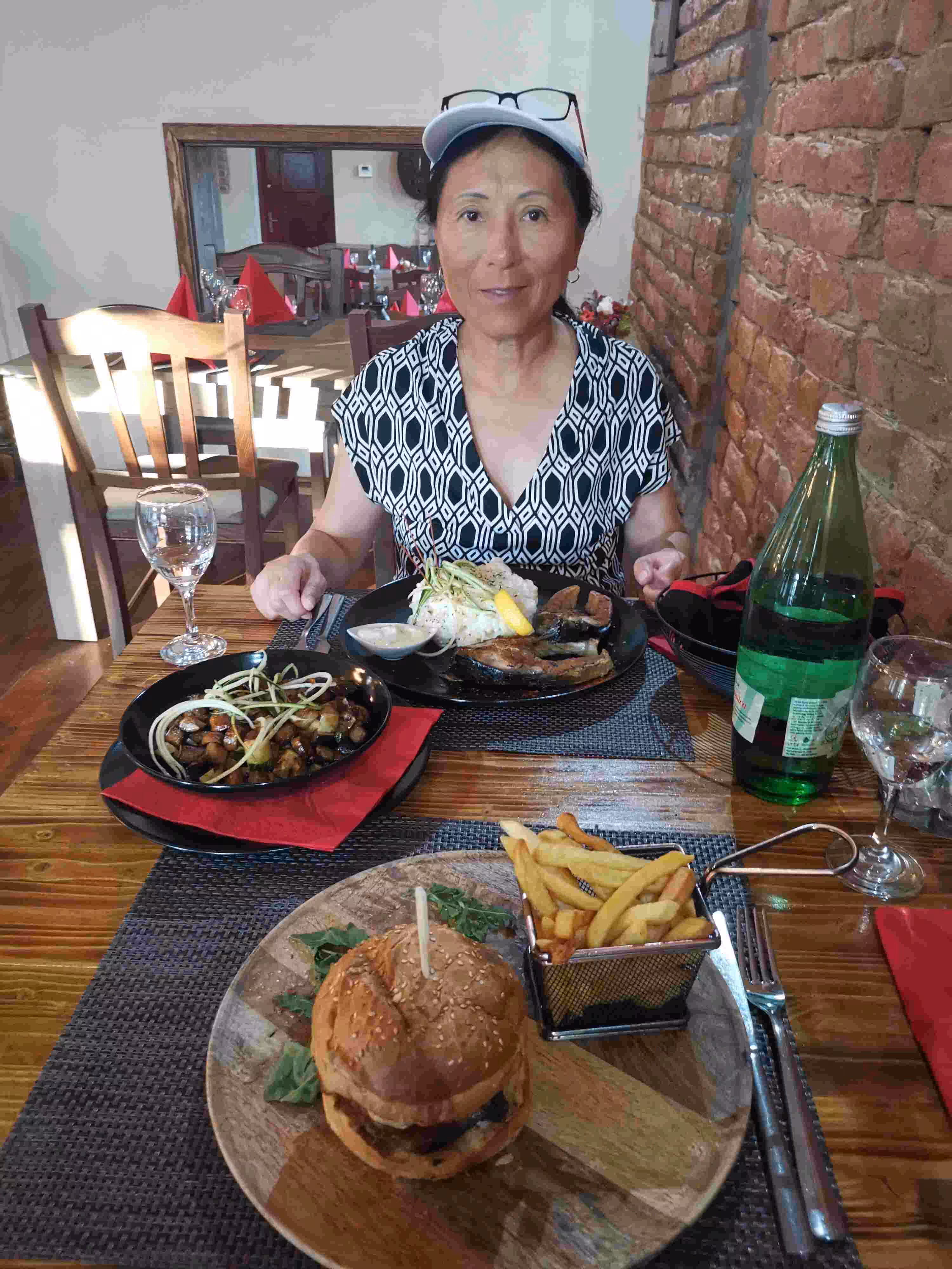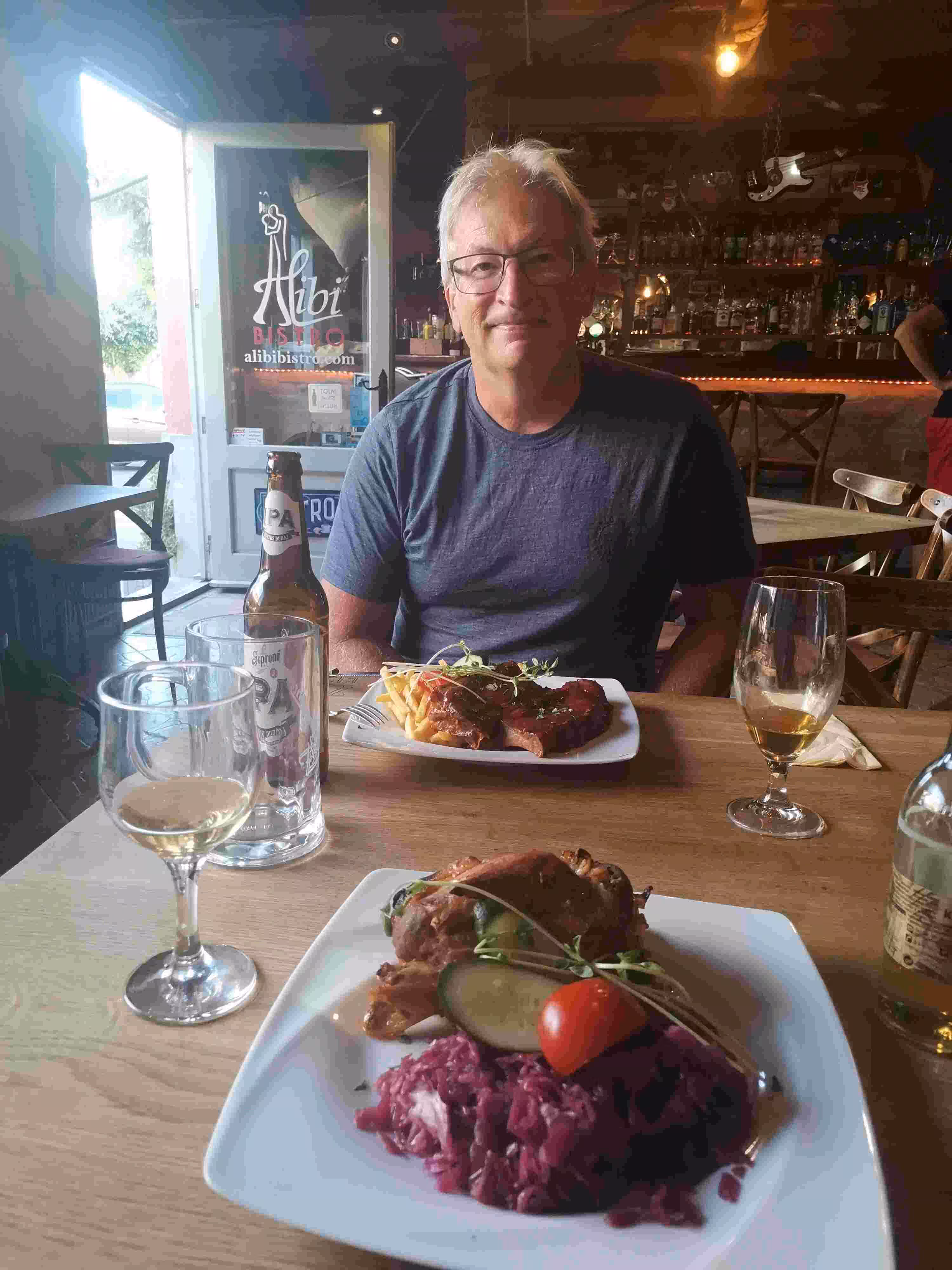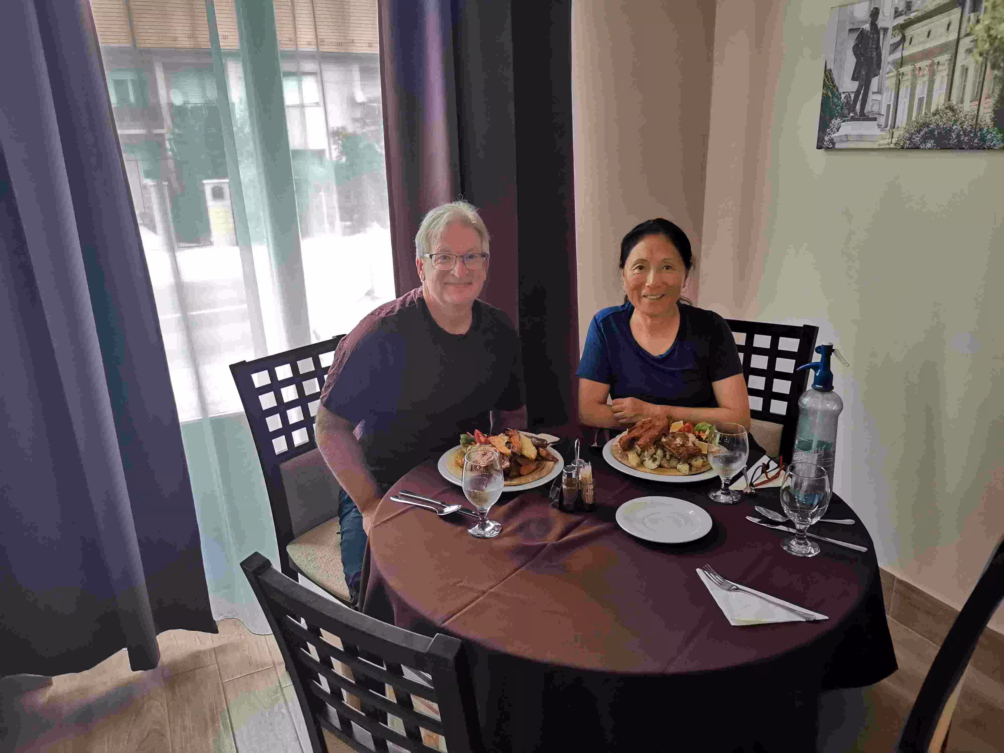 We enjoyed a lazy morning start at our pleasant hotel’s breakfast room. After some relaxing time in our room, we walked over to the grocery store for snacks and beverages. We walked a bit more before returning to our room for rest. Later in the afternoon, I did some bike maintenance. After that we visited a gelato shop and walked other parts of town. In the evening, we had a good dinner at a bistro serving knuckle pork and pork ribs. In summary, we savored slowly our last day in Hungary.