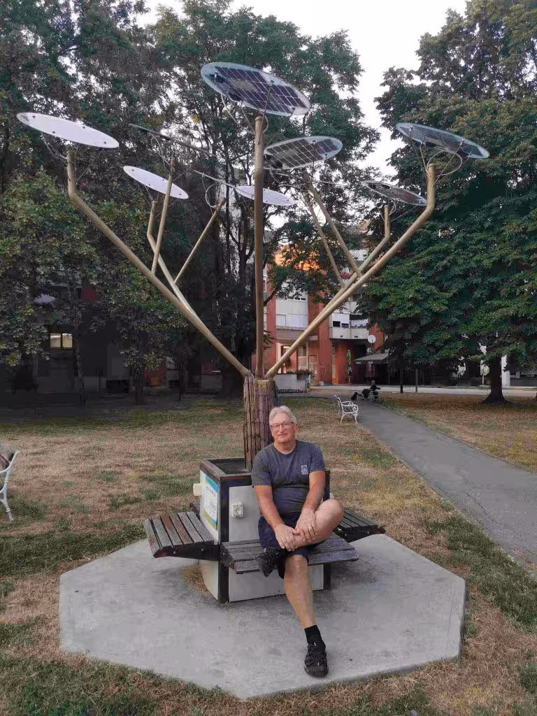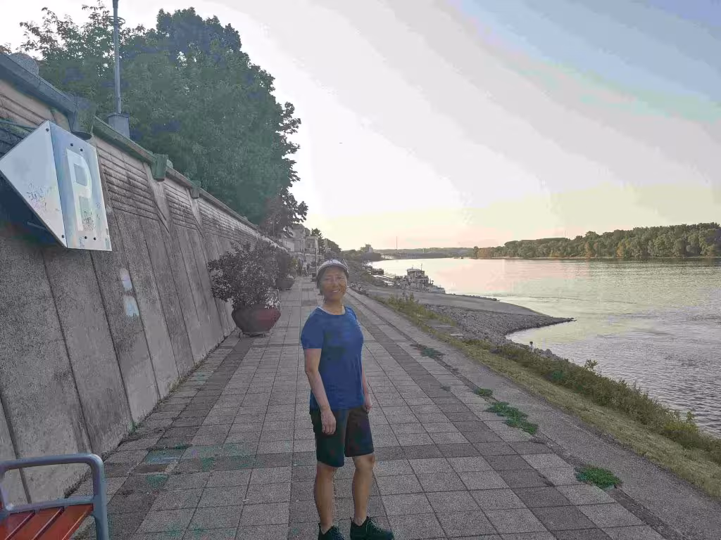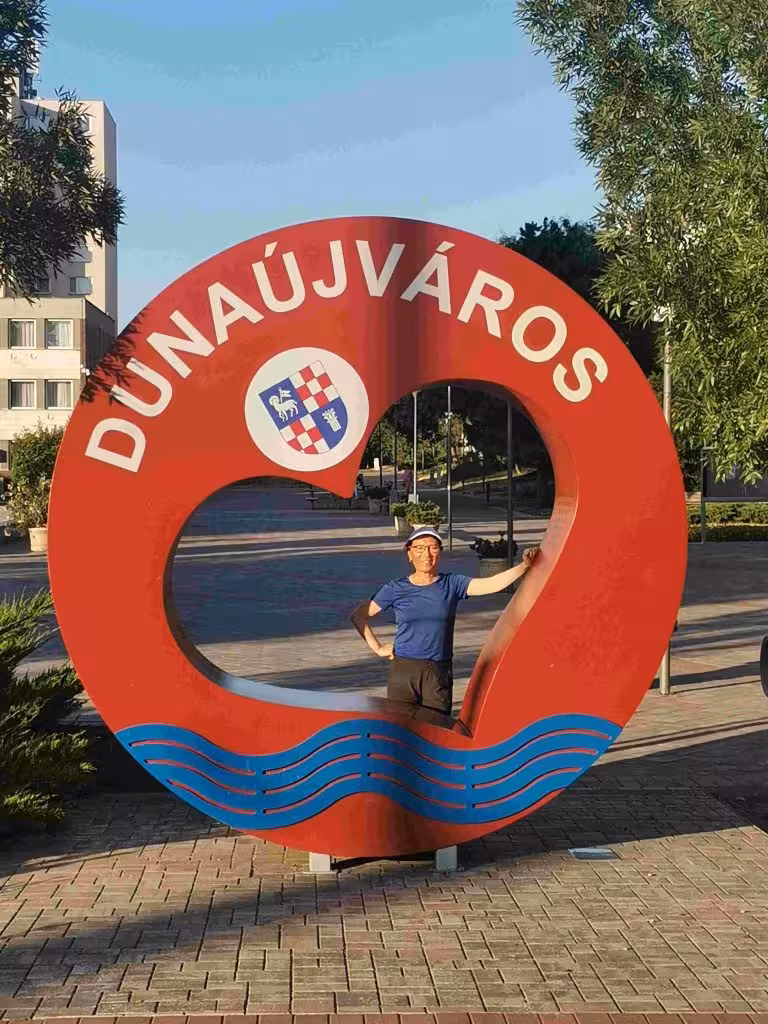 The hotel had their breakfast room setup in the basement. Shortly after leaving town, we crossed the Danube on a very long bridge. We finally rejoined the EV6 route for 15-20 kms after which we crossed the Danube again in order to be on the same side of the river as our hotel in Paks. We cycled through small towns and farmland. The hard part of our journey was the last 6kms where our Organic Maps gps recommended a cycling route away on the busy main road. Sadly, it brought us riding through a cemetery and then uphill over a rugged gravel road. The heat made this stretch even more difficult. Thankfully, we had purchased 1.5l of cold water before tackling this trail. In retrospect, we should have cycled on the busy main road and avoided the climb and difficult terrain. We checked-in into our hotel at 1:15pm. In the evening, we visited a Chinese fast-food restaurant for our dinner