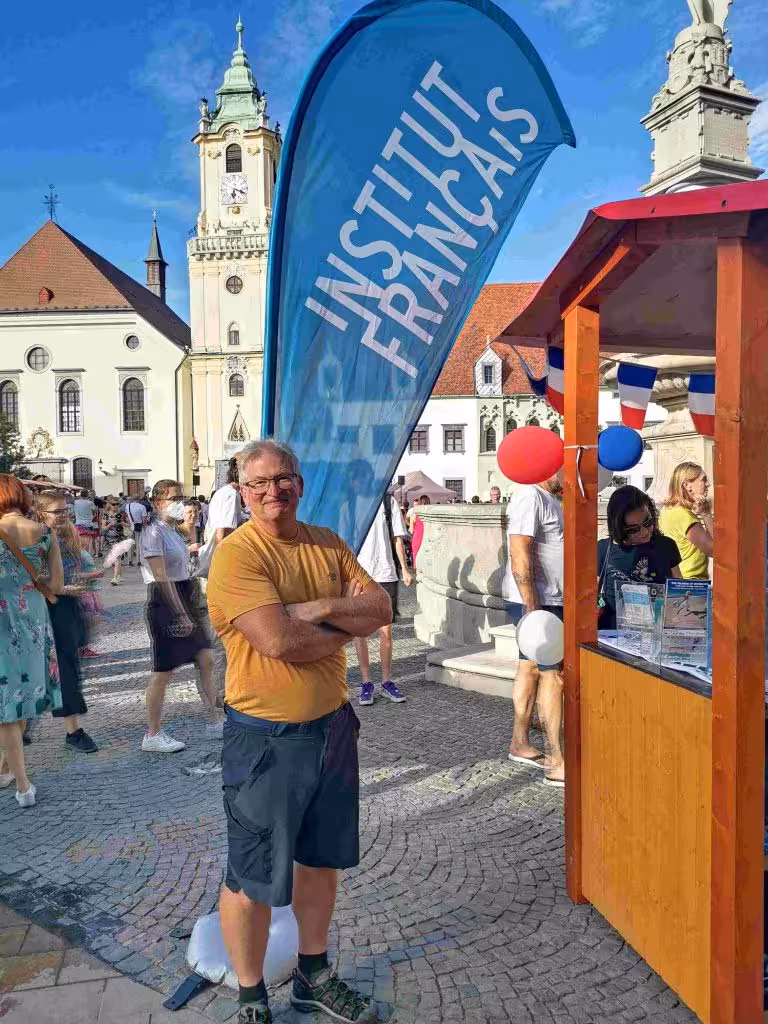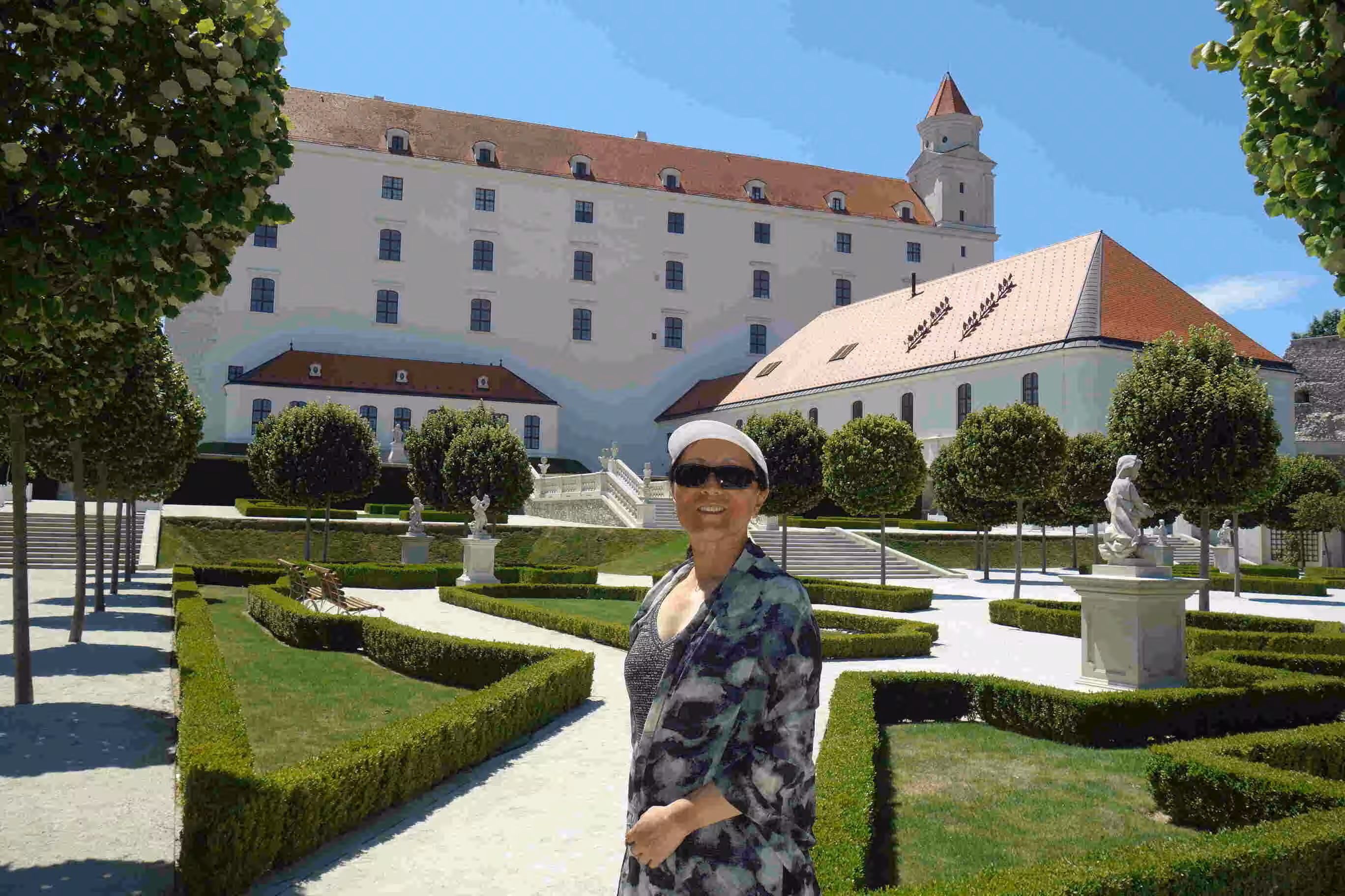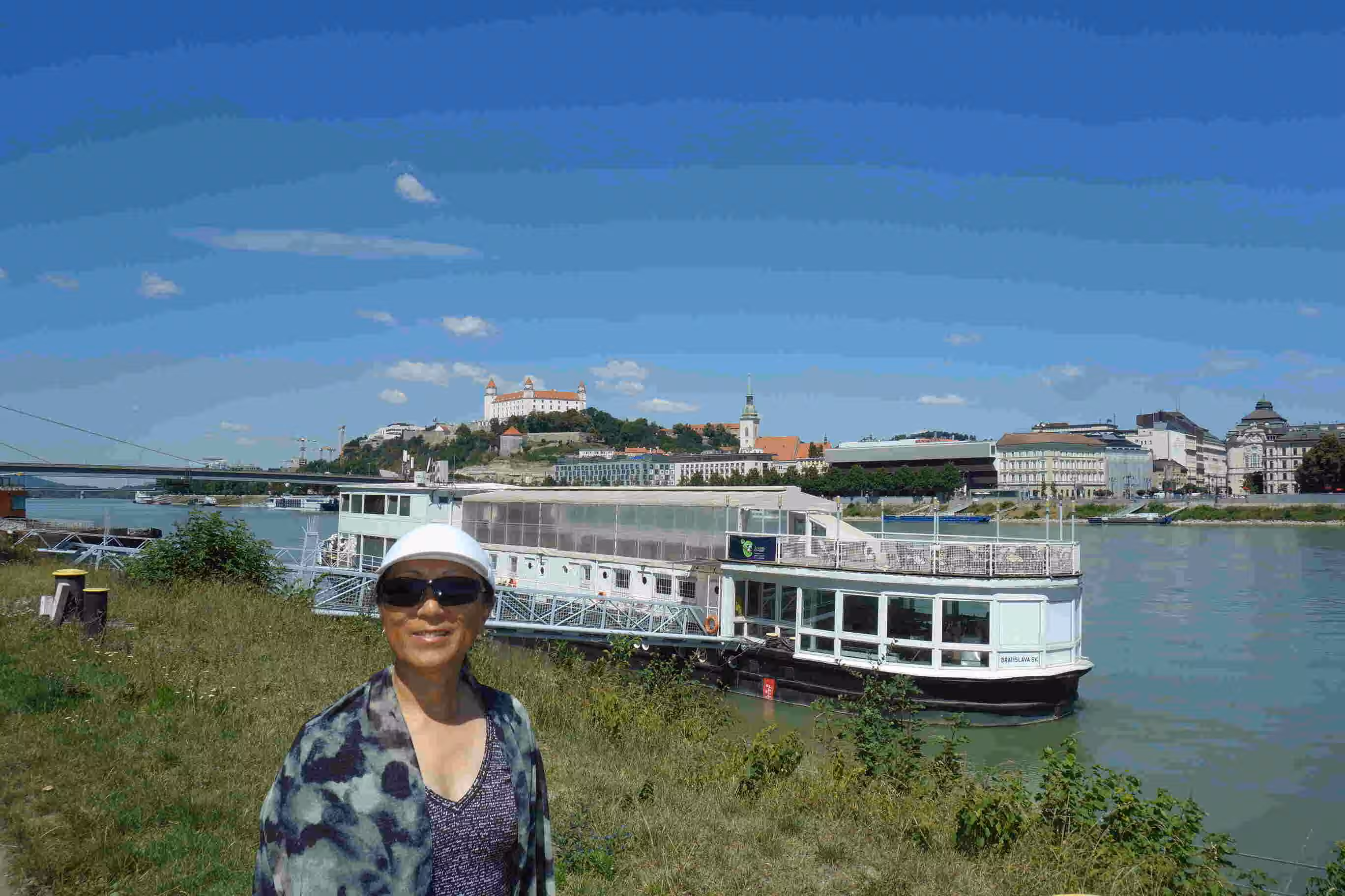 Today was pretty much a repeat of yesterday, but we visited different tourist sites. It was also much sunnier and hotter than yesterday. In the afternoon, I did some tandem maintenance and inspection. Later, we relaxed in the hotel lounge with our complimentary drinks. In the evening, we returned to the nearby Chinese restaurant which we enjoyed on our first night in Bratislava. And finally, we took another long stroll through the lively and pleasant old town. We were initially surprised to hear some French songs being performed on stage, but then we realized it was France’s Bastille Day. The Institut Française in town organized the celebration and sponsored various booth highlighting food, drinks, technology from France. We treated ourselves to some expensive gelatos. Overall, we enjoyed our time in Bratislava a lot more than in the overwhelming touristy city of Vienna. (Walked 10kms).