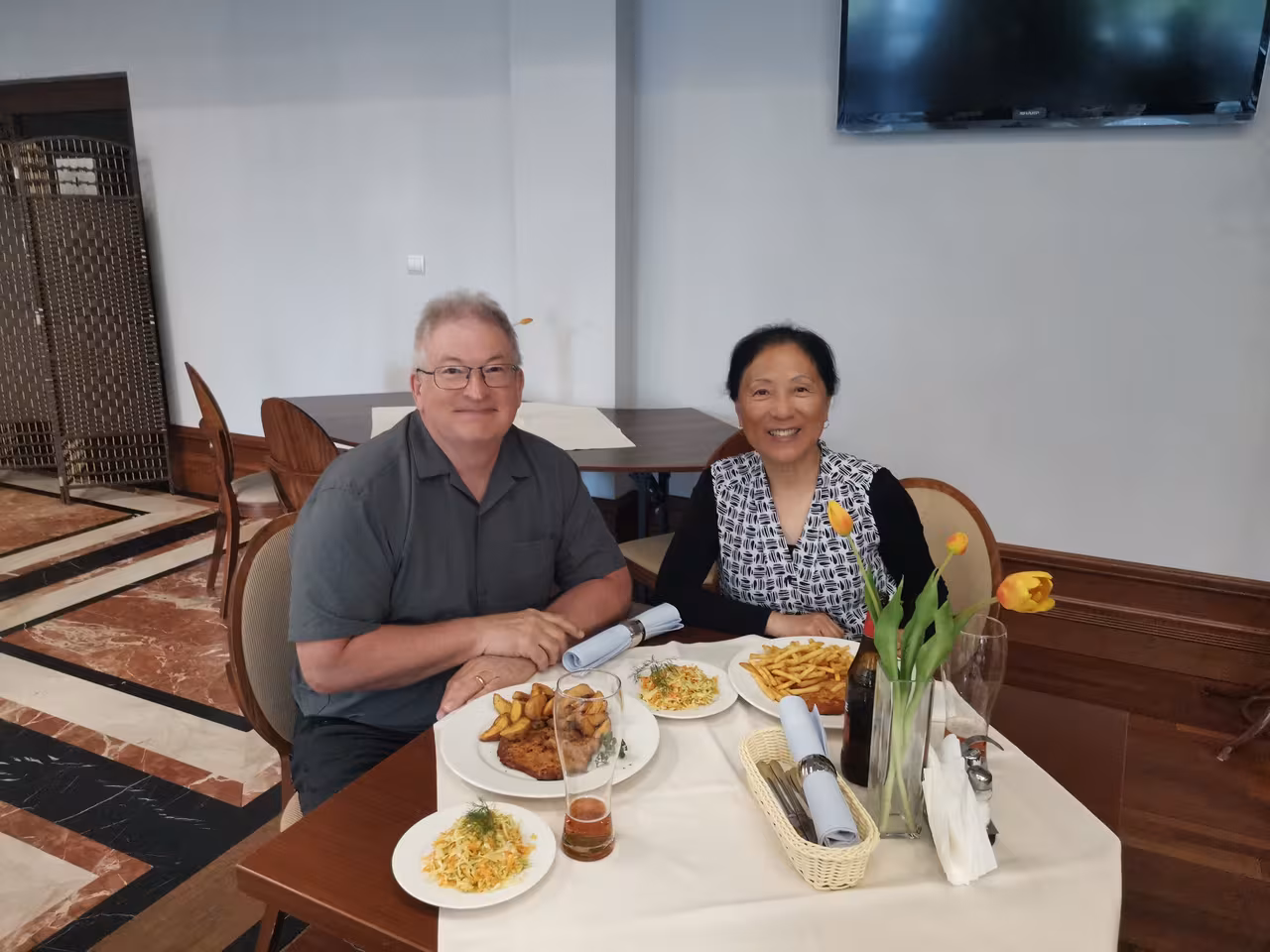 We both had a very deep night sleep. Jenny prepared a good breakfast. We brought down the tandem from the apartment to the outside before loading our panniers and cycling out of town around 10am. As we had spent a lot of time last evening looking at different road surface conditions, we opted to stay on the main roads today while knowing there would be more traffic to worry about. The cycling was generally enjoyable as we benefited from a tail wind for a good part of our journey. We arrived in our destination town by 2:00pm. Our modest guest house room felt cold. Although we had access to a shared kitchen, we opted to have dinner at a local pizzeria for some so-so pizza. Another German cyclist was also staying at our guest house.