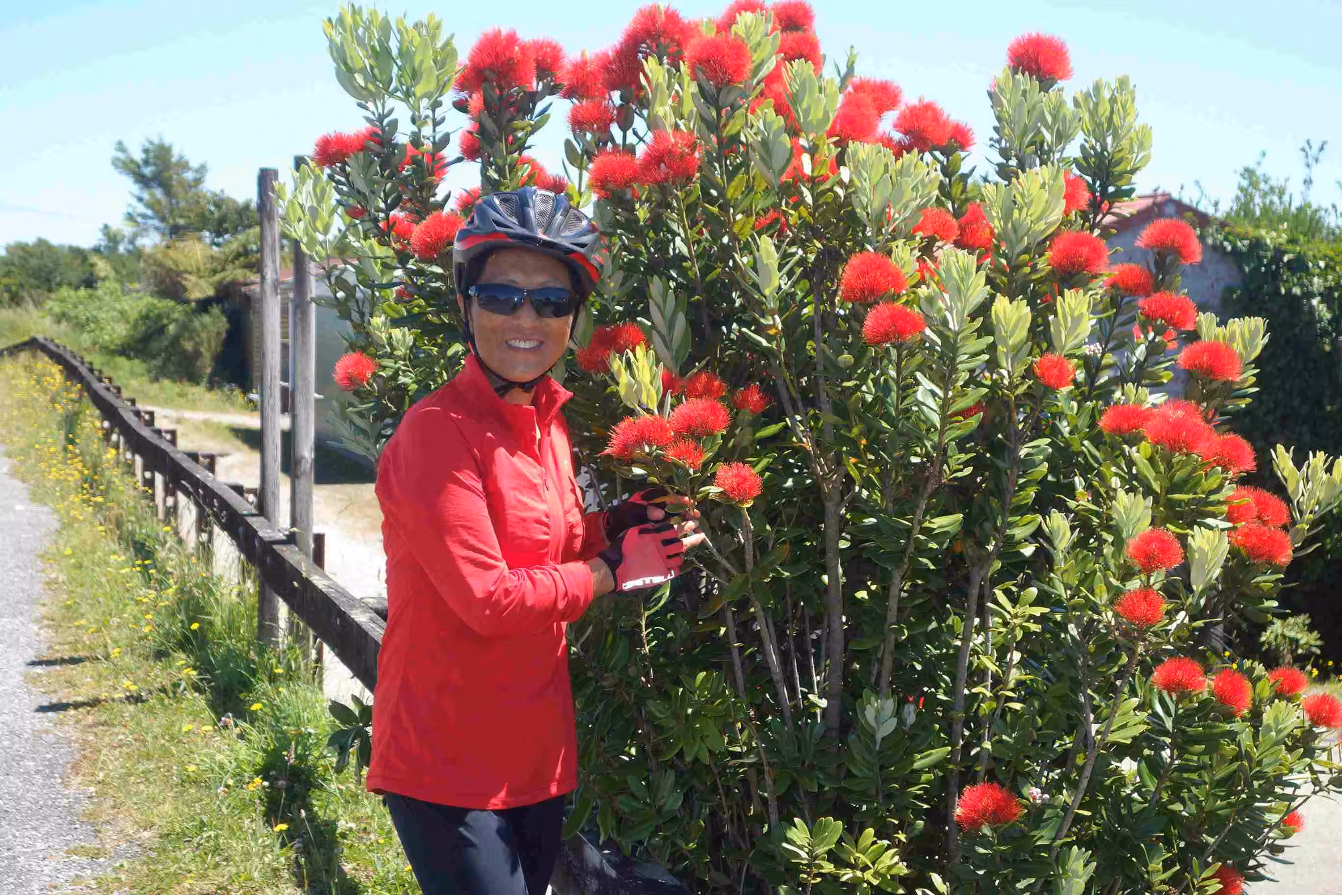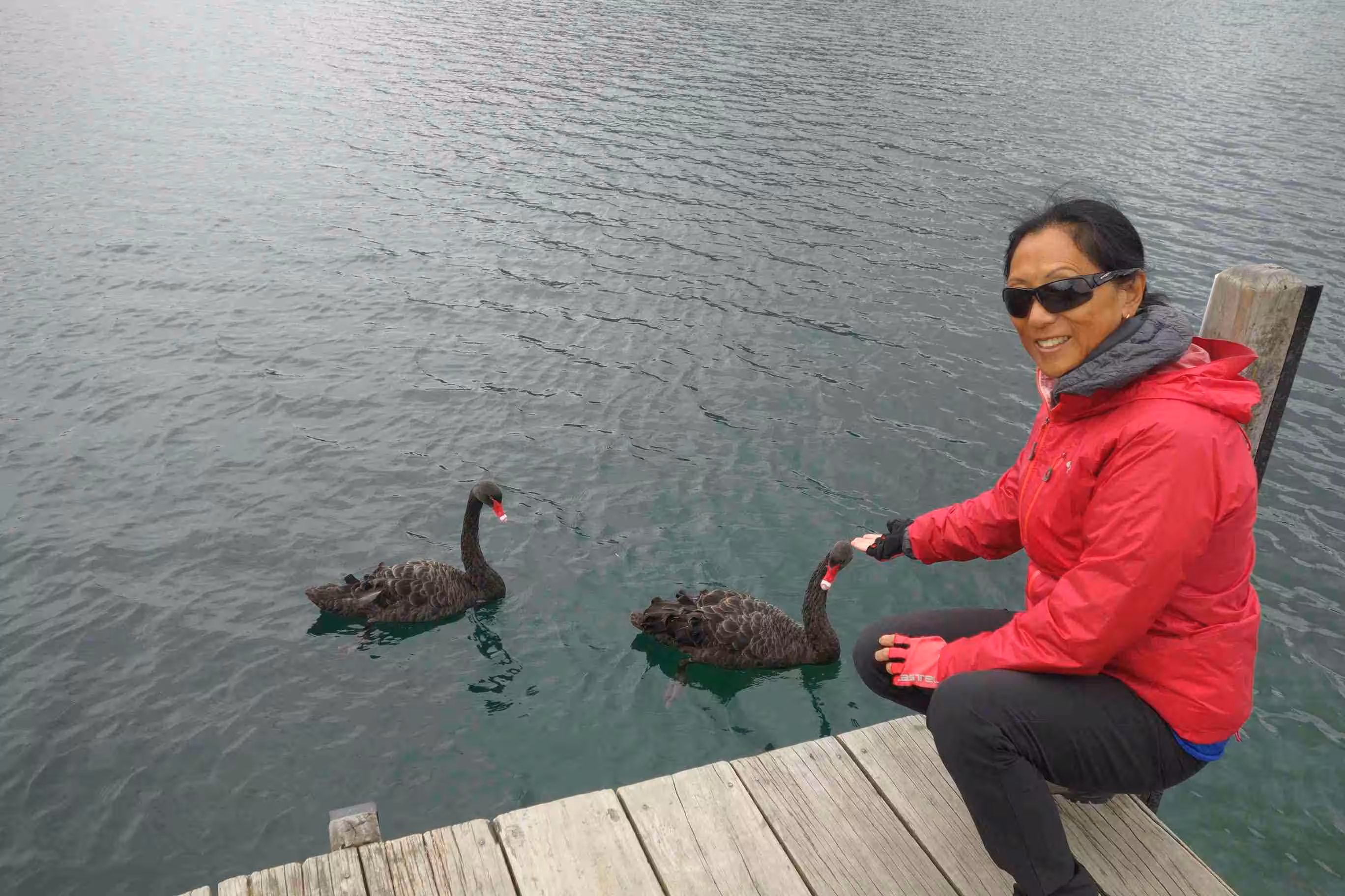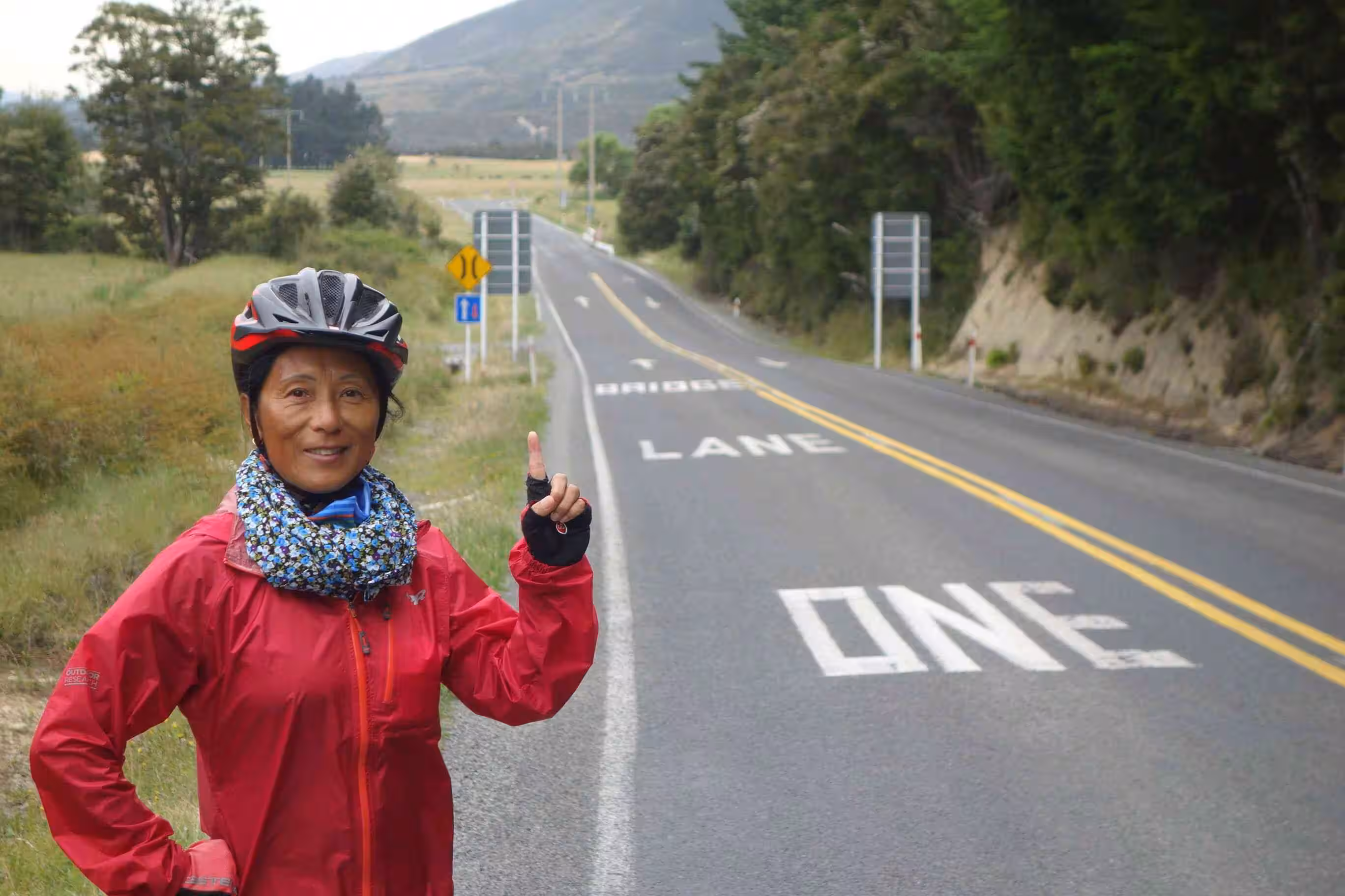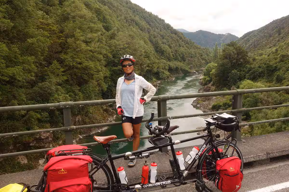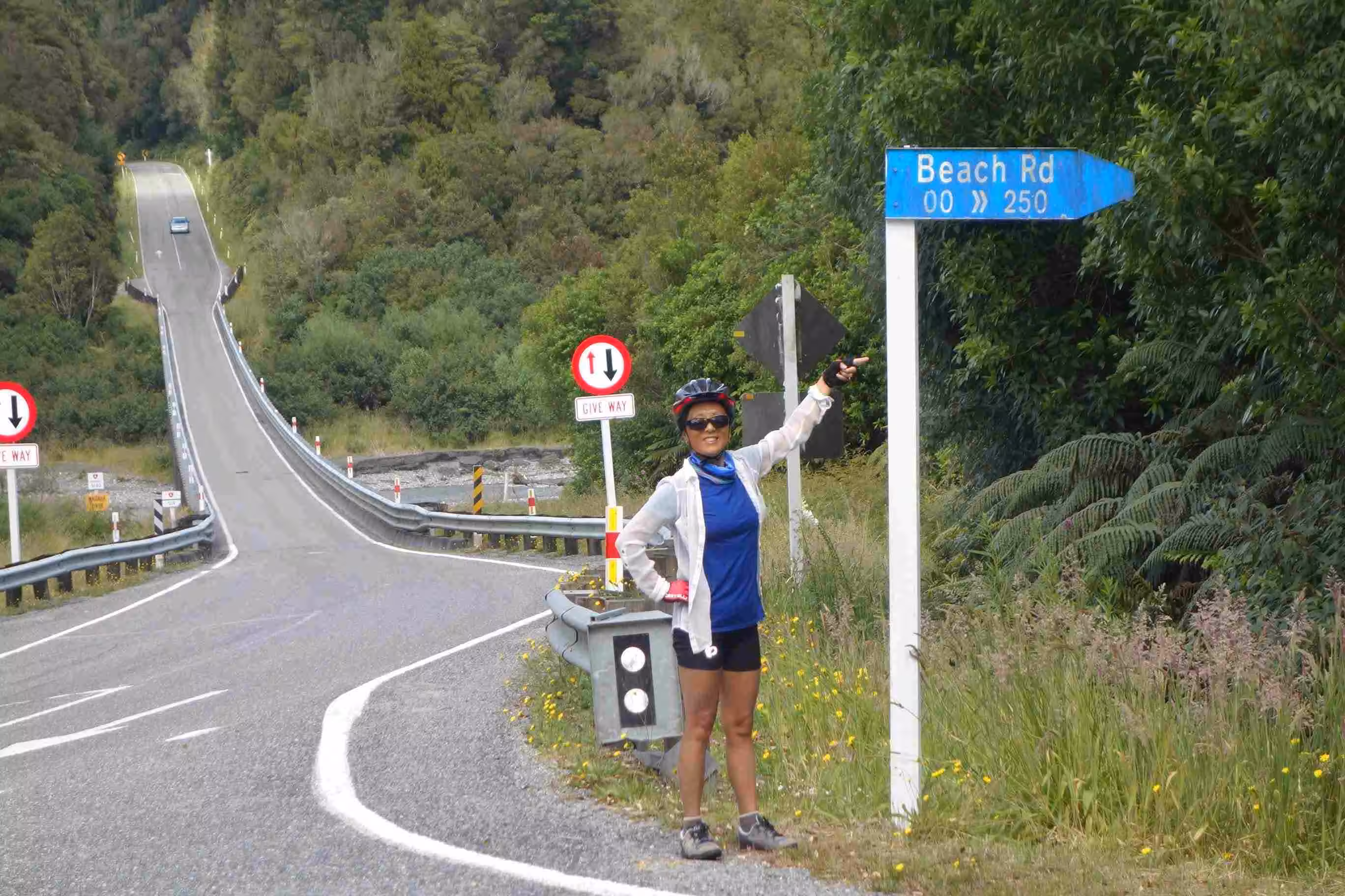 2017.12.19 – [NZ] Saint Arnaud ==> Wairau Valley (69 kms | Total: 2234 kms) – As we missed our visit to the lake-shore yesterday, we set out this morning, with the unloaded tandem, for a short visit. We snapped a number of nice pictures before we returned to yesterday’s café for our breakfast. We were quite pleased to discover that the wind had completely changed direction. Today’s cycling conditions were among the best we had encountered on the south island – cloud cover, continuous downhill road over 60kms and a hefty tail wind – one of the few times we got to enjoy it. We covered our cycling day’s distance in record time. We snapped a picture of the “one lane bridge” road sign which we estimated having crossed between 100 to 200 such bridges during our cycling on the south island. Along the way we met a couple from Australia (Michael and Ly) cycling in the opposite direction. We really felt empathic for them as they had to tackle both a strong head wind and a steady climb. We were not sure what to expect as we checked into our cabin accommodation at a Naturist (aka Nudist) campground. It appeared that the rather cool weather kept many folks mostly dressed. Jenny was not sure she liked the double showers – at least not the one without doors. We went for our evening meal at the nearby tavern where, exceptionally, the business did not accept any credit cards. As we were very low on NZ dollars, we had to use some of US funds to partially settle our food tab.