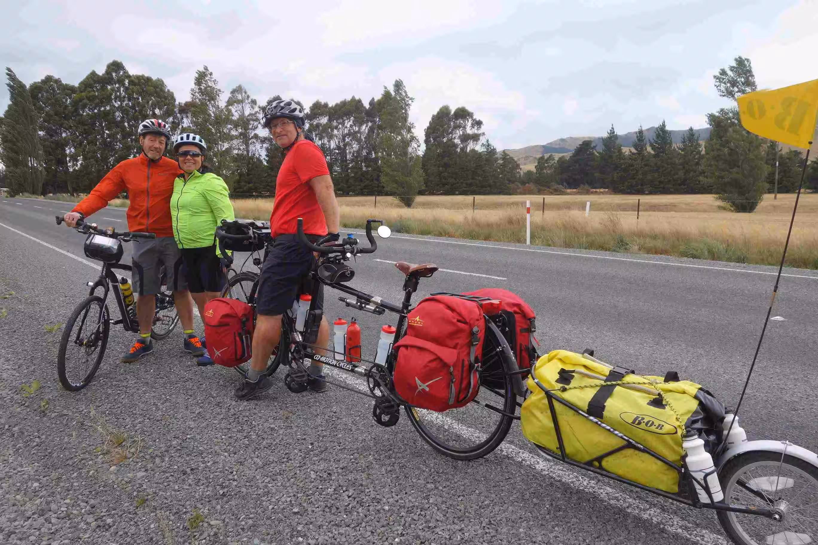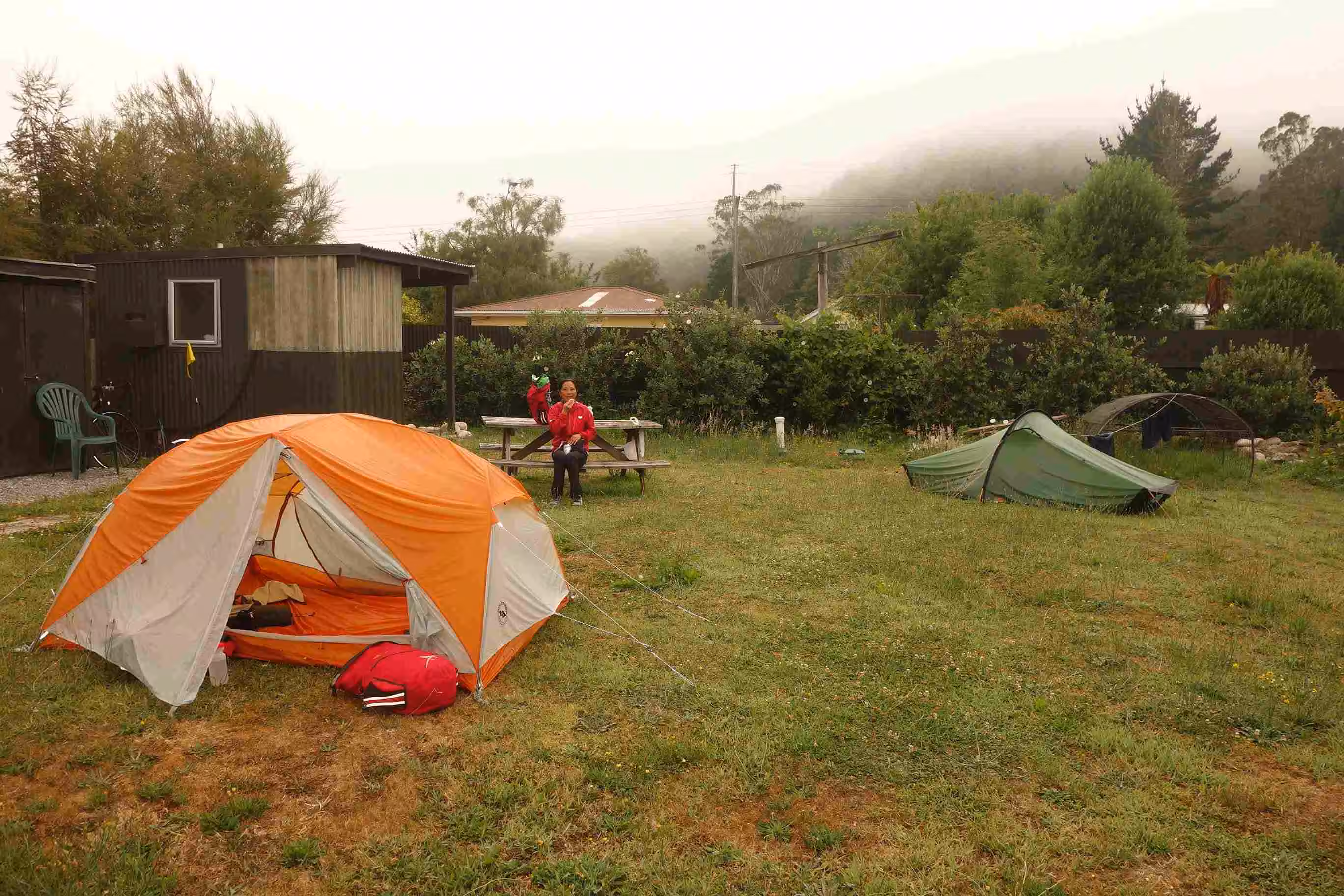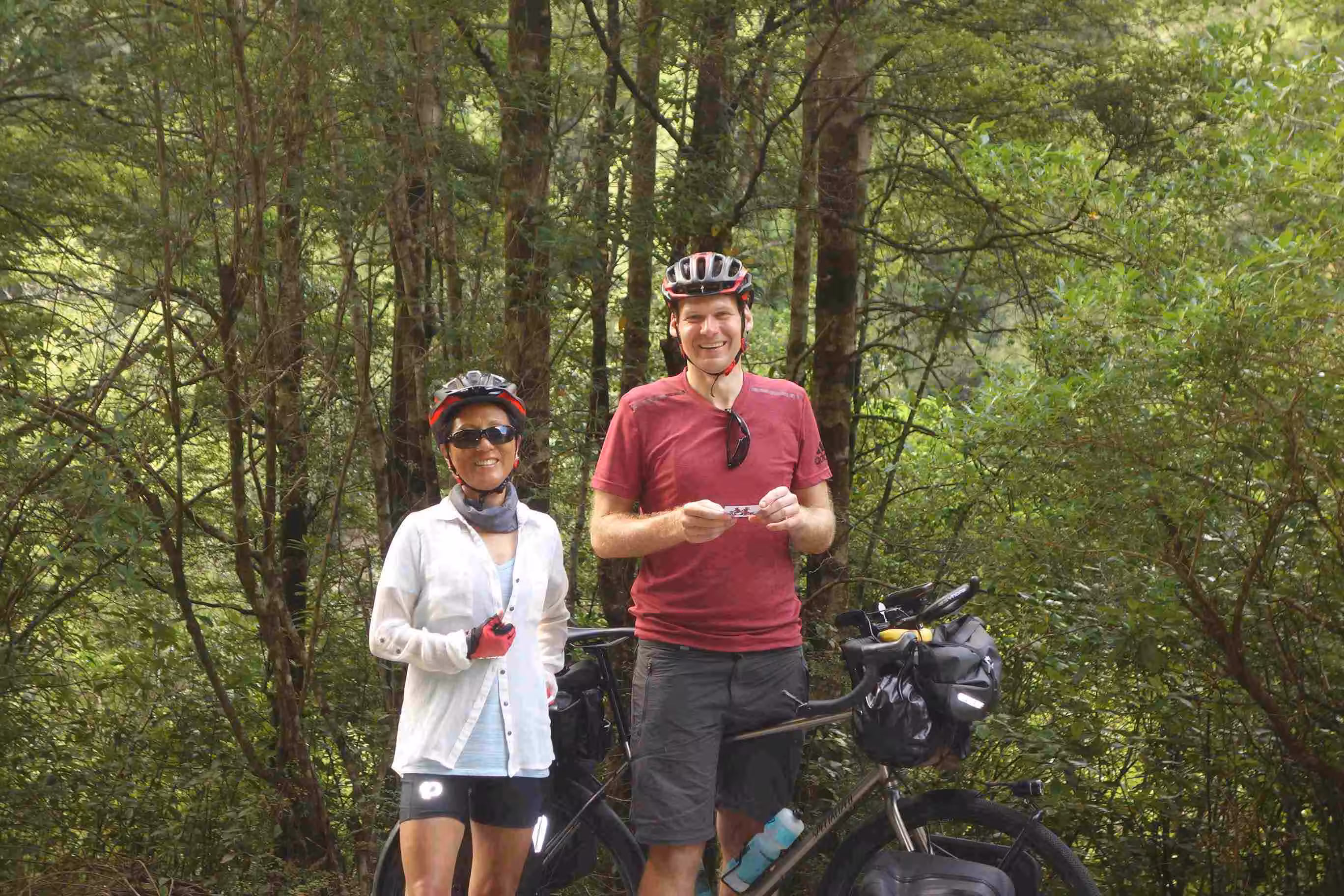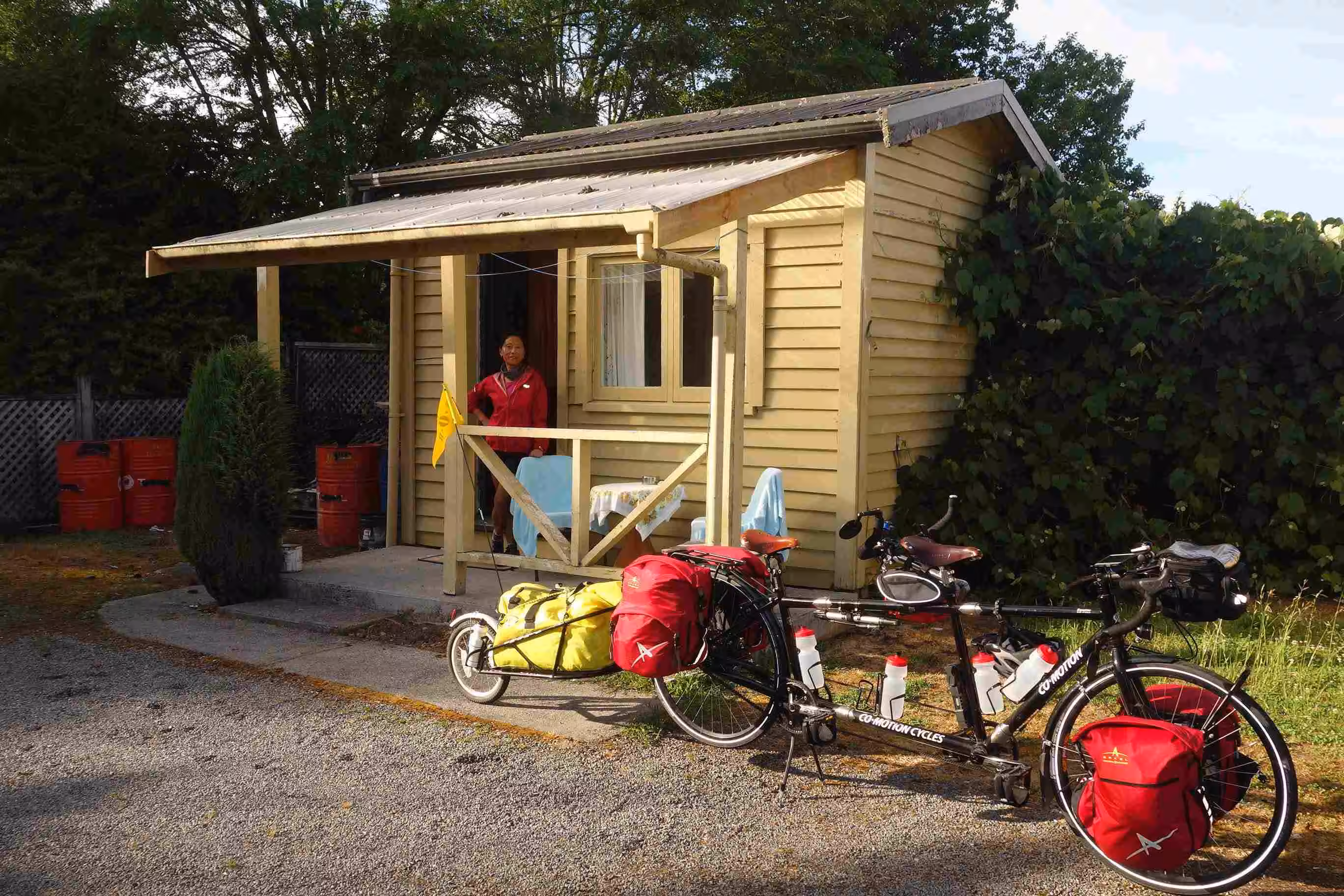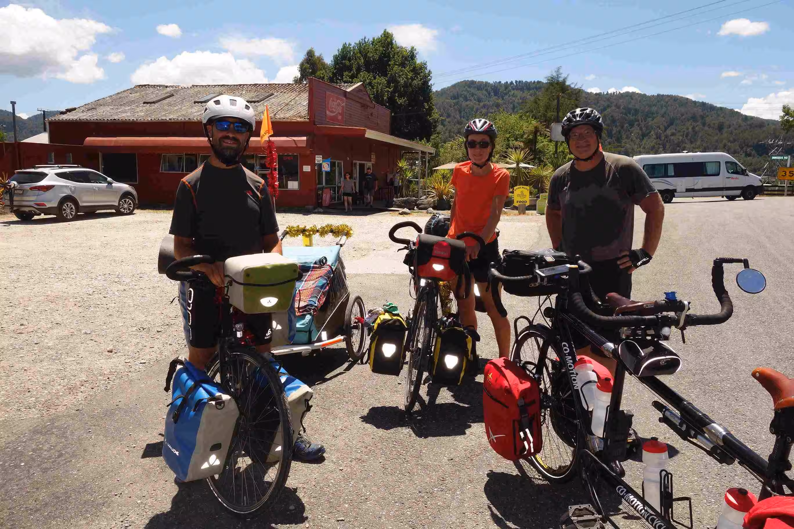 2017.12.16 – [NZ] Ikamatua ==> Inangahua (63 kms | Total: 2052 kms) – We had some yogurt and oranges for breakfast with the hope that we could have a more substantive breakfast in Reefton some 27 kms further. The cycling to Reefton was enjoyable. As planned, we had a good breakfast in one of the town cafés. Before leaving town, we bought some groceries for our evening meal as we did not know whether we would find any other supplies on the road. Upon arriving in Inangahua, we stopped at the backpacker accommodation to see whether any rooms had become available. We learned that the owner was hosting a large group the next day for a celebration of some sort and hence she could not accept anyone because of her preparation. As we found the camping lot just across the local café/grocery store, we met our second cycling couple, on our trip, that were pulling a one-year old baby girl in a trailer. During our chat mostly in French, the France couple found my Quebec accent rather amusing. At the camping lot, we parked the tandem and opted to walk back to the general store/café before setting up our tent as the sun was still shining strongly. The café owner was nice enough to provide us with wifi access as our data access was no longer working in this area – unfortunately the café closed at 3:00pm. The owner of the camping lot came over to the café to collect their camping fee. The camping lot was actually part of a white water rafting business. Some locals were washing clothes in their washing machine that had been installed at the camping lot as their own home did not have any electricity! Back at the camping lot, we met a single lady from the Netherlands that had been hiking over the past few weeks and was stuck for the night in Inangahua waiting for a bus ride. We took turn using the single shower stall. We noticed that our camp mate lady took a very long shower but we learned that it was her first one in eight days. We chatted about our respective travel experiences in NZ and shared a meal with her on the lonely picnic table. It was the first time on our trip that we actually used our own cooking stove to prepare a meal. The sand flies were Jenny’s biggest concern – rightfully so. We walked to the café to see whether the wifi was still accessible as we had taken a picture of the password – unfortunately the receiver must have been turned off. We slipped into the tent before sunset as it was our sole refuge from NZ notorious sand flies.