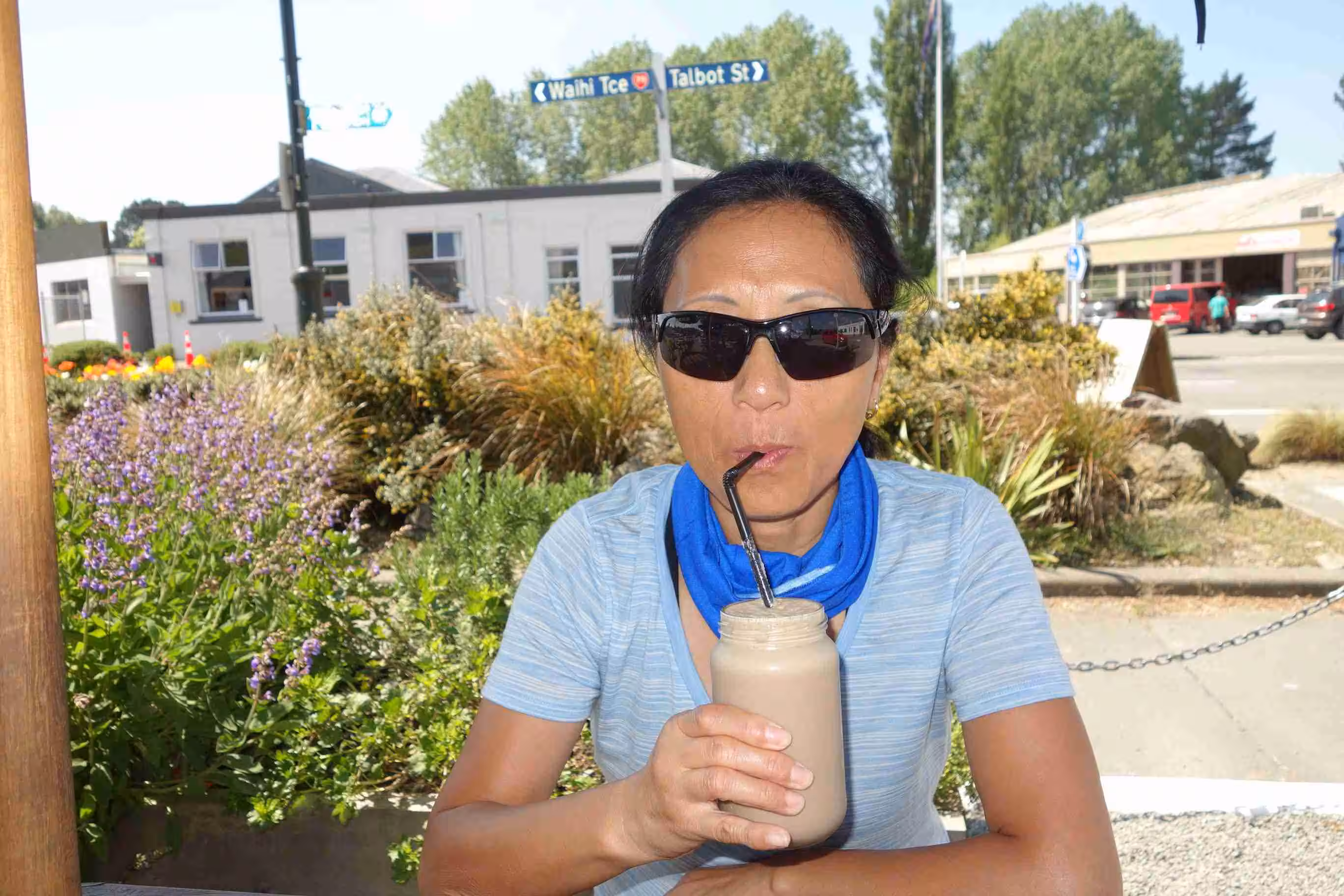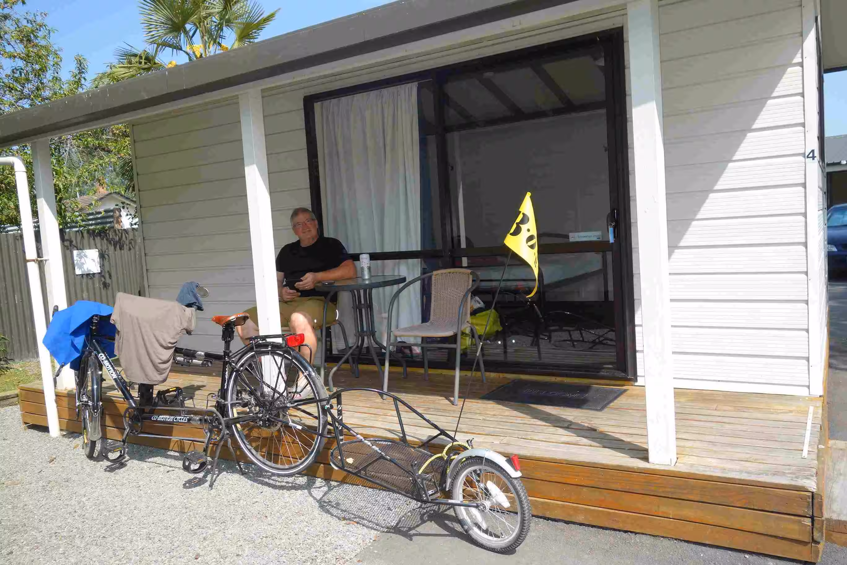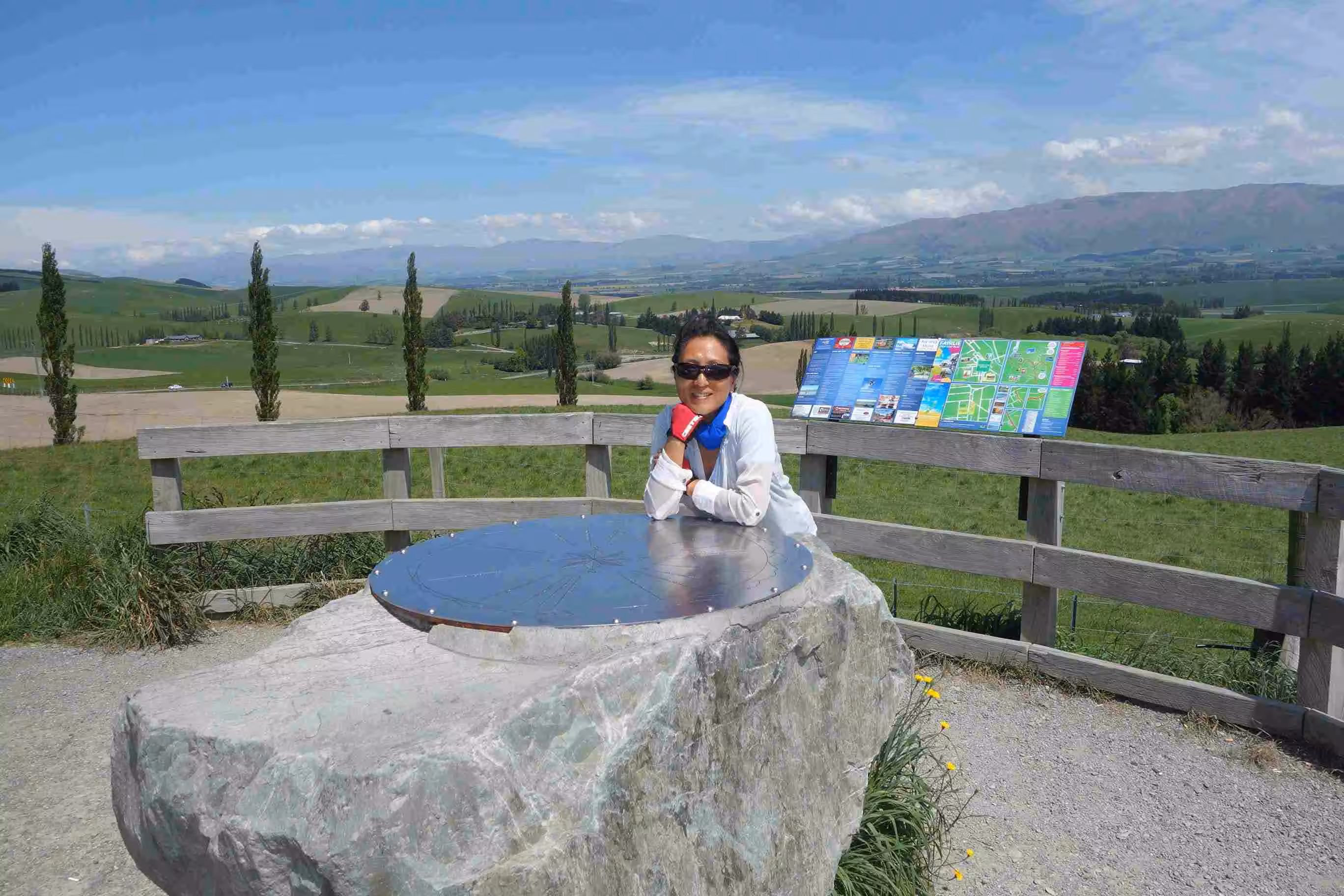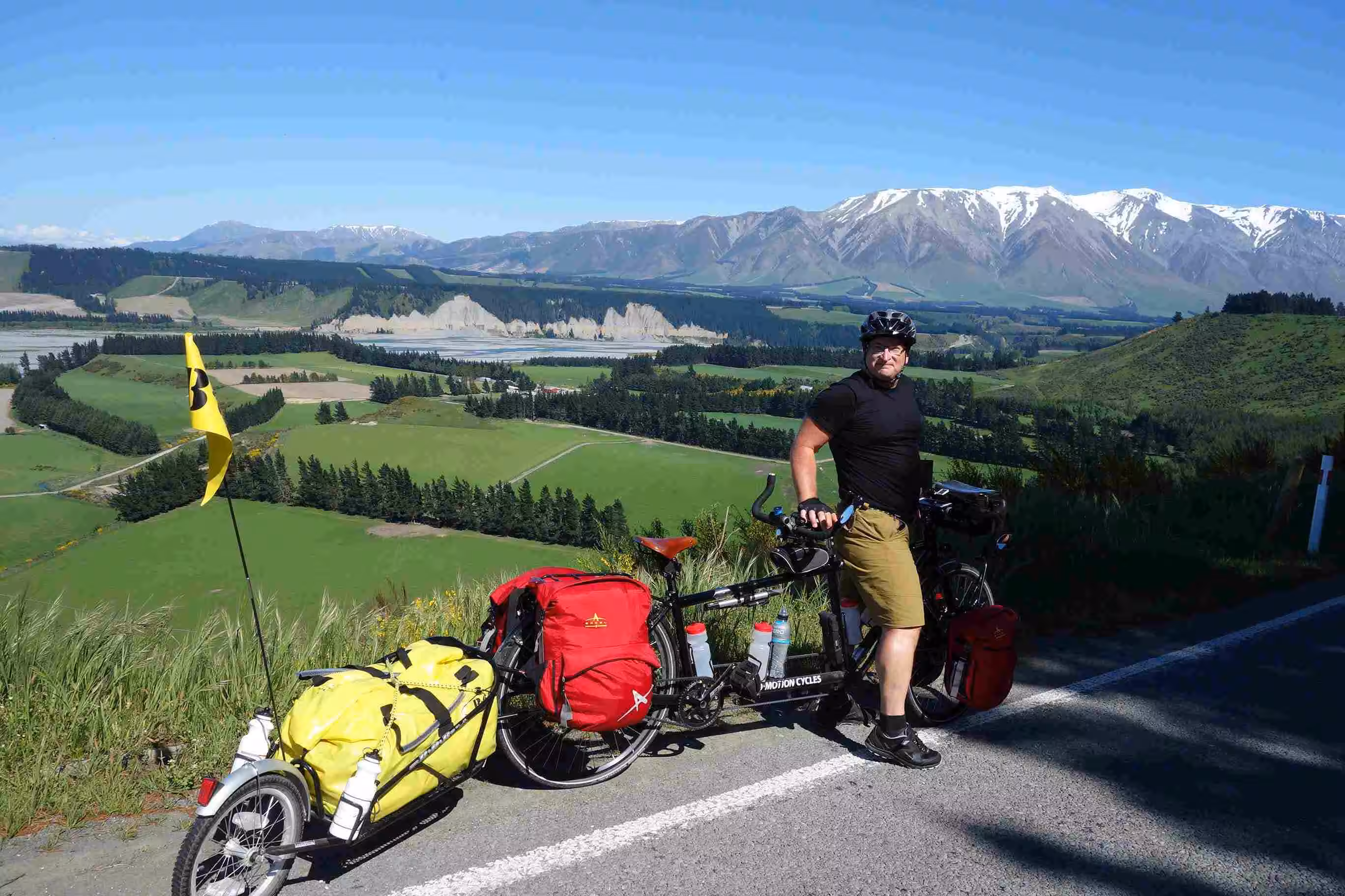 2017.11.02 – [NZ] Geraldine ==> Fairlie (47 kms | Total: 290 kms) – By leaving on Thursday morning, we were missing the festivities of the Geraldine’s Country Fete. Our planned route headed west again and led to a continuous gentle climb with a handful of steeper hills along the way. Road traffic was a bit heavier today but we still enjoyed our ride under sunny condition. We encountered our first flat tire of the trip. At the top of our last hill of the day was a pleasant café which we took advantage of. We secured another cabin at the Fairlie Holiday Park. For our evening meal, we bought some Chinese take-out and ate back at our kitchen facility.