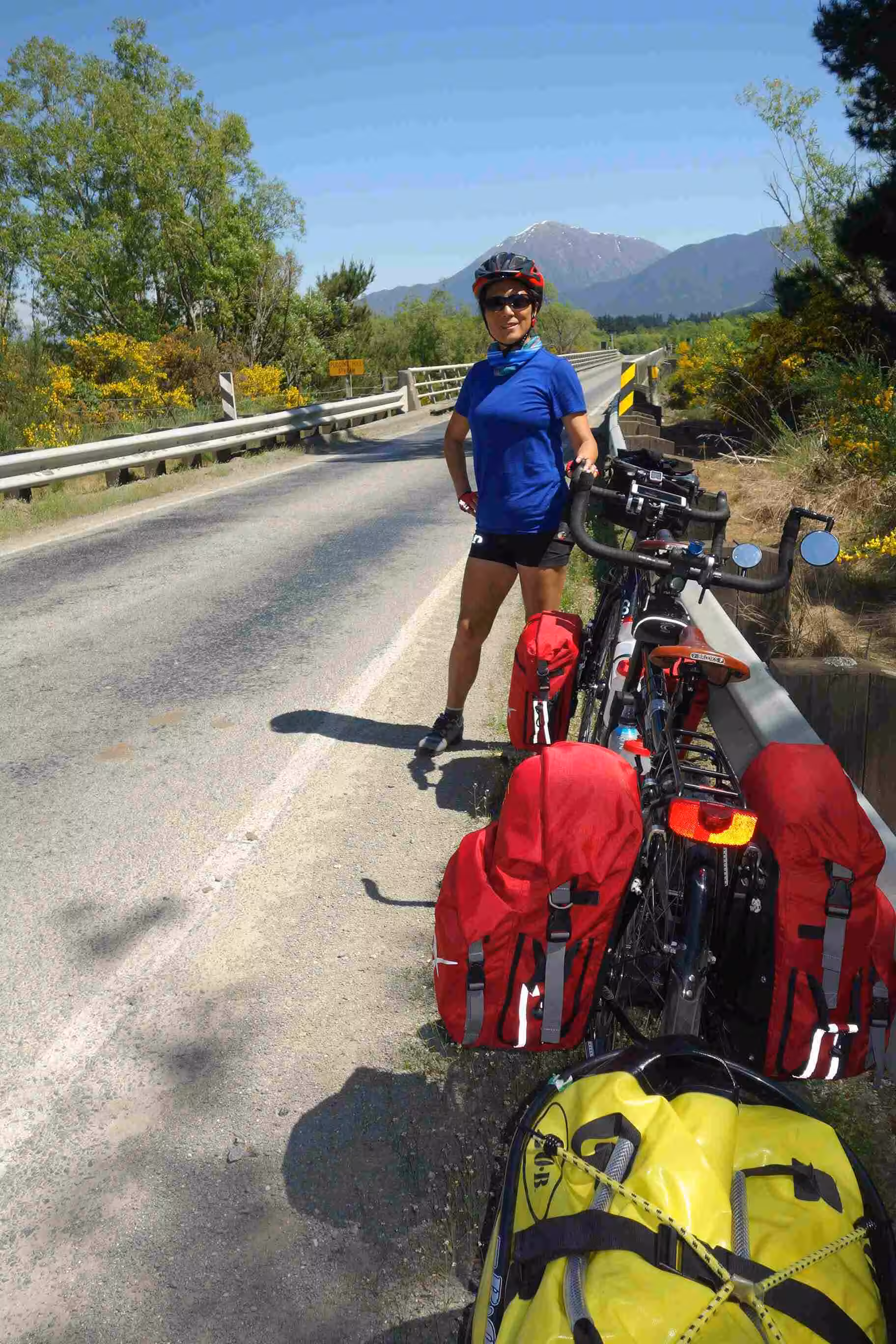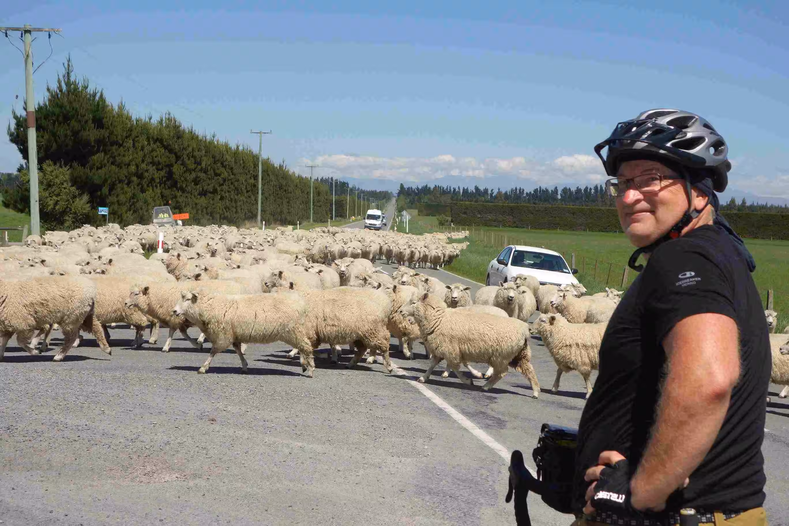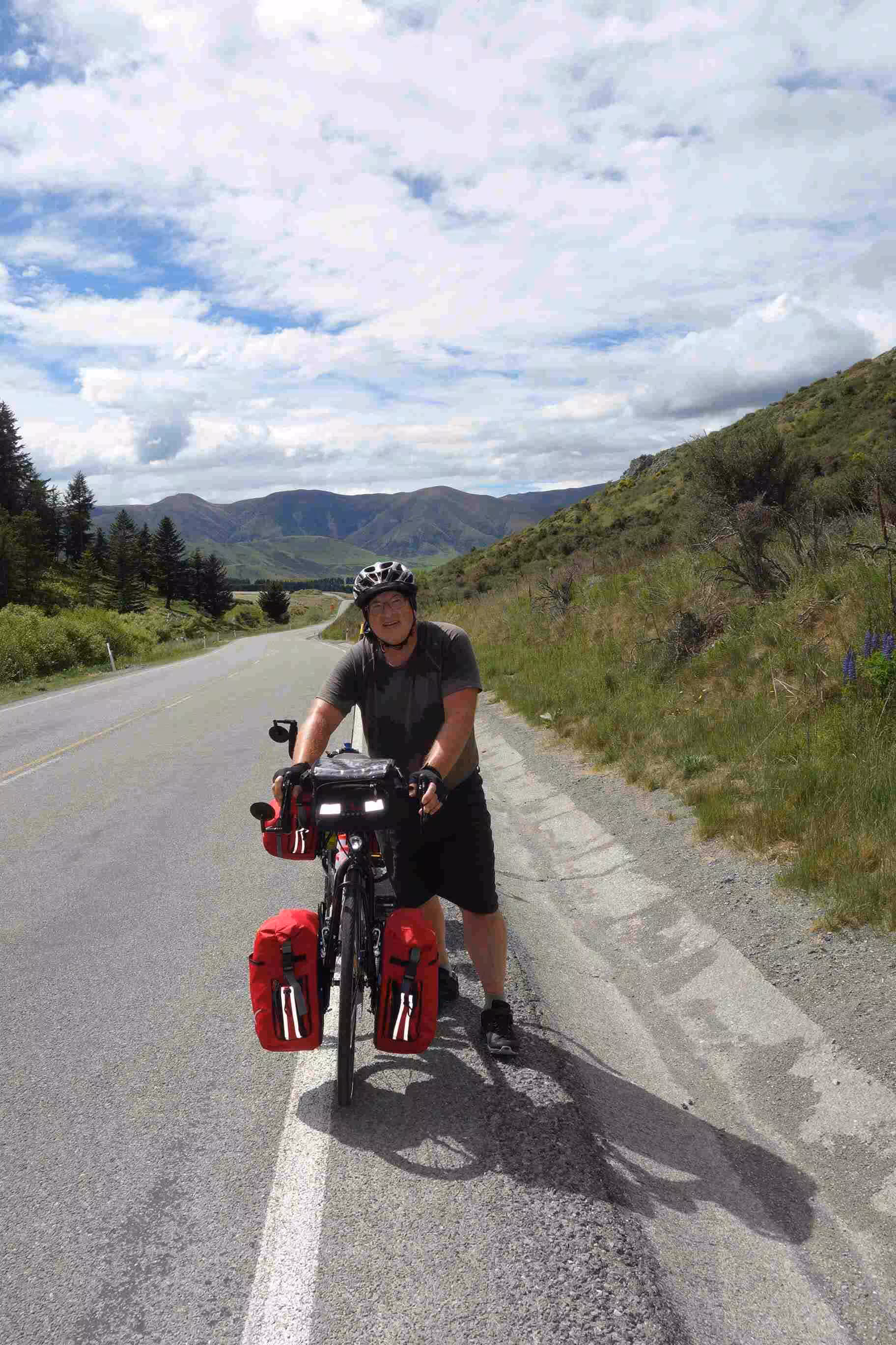 2017.10.31 – [NZ] Glentunnel ==> Mt Somers (62 kms | Total: 190 kms) – Our first night camping showed us our tent covered with a heavy morning dew. We tried our best to dry the tent before leaving our first holiday park, as camping grounds are referred to in NZ. We ate some yogurt and sandwiches for our breakfast. We set out riding under a nice sunny sky. The road was enjoyable. The traffic was fairly light and the drivers were courteous. Our main challenge for the day was a dip on the road, named the Rakaia Gorge. Needless to say that we walked up part of the steep hill bank. We encountered our first sheep roadblock along the way. And we really appreciated encountering a pleasant roadside café a few kms before our second day destination. This was one of the references our AirBnB host in Christchurch had provided us for our journey going south. At Mt Somers Holiday Park, we opted to rent a cabin in order to avoid dealing with a damp tent in the morning. We had our evening meal at the only place in town, the local tavern. The very small town of Mt Somers felt like a metropolis compared to our first day stop in Glentunnel.