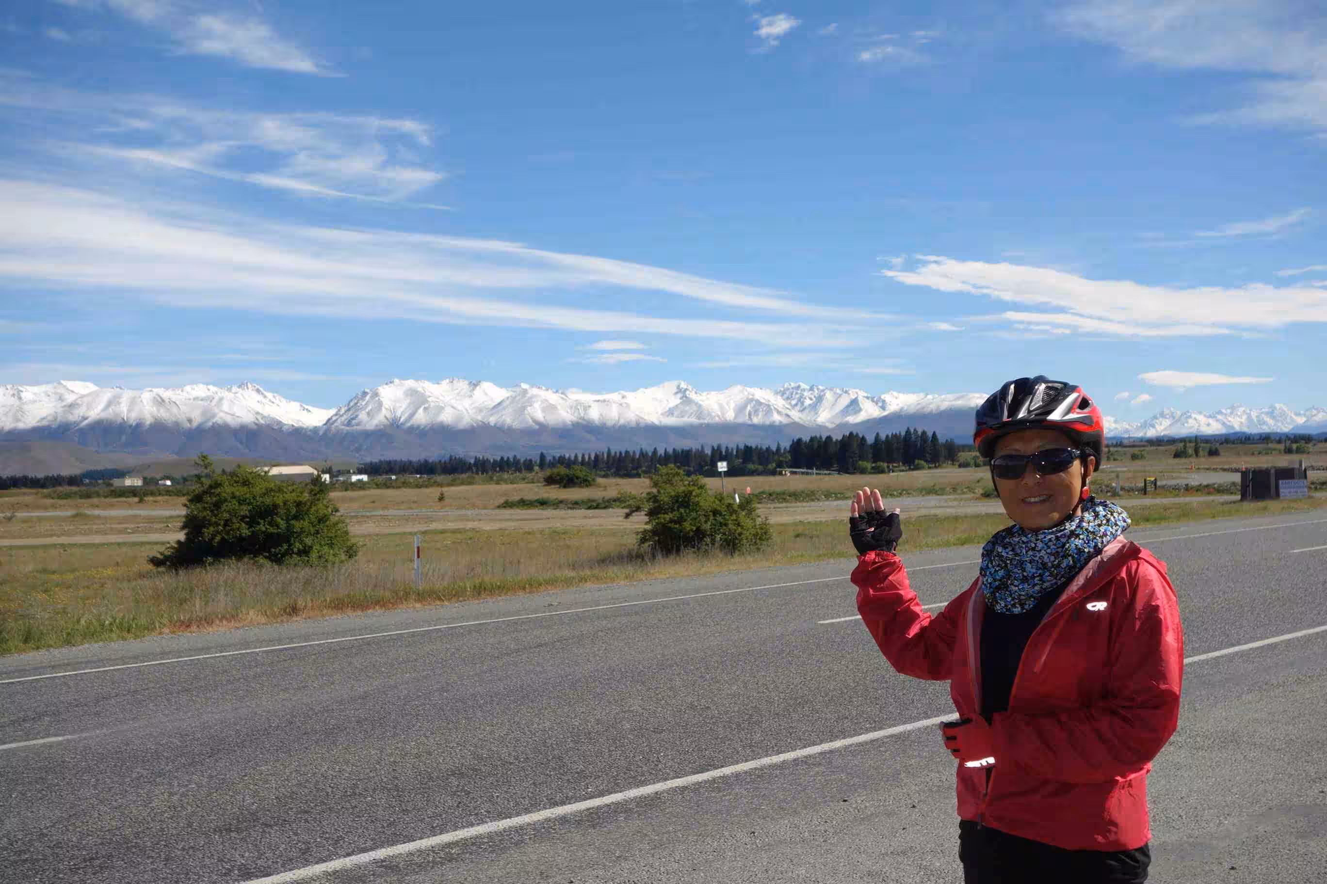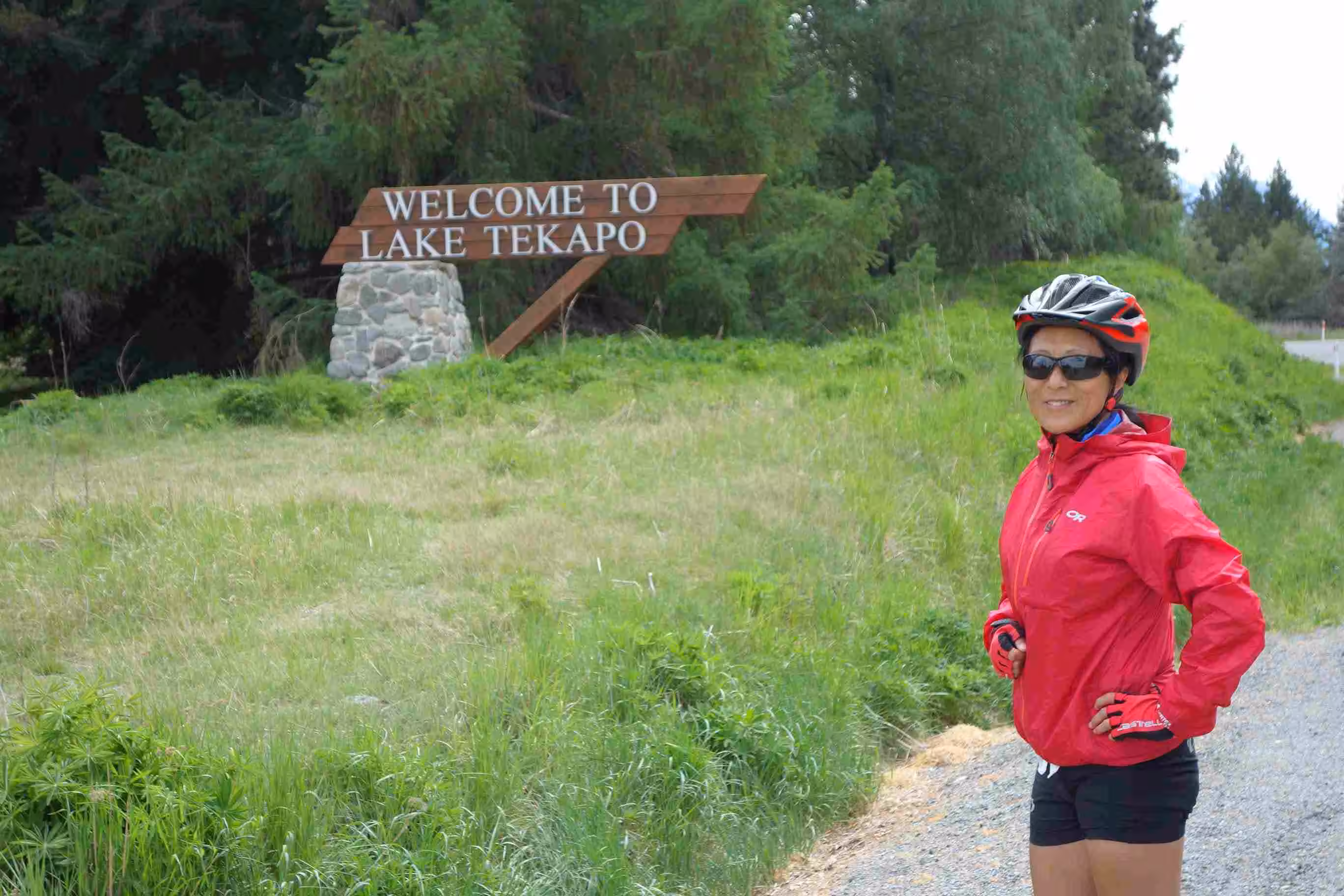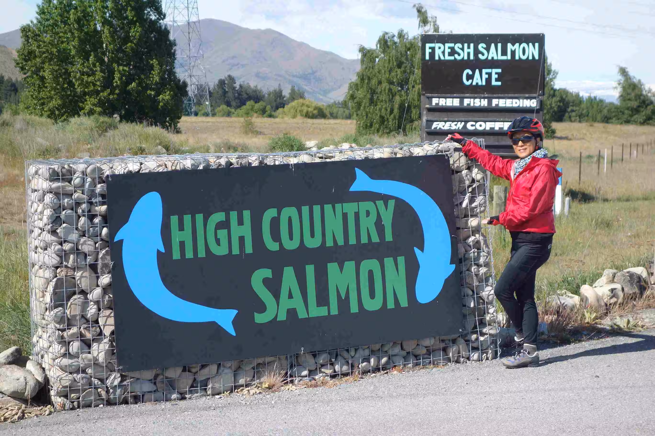 2017.11.05 – [NZ] Lake Tekapo ==> Twizel (61 kms | Total: 396 kms) – Inevitably while traveling in New Zealand, at some point, it will rain! And today seemed like it was to be our initiation to bad weather. As we woke up and realized the sky was still clear, we quickly broke camp. We noticed that the previous day’s wind had actually bent some of our tent poles! We managed to cycle out of Lake Tekapo under some windy but dry condition but an hour later, the rain started falling down. We both had put on our waterproof socks this morning. Jenny tried her rain poncho but I only kept my wind-stop jacket hoping that we would have a break in the rain and then I would dry out en route. Unfortunately, it continued to rain until we reached our destination in Twizle. Our only rest during our entire 60kms cycling day was at an information center on high altitude salmon farming. We had some hot chocolate there to help warm us up while we envied all the tourists dropping by with their RVs and tour buses. The last 10 kms to our holiday park were thankfully easy. We did our best to dry our clothes in our cabin. After the rain stopped around 6:00pm, we did some grocery shopping and had a good Thai meal.