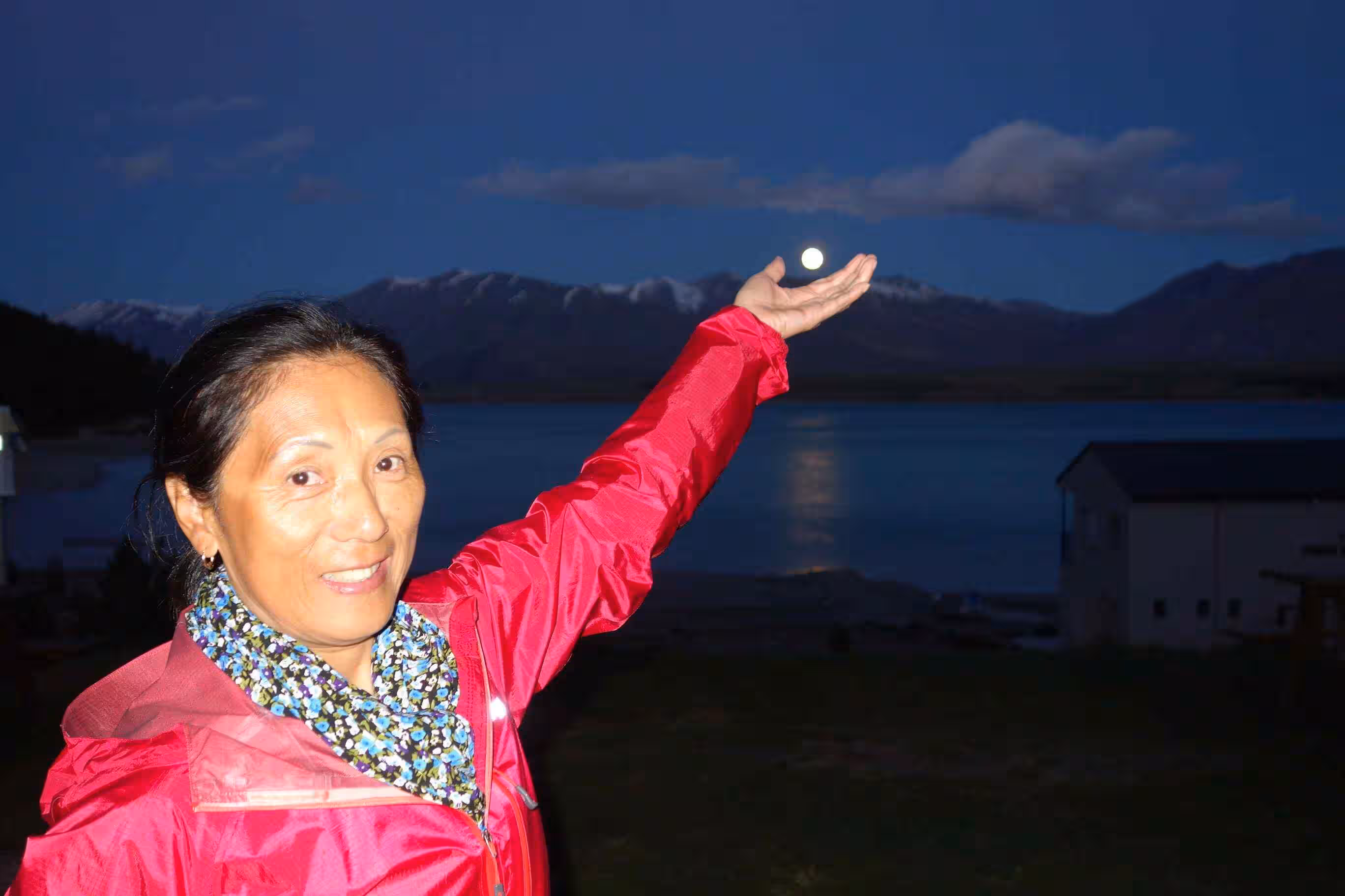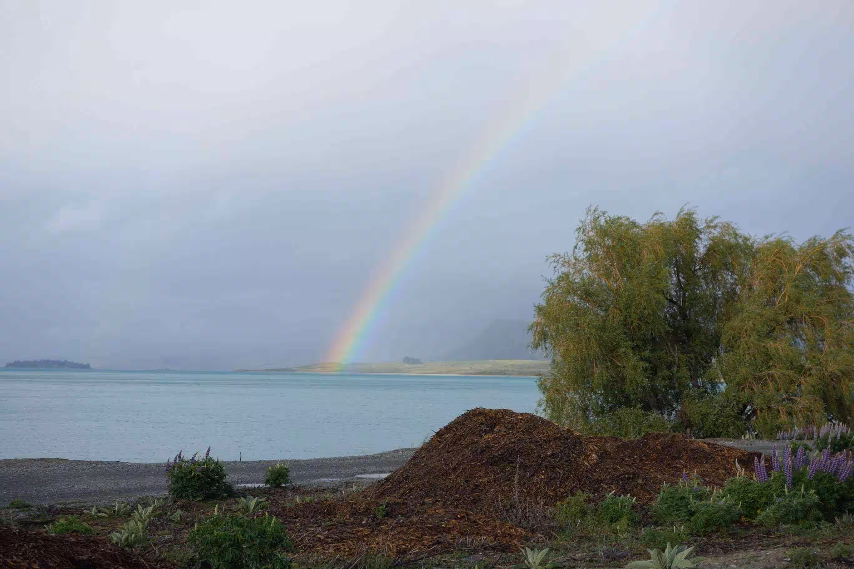 2017.11.03 – [NZ] Fairlie ==> Lake Tekapo (46 kms | Total: 336 kms) – Our Google road profile had warned us that we would be climbing most of the day towards Lake Tekapo, a small Banff/Lake Louise town. As we were scheduled to take a day or two of rest in Lake Tekapo, we had attempted the previous evening to reserve, through various booking websites, such as the usual Booking.com and AirBnB, an accommodation but everything appeared sold out. After reaching a plateau over a road pass, we started to battle strong side winds that required all our concentration and energy to ride forward and deal with the busier road traffic. We struggled in these conditions for the last 15 kms. Upon our arrival in Lake Tekapo, we checked into the local holiday park and, after confirming the unavailability for cabins (for the past few weeks now), we resigned ourselves to pitch our tent under some windy condition. Later we walked into the town center consisting of a single strip mall. We bought some groceries and had supper at a Thai restaurant. For those that like star gazing, you should know that Lake Tekapo is an International Dark Sky Reserve. One of a dozen such places in the world – although Mont-Mégantic (Québec) is also one such certified area. We did admire a full moon and beautiful stars during our night visit to the washroom.