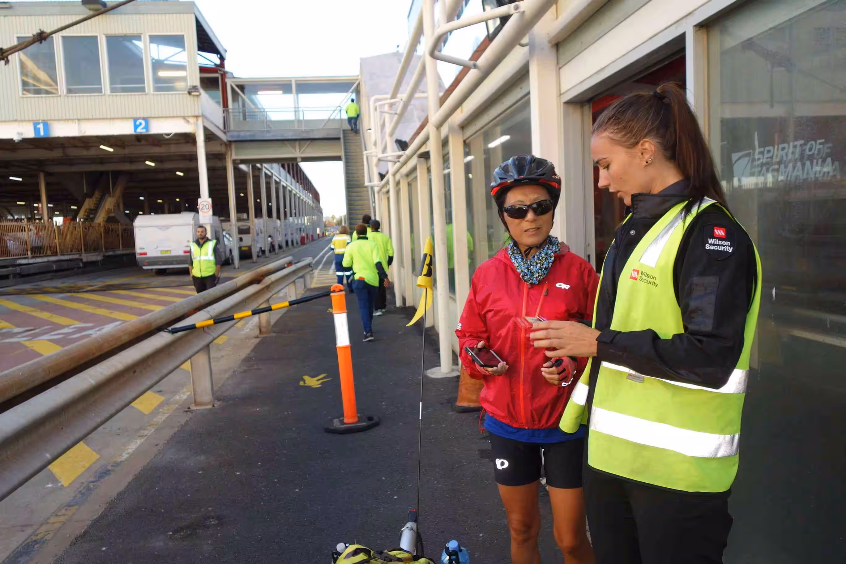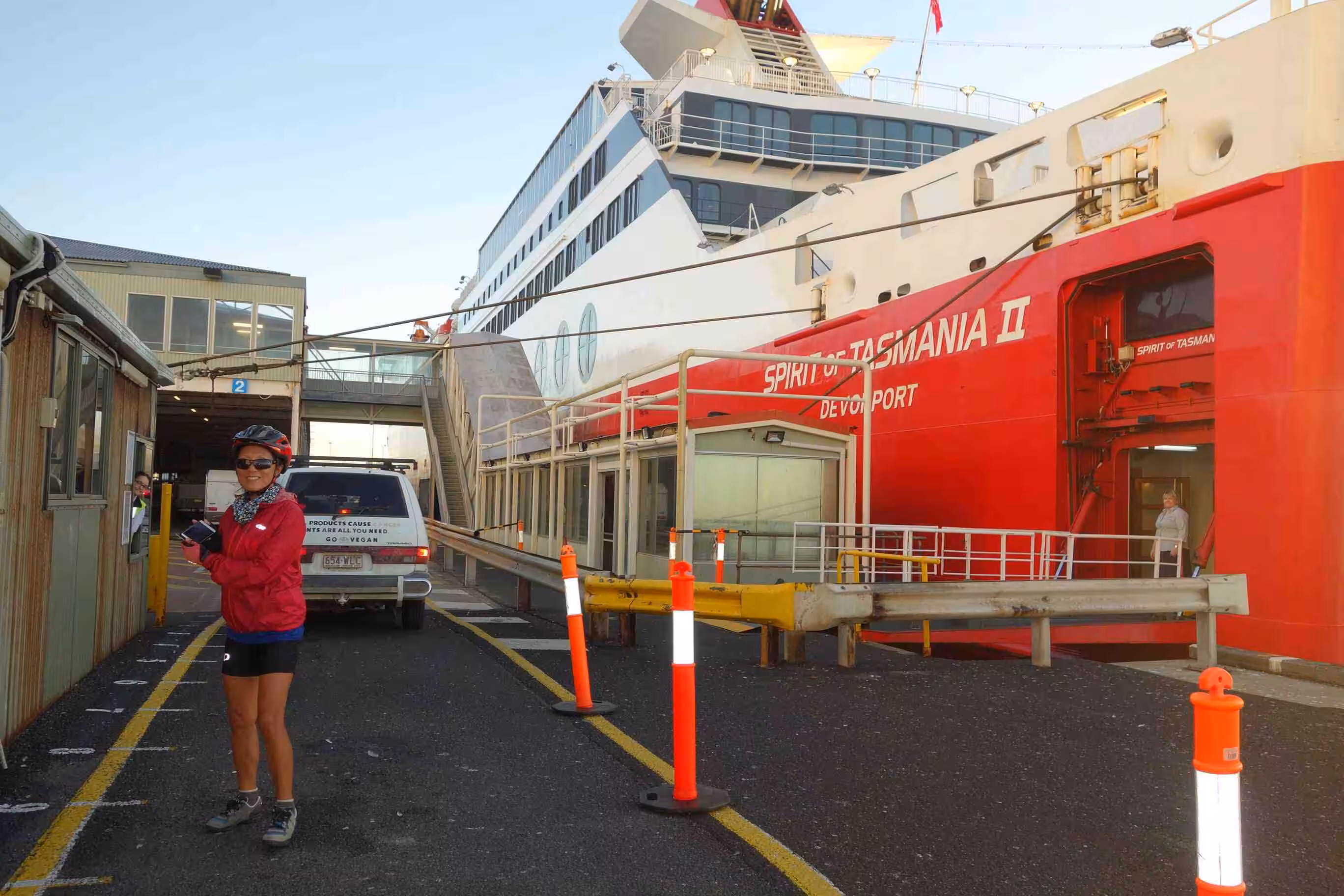 2018.03.10 – [AU] Melbourne ==> Devonport (8 kms | Total: 4391 kms) – We did not sleep overly well knowing that we had a 9:30am ferry to catch – some 7kms away from our accommodation. After gathering all of our belongings, we loaded the tandem and trailer at the first light around 7:15am. We cycled easily to the port where the Spirit of Tasmania II ferry was anchored. It was a great feeling passing beside the long queue of vehicles awaiting to board the ferry. The boarding process for us was very efficient as we rolled the tandem onto the ferry. Although we quickly found our private 4-berth cabin, we had to have our key re-initialized. Due to a technical glitch, it seemed that everyone with a cabin or a recliner reservation had to deal with the same issue. During the eleven hour crossing from Melbourne to Devonport, the sea was calm. We had our breakfast and a late afternoon snack on-board. Although we spent much of our time in our cabin, we did manage a few walks around the three passenger decks. Upon our arrival in Devonport, we rolled out of the ferry with our tandem and cycled less than a 1km to a holiday park. We quickly pitched our tent with the last light of the day.
