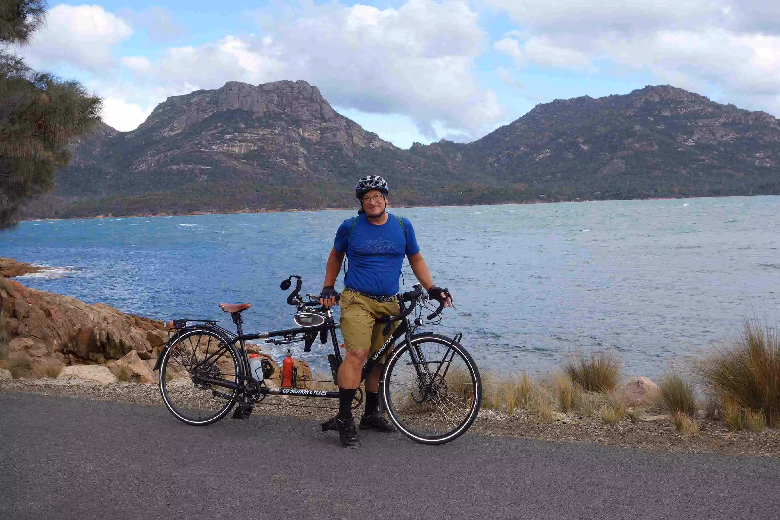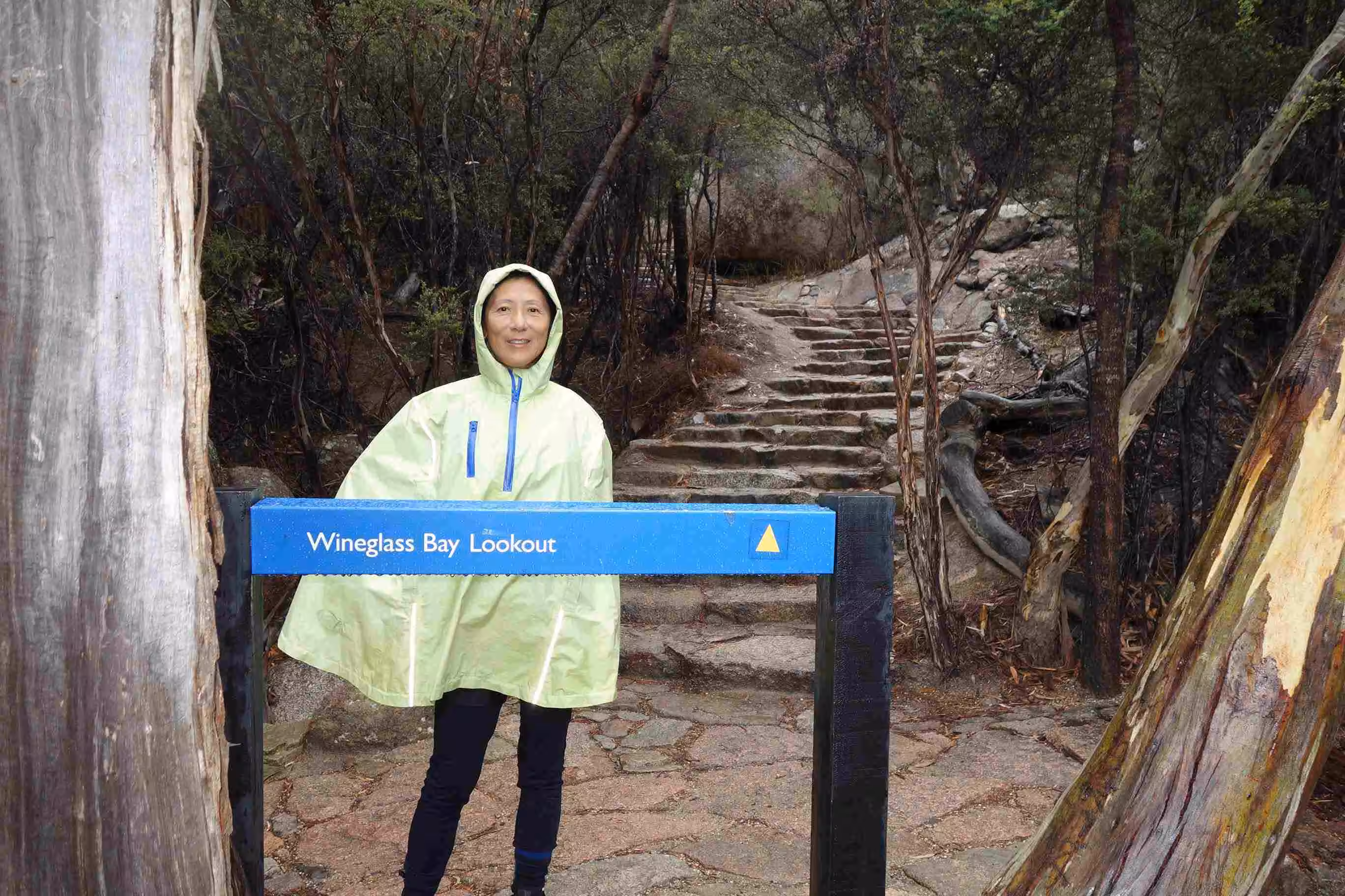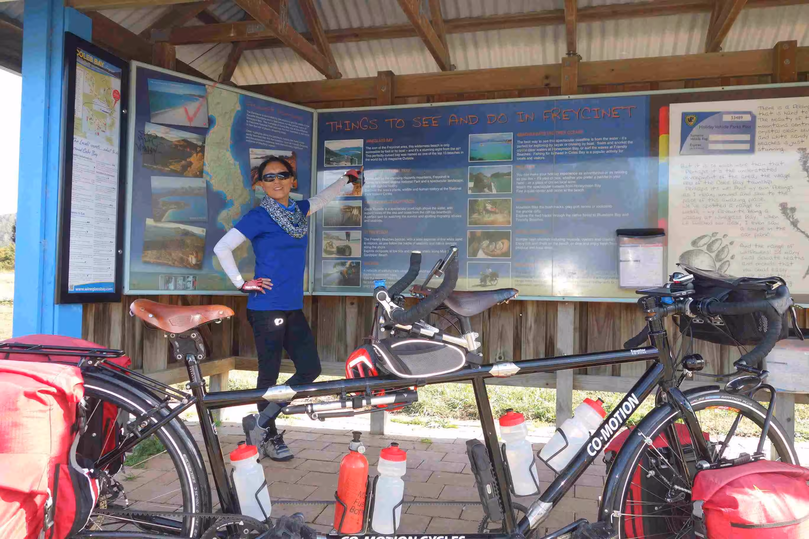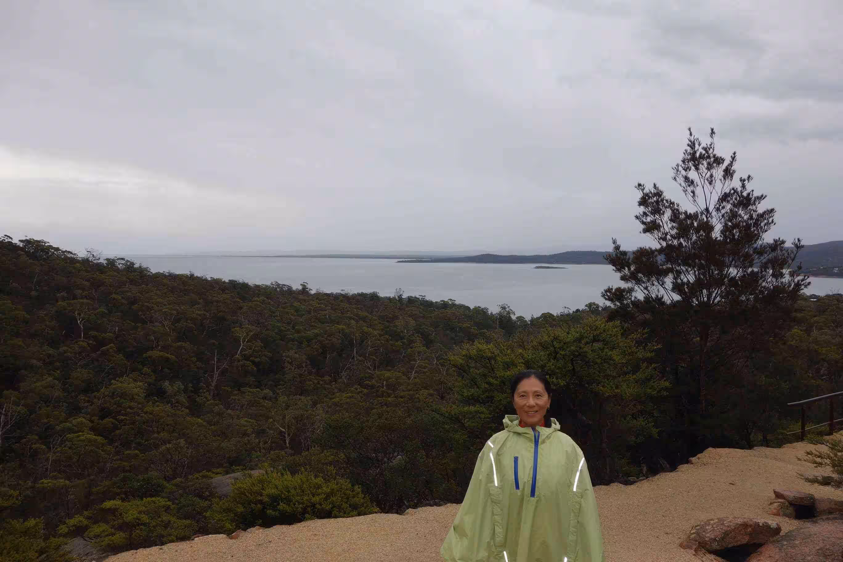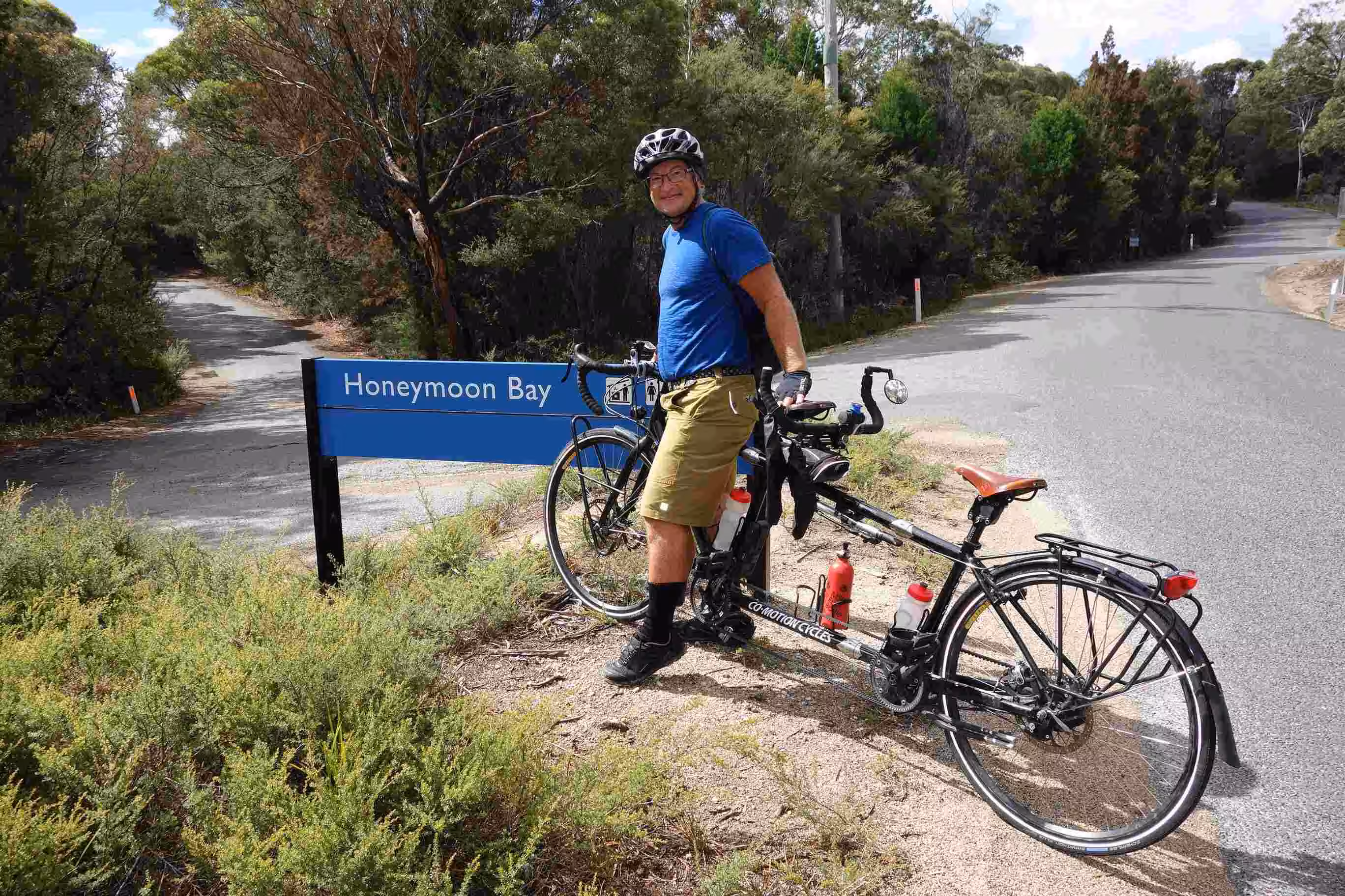 2018.03.18 – [AU] Coles Bay ==> Coles Bay (12 kms | Total: 4811 kms) – As forecast, we awoke to some rain. During our day of rest in Coles Bay, we had hoped to go for a hike at the nearby Freycinet National Park. After reviewing the hourly weather forecast, we decided to risk a visit to the Park. We left our backpacker accommodation with our rain gear and the tandem and we stopped at the bakery for our breakfast. We cycled 2 kms to the Park’s visitor center where we bought our daily park access passes. We cycled a 4 kms further to the car park where several trail heads began. We enjoyed the hike up to the Wineglass Bay lookout – especially as the rain stopped. From the lookout, we opted to take the 1.5 h return trail to the Wineglass beach for some photo opportunities and some bragging rights. By dropping by the beach we could enjoy saying that we had visited one of the top 10 beaches in the world according to the US magazine Outside. After our three hour hike, we cycled back to Coles Bay’s town center for a light lunch. We returned to the same restaurant for our evening meal.