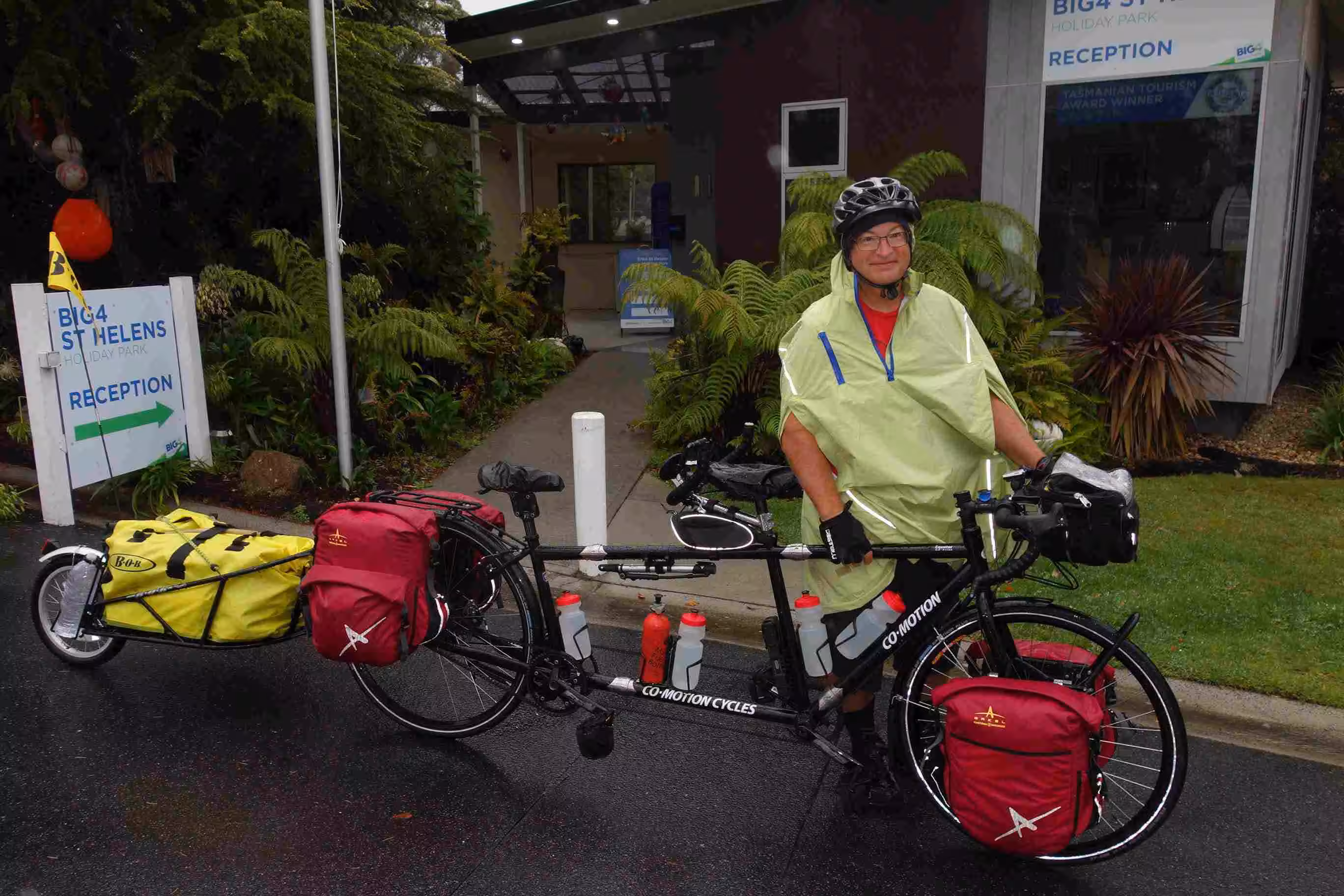 2018.03.16 – [AU] St Helens ==> Bicheno (78 kms | Total: 4760 kms) – It rained most of the night. Except for the tent, we managed to break camp without getting things too wet. We left our campground with our full rain gear on (waterproof socks, boot cover and poncho). We had a long cycling day ahead of us – some 75+kms. Although the vehicle traffic was not as heavy as we expected we nonetheless needed to keep monitoring closely the road for the vehicles as it continued to rain lightly and there was no road shoulder for the first 10-15 kms. Near our 20th km, we stopped in Scamander for breakfast. The rain had stopped by the time we mounted the tandem again. The coastal road provided some very nice views of the Tasmanian sea. We arrived in Bicheno under some dark clouds. Shortly after checking into our backpacker accommodation, it started to rain again. We opted to buy some food supplies and cook our evening meal at the backpacker’s well equipped kitchen. It was a good decision to stay inside.