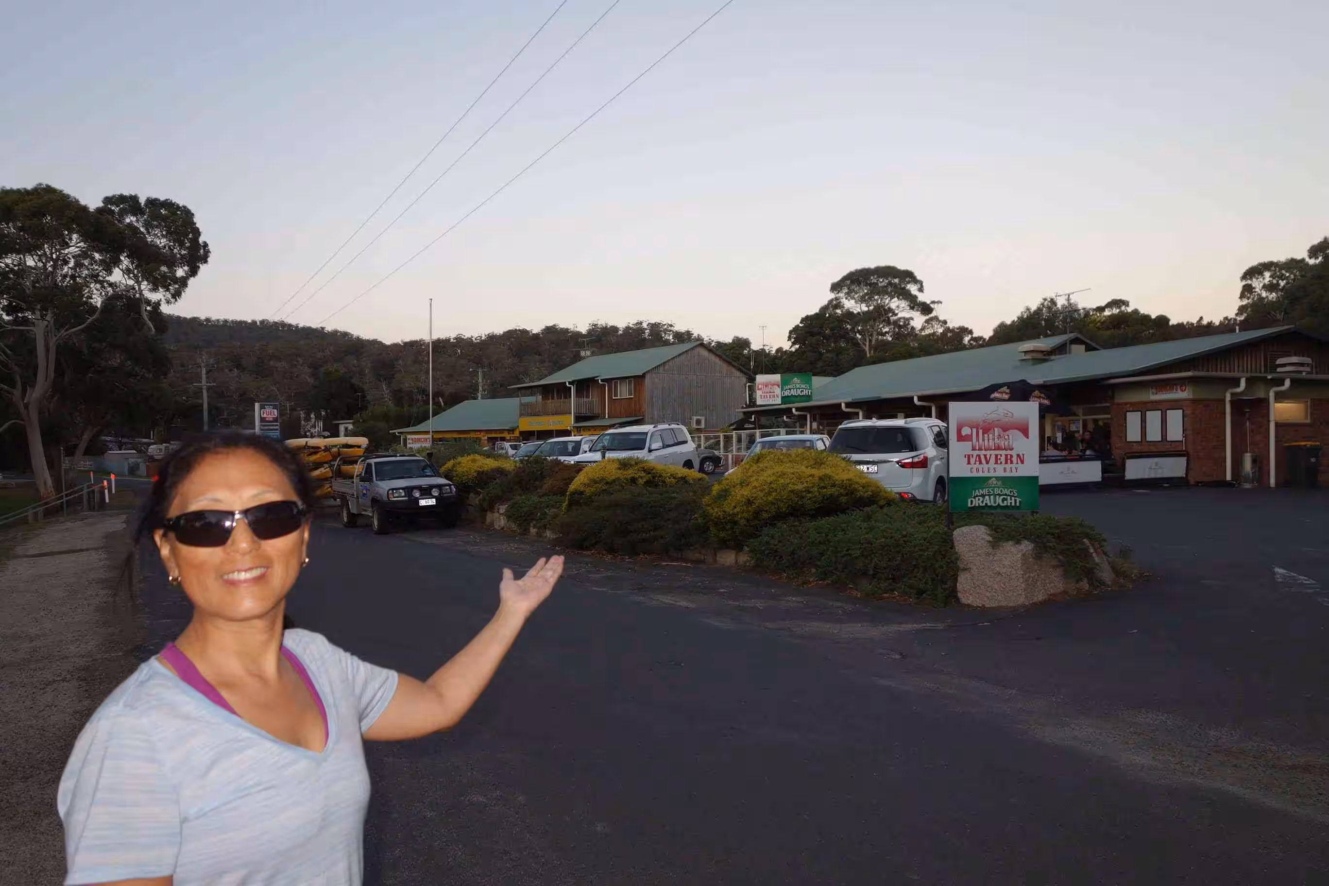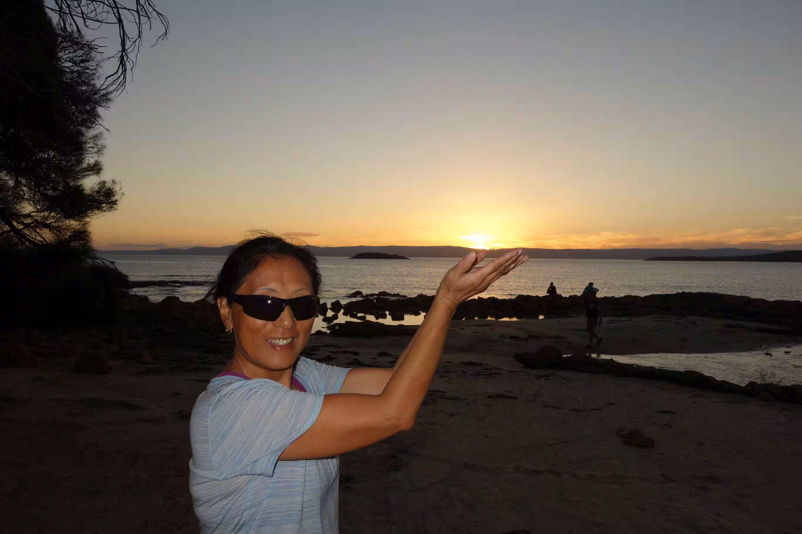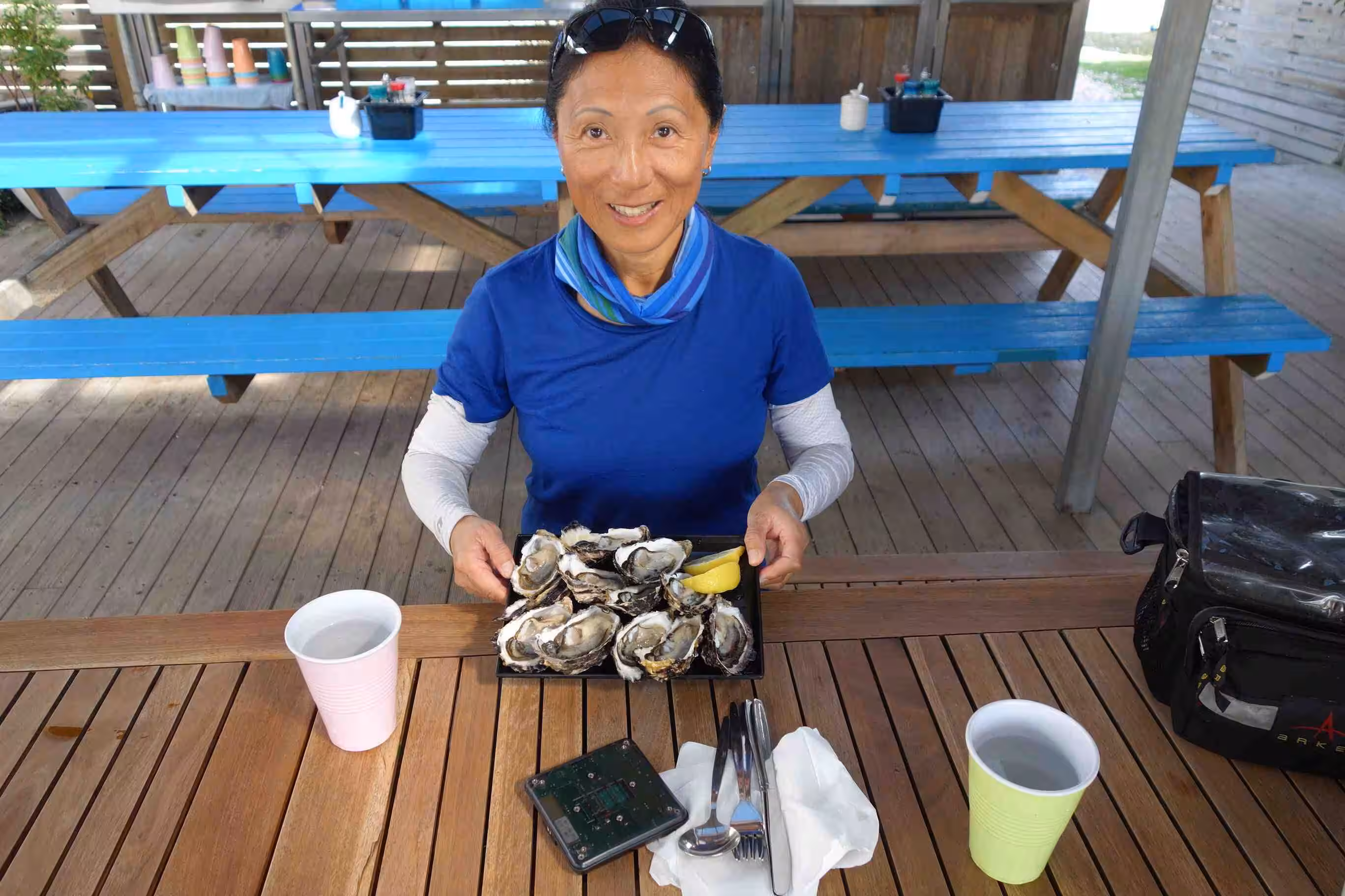2018.03.17 – [AU] Bicheno ==> Coles Bay (39 kms | Total: 4799 kms) – We cooked breakfast at our backpacker accommodation and bought lattes at a nearby bakery. The rain had stopped and the sky was clearing when we left town. There was a detour leaving out of town due to a recent car accident but we were allowed to cycle through. The cycling was enjoyable especially knowing that we only had to cover less than 40km. After 12 kms or so on the main highway, we took a turn off for the road to Coles Bay. We met a solo cyclist along the way who highly recommended the camping experience at the Freycinet National Park. Some 8kms before arriving at Coles Bay, we stopped at the Freycinet Marine Farm for an early lunch snack. Jenny enjoyed a dozen oysters, au natural, while I had some scallops. As we were enjoying our seafood, we noticed the place was suddenly overflowing with tourists stopping for lunch. Before leaving the Farm, we met and chatted with a cyclist couple who flew to Tasmania from Sydney. After checking into our backpacker accommodation, we dried the tent and initiated two loads of clothes wash. We had some lattes and snacks at the local bakery while waiting for our clothes wash to finish. We had our evening meal at the nearby tavern. Later, we managed to capture a few pictures of a beautiful sunset.