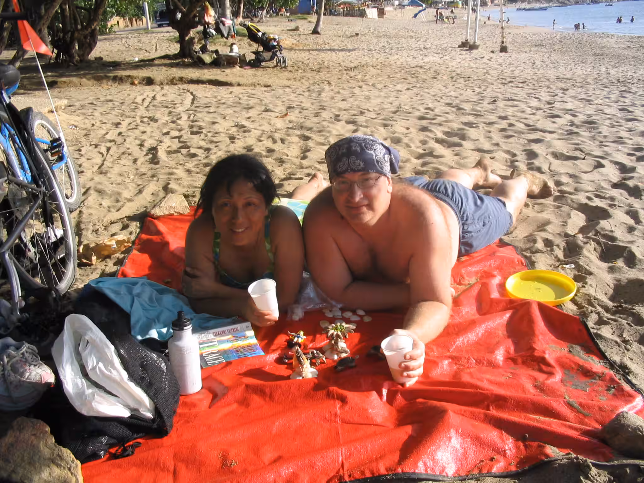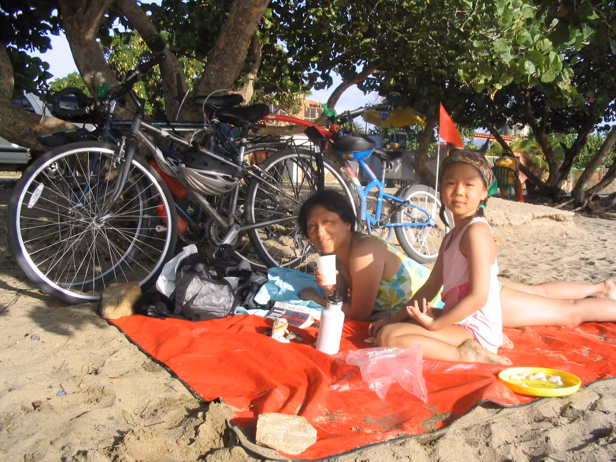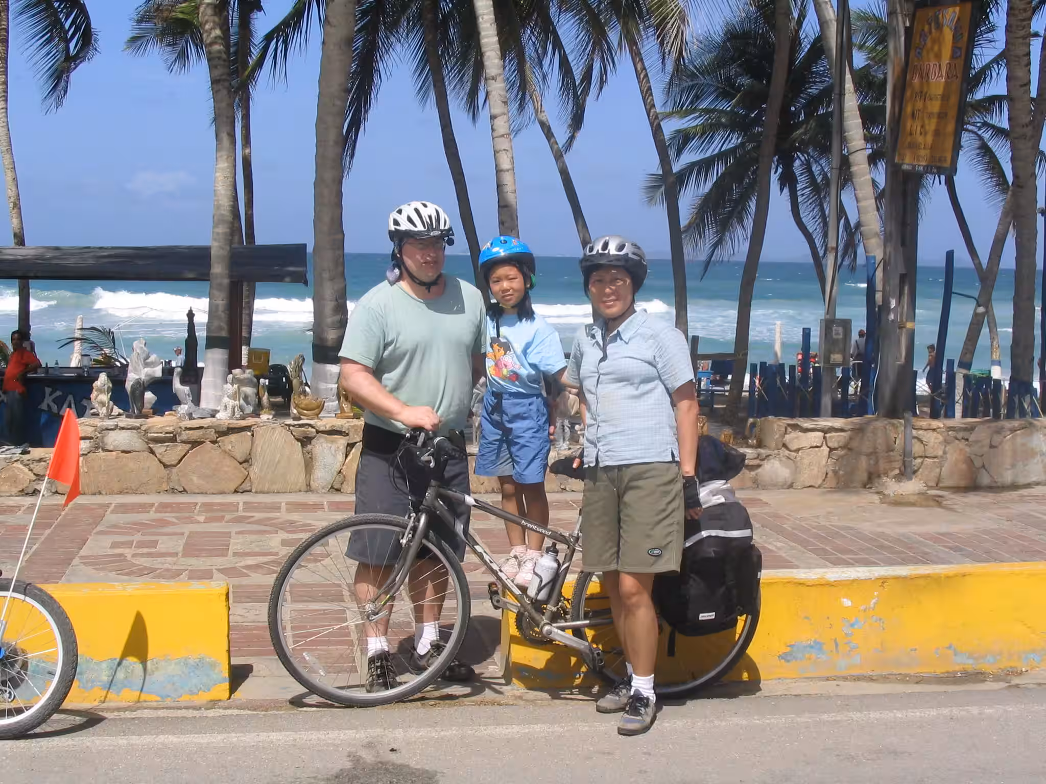 La nuit fut très bonne. Nous plions nos bagages. La visite à la plage d’hier a laissé des traces de sable dans la chambre. Nous déjeunons aux restants de pizza d’hier. On redescend les vélos du 4ieme étage. On reprend la route principale à basse vitesse. Il n’y a pas d’accotement, mais les automobilistes sont polis avec nous. Je crois qu’il n’y a pas beaucoup de cyclistes qui visitent l’île. Nous manquons la sortie pour Los Robles et nous de vous. Nous rebroussons chemin sur 1 km d’autoroute. Sur la route, la circulation est beaucoup moins dense. Nous sommes contents d’avoir tous les trois des “rétroviseurs”. La route est relativement plane, sinueuse et partiellement ombragée. La pluie plus tôt le matin a fait plusieurs flaques d’eau. Jenny et Victoria n’ont pas de garde-boue sur leurs vélos. Victoria est discrètement couverte de boue – elle n’est pas très confortable. Nous passons par la Asuncion (capitale de l’état). Les kms défilent facilement jusqu’à Playa El Agua. Nous magasinons de nouveau pour un hôtel. Les chambres sont beaucoup plus dispendieuses ici qu’à Porlamar. Nous arrêtons notre choix sur l’Hôtel Costa Linda Beach Resort – c’est un joyau de petit endroit, avec piscine. Victoria est emballée par la piscine, il est à peine 13h30 et notre chambre n’est pas prête. Nous devons revenir dans une heure. Nous retournons à vélo sur la rue devant la plage. On s’arrête manger des “empanadas”. Jenny et Victoria raffolent de ces choses. Un couple âgé de Hollandais nous jasons quelques temps – ils sont à leurs 18ième visite à l’île Margarita. Nous prenons quelques photos. où un Québécois s’offrent pour prendre une photo de groupe. De retour à l’hôtel, on se baigne. Victoria de même dans la piscine plusieurs heures – elle adore se baigner. En soirée, nous allons à chic restaurant pour souper, c’est très dispendieux. De retour à l’hôtel on se repose, sur le patio et dans la chambre. Plus tôt, Jenny a fait le lessive manuelle. Quel boulot!