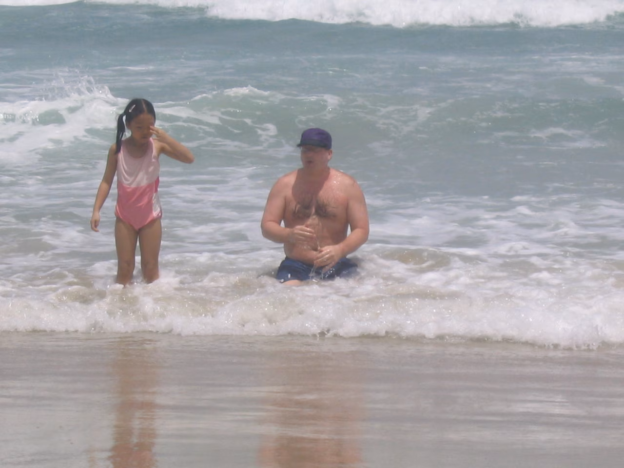 La nuit fut plus ou moins bonne. Le climatiseur a roulé toute la nuit, c’était un peu bruyant. Après notre réveil, nous allons déjeuner au restaurant de l’hôtel – c’est inclus avec le prix de la chambre. Après le déjeuner, nous prenons un petit repos sans le patio. Vers 10h, nous nous dirigeons vers la plage. Les vagues sont grosses. Nous marchons sur la laisse tout le long jusqu’au marché.