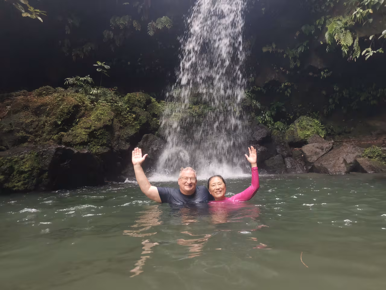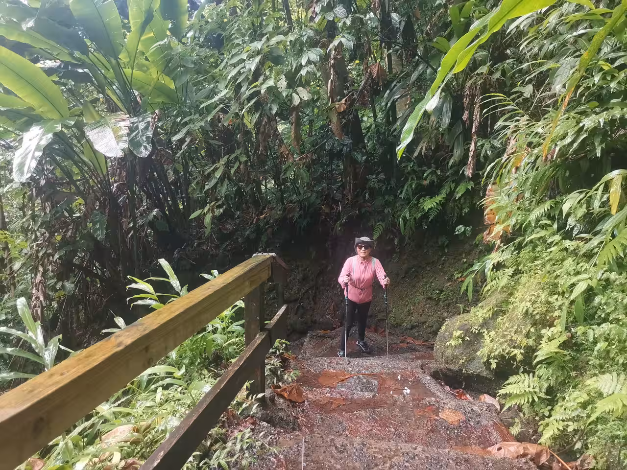 Today, we had planned two hikes—one easy and one more challenging. We left Portsmouth at 10 a.m. and drove about 1.5 hours to our first stop, the easy hike to Trafalgar Falls. What turned out not to be so easy was the last 10 kilometers of road leading there: it was extremely steep, narrow, and in very poor condition. Along the way, we were caught in a traffic jam involving heavy construction equipment, and on-site workers had to direct traffic to untangle the situation.