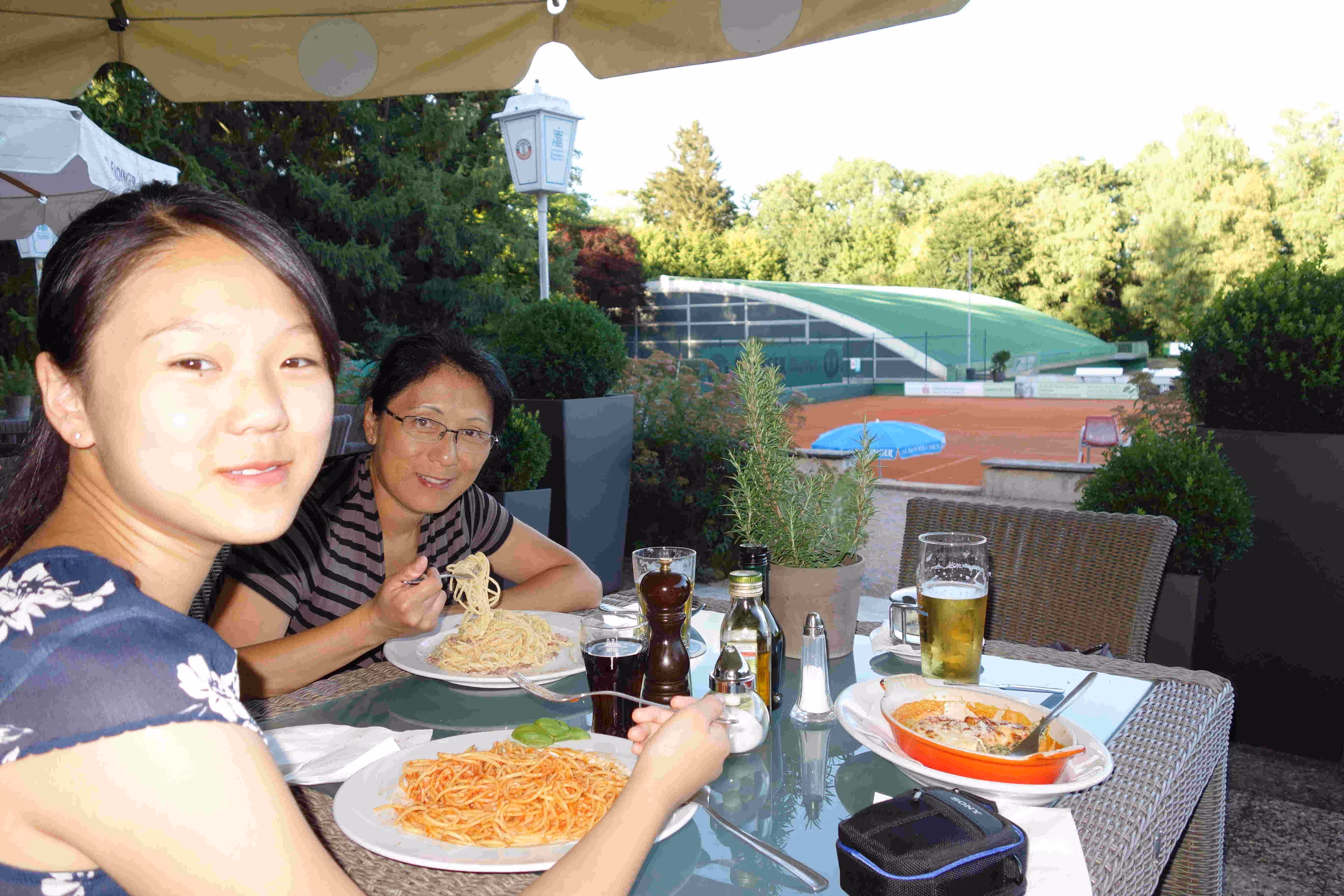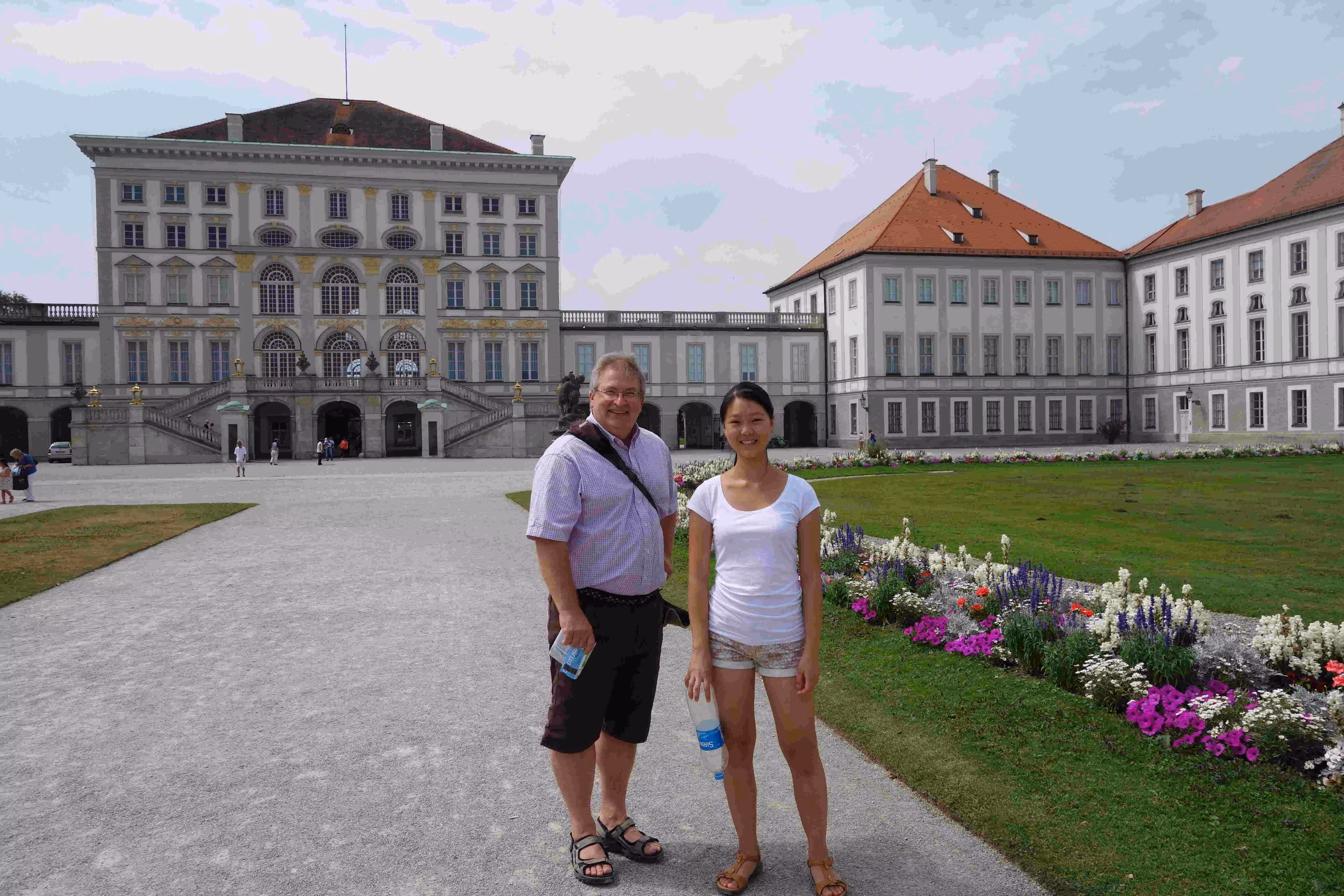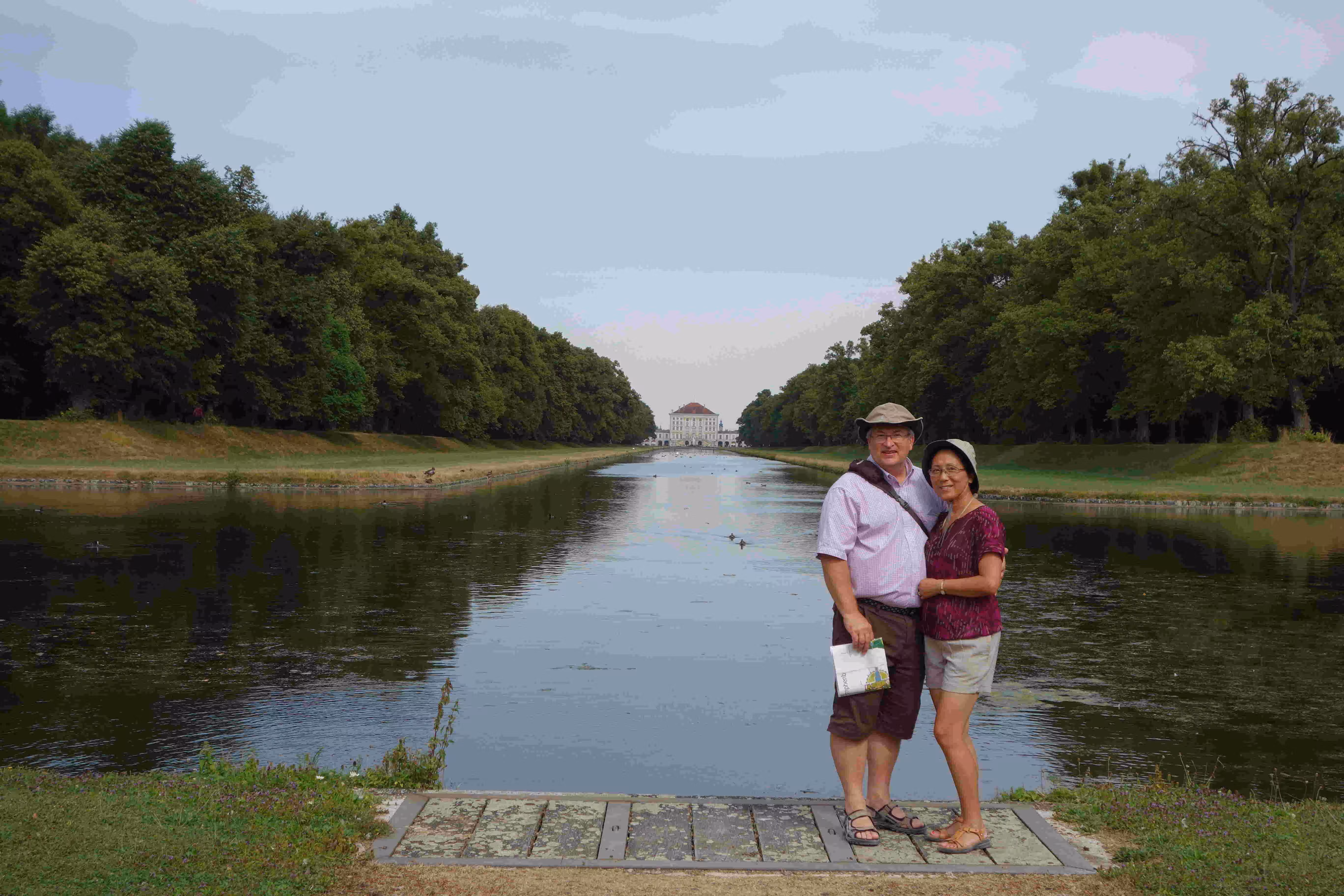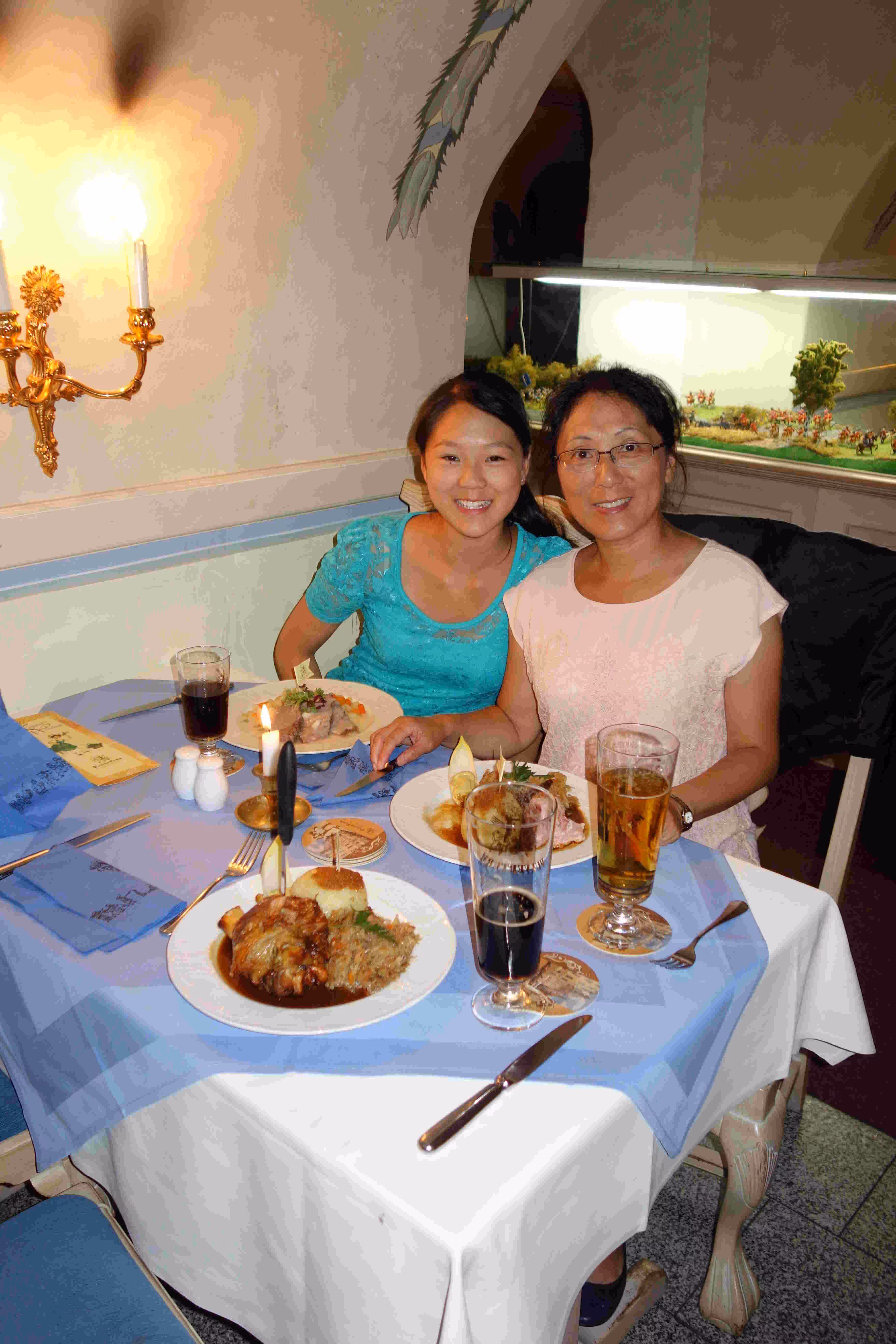 We woke up at 9:15am this morning to make sure we could catch the courtesy buffet breakfast at the hotel which ended at 10:30am. The breakfast was a very nice surprise as it was plentiful with friendly staff. We discovered that the S-Bahn station was closed on weekends until September. We end up taking the SEV city bus to the city center. Jenny and Victoria were again excited by all the clothes stores along our walk. We stopped for the noon carillon (glokenspiels) show at the residenz. Jenny and Victoria took 30 mins to do some shopping while I listen to an Ecuadorian musician group on the pedestrian street. We encountered a few musicians along the way, namely Ivan who played the accordion like no one we had seen or heard. The guy really got into his music to the point where Jenny initially thought he was a blind musician. We later took the tram to visit the past royal family’s summer palace. We spent a few hours visiting the museum and the many buildings in the vast garden/park. Before taking the tram back to the hotel, we had some ice cream. The tram ride was not very pleasant due to the excessive heat. At the hotel, we looked up some recommended restaurants for winner schnitzels. Unfortunately, the restaurant we had chosen was fully booked this Saturday evening. We resigned ourselves to visit the German restaurant across the street from of our hotel. At the restaurant, we became concerned by the fact that we appeared like the only patrons in the place. Nonetheless we appreciated the attention the old owner gave us. By the time we finished our meal, the outside patio had filled up. Back at the hotel, we went for a swim at the hotel pool.