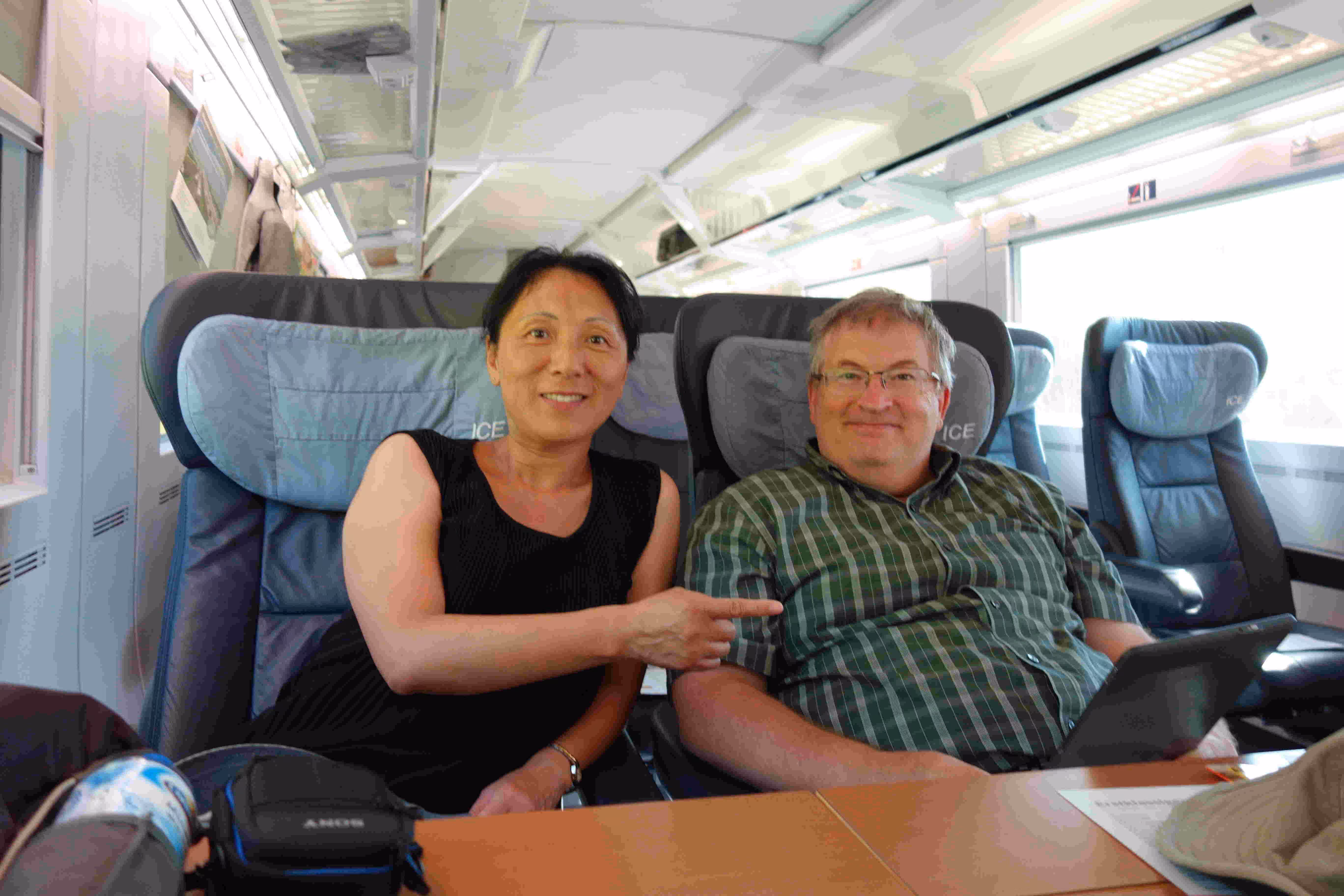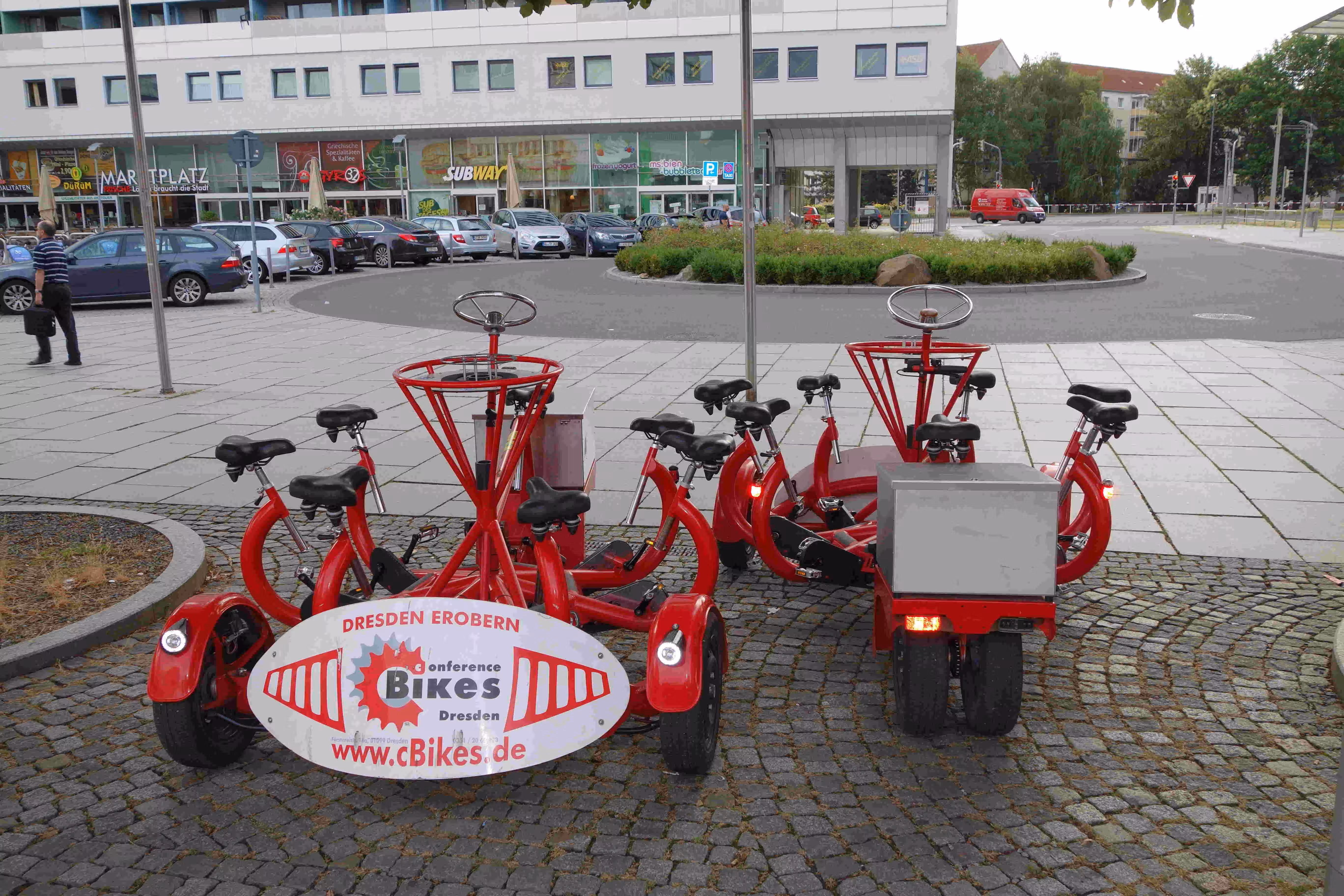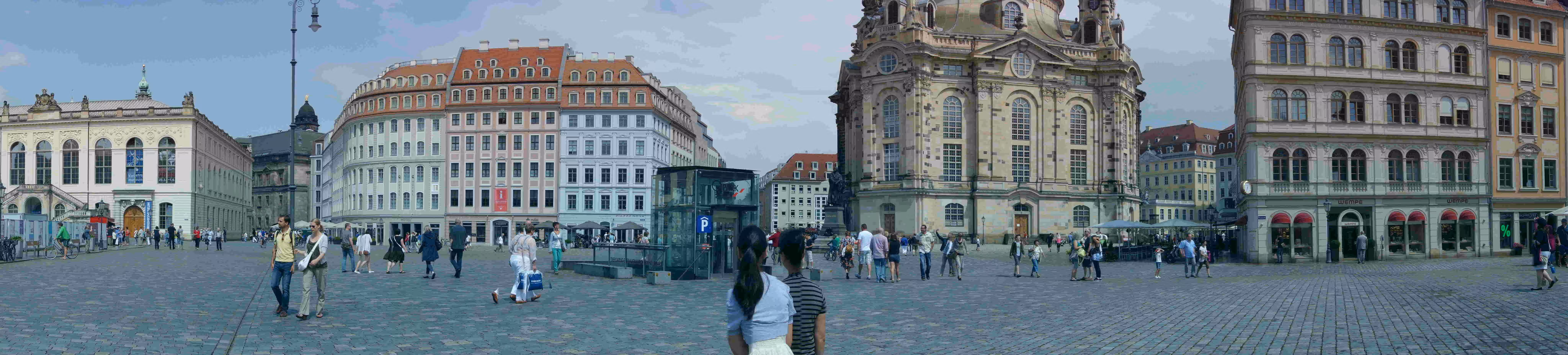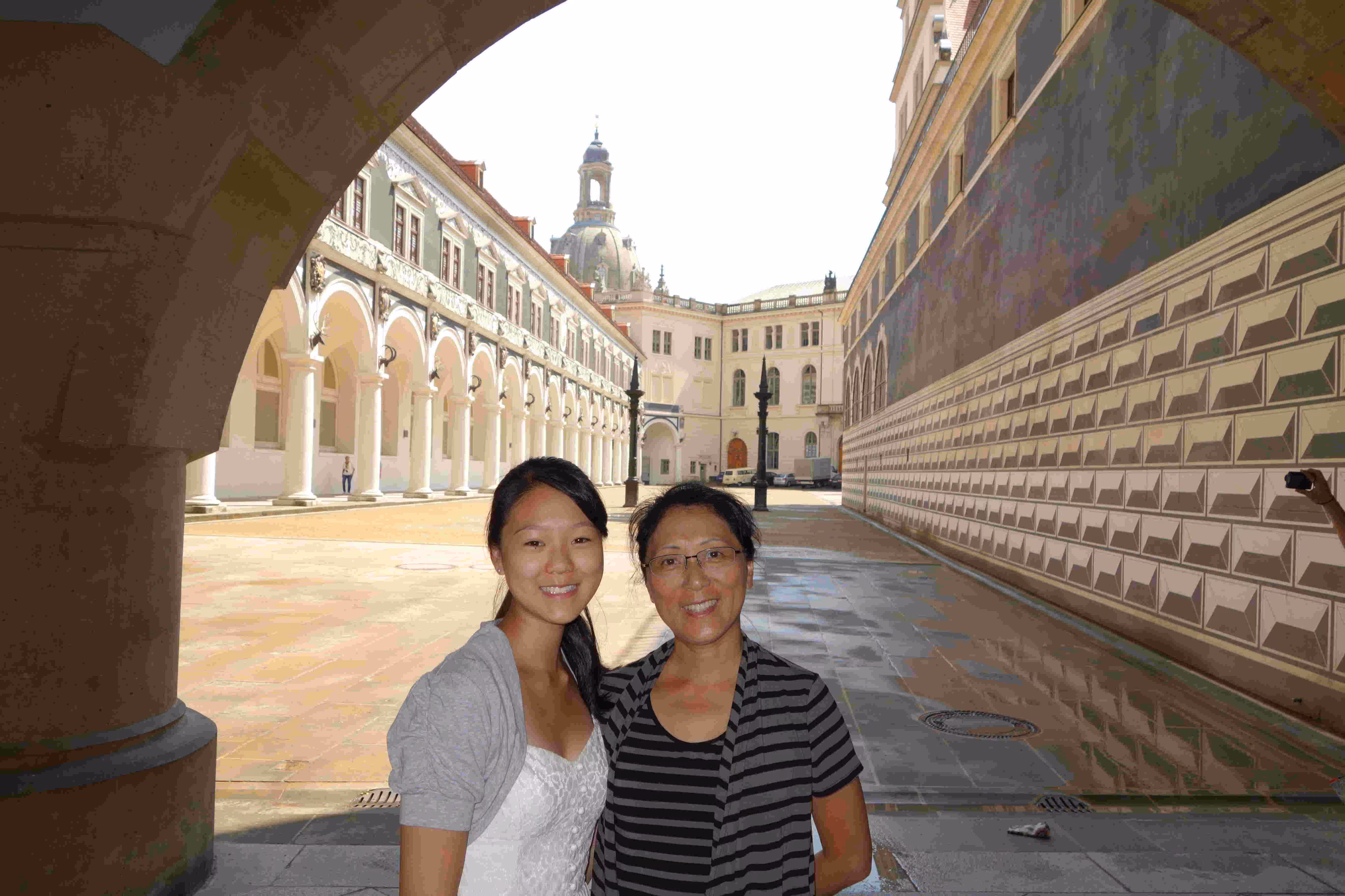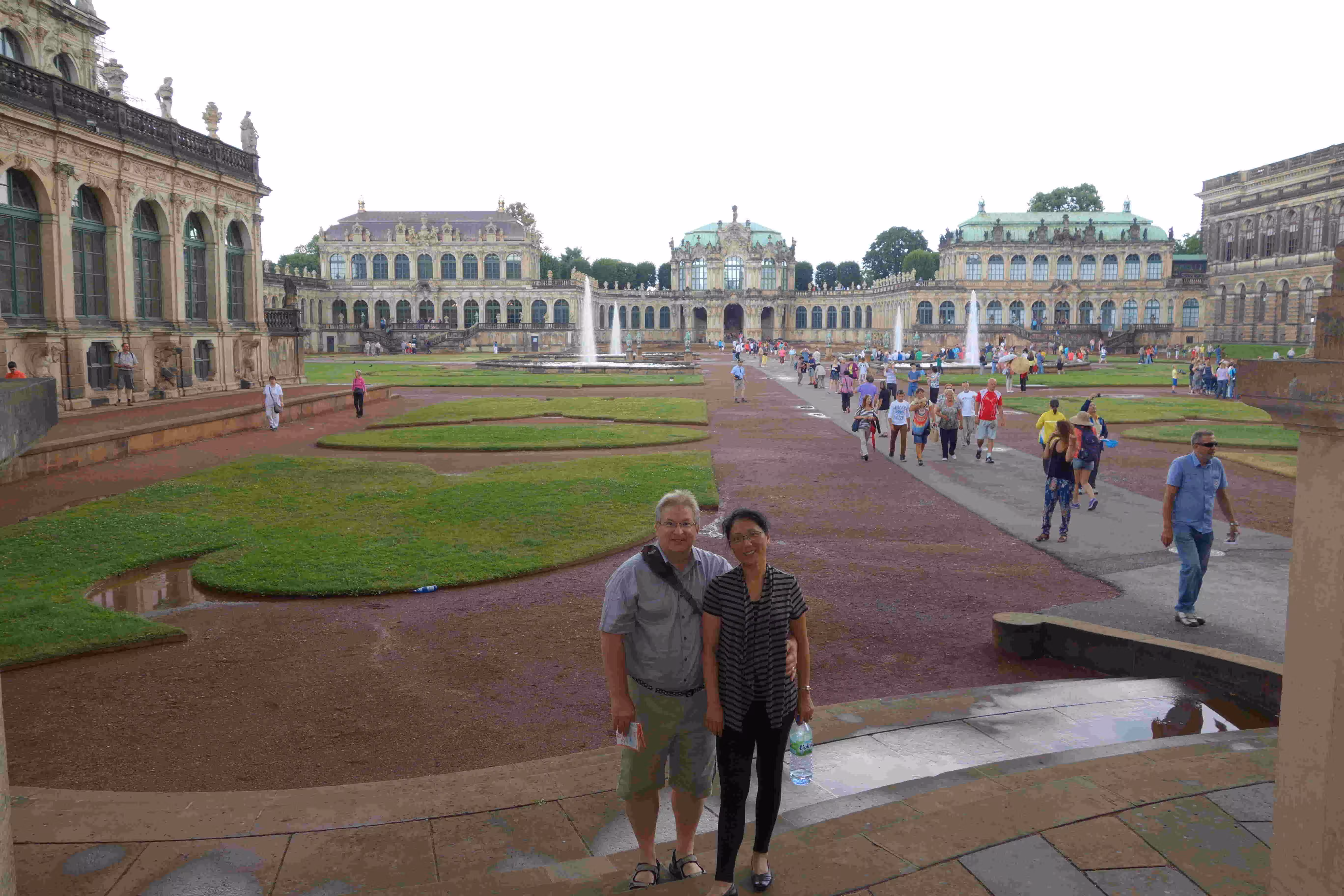 We woke up before 9am this morning in order to have breakfast and catch our 12:46pm train to Dresden. We had coffee and pastries at a nearby cafe. The sky was covered this morning and a light rain was falling. We took advantage of our Eurail pass to get from our hotel to the Central train station. At the station, we noticed a train departure for Dresden on track 11 at 11:42 but we also noted another departure screen suggesting that our departure was from track 3 at 11:46. At the last moment, we heard an announcement indicating that the Dresden train was departing from track 11. With only 2 minutes left, we made a crazy dash from track 3 to track 11 โ two floors away. We barely made it on board. We never knew Jenny could run this fast while towing a large suitcase behind her. We arrived at the Dresden train station, one hour and half later on. We had a short walk to our Ibis Lilliben hotel โ the 3rd Ibis Hotel tower along our walkway. Jenny and Victoria were excited to see all the shopping stores around our hotel. While enjoying some tasty sausages on a bun, we agreed to split up again for a few hours. The laddies were eager to do some shopping while I rented a bicycle to explore the streets of Dresden for an hour. With the shopping crave satisfied, we headed out for supper at a popular German restaurant. The food was different and the service was slow but nonetheless we enjoyed our visit. When time came to leave this underground restaurant, we realized that the rain was pouring down. After encouraging Jenny, we ventured out in the rain and walked swiftly back to our hotel. We were disappointed that our hotel did not offer any free WiFi from our room.