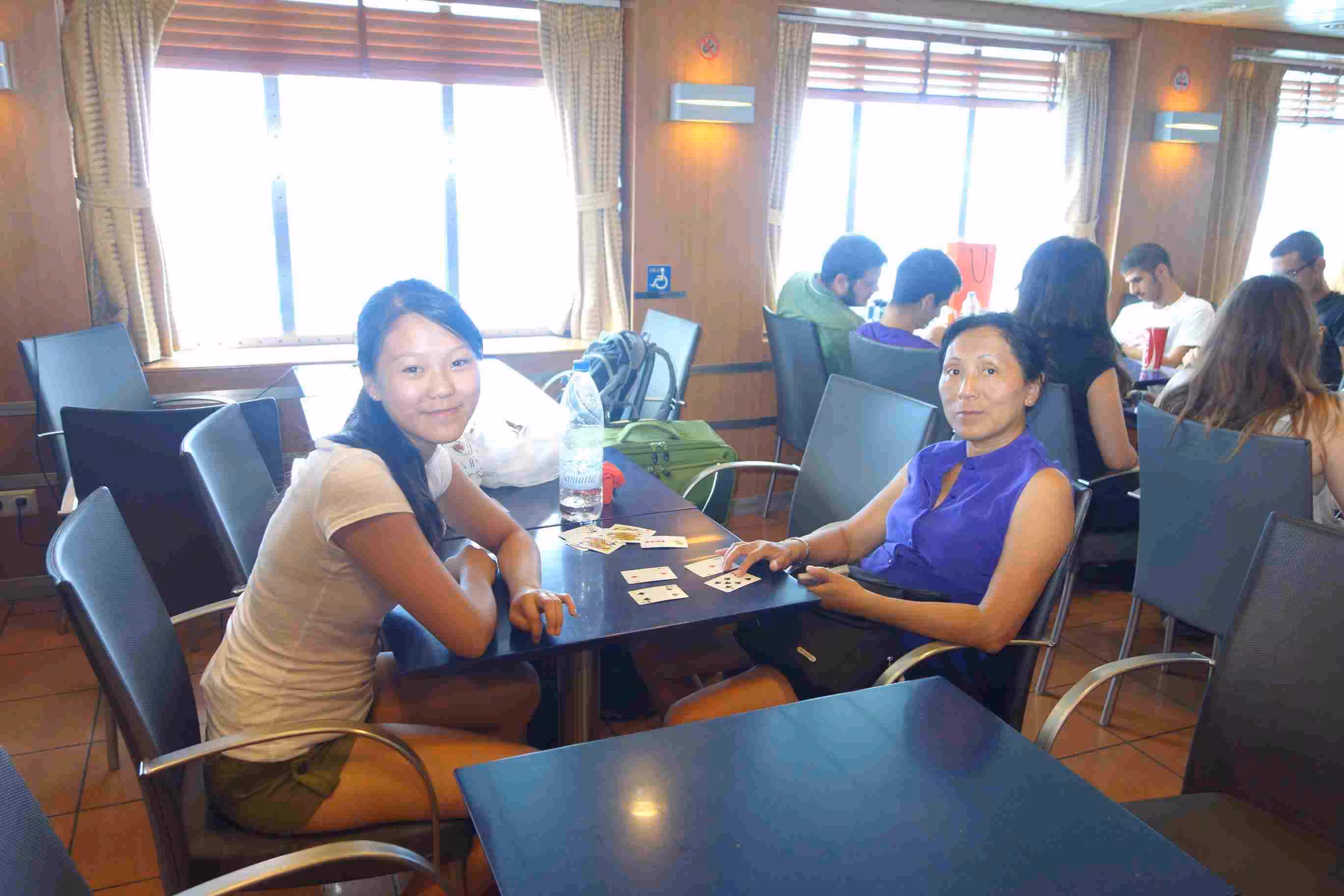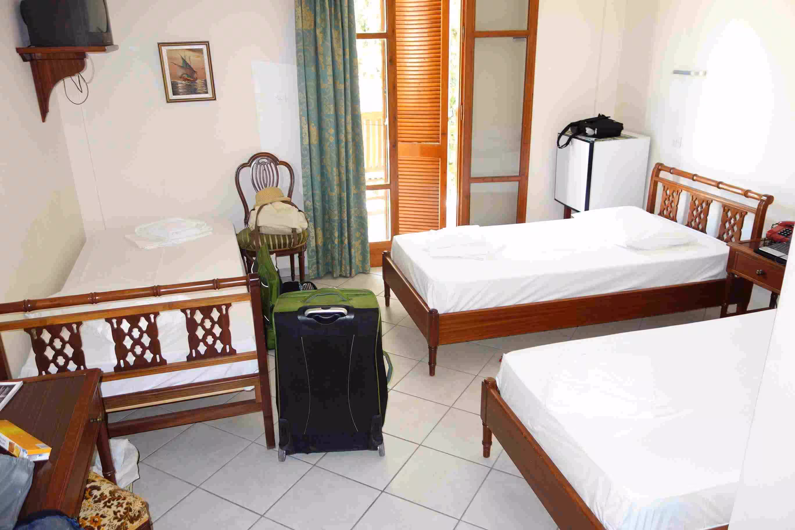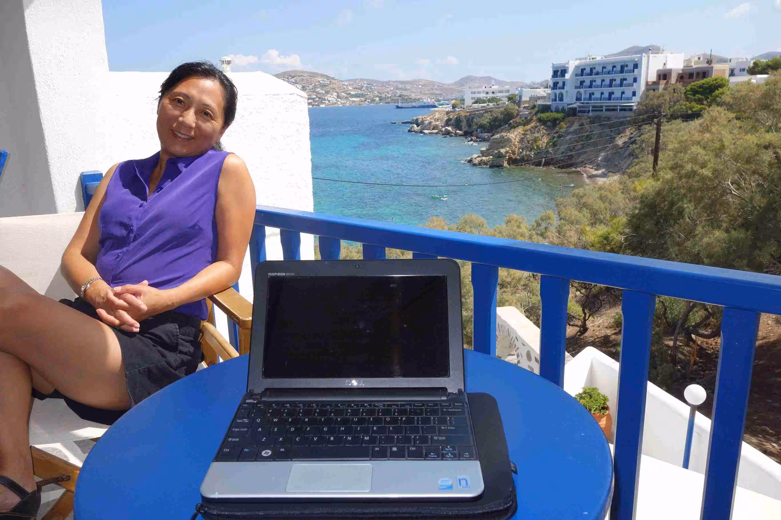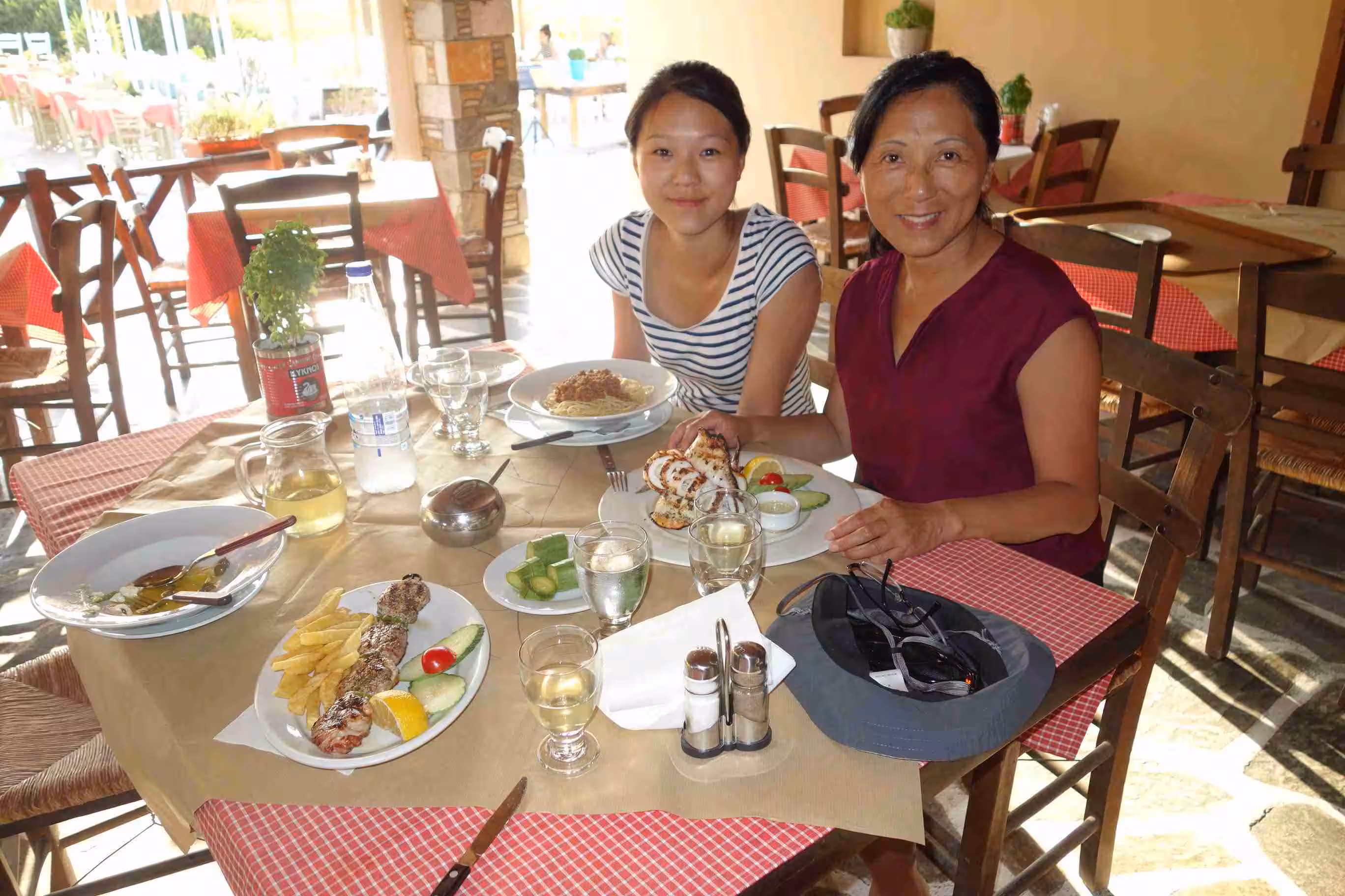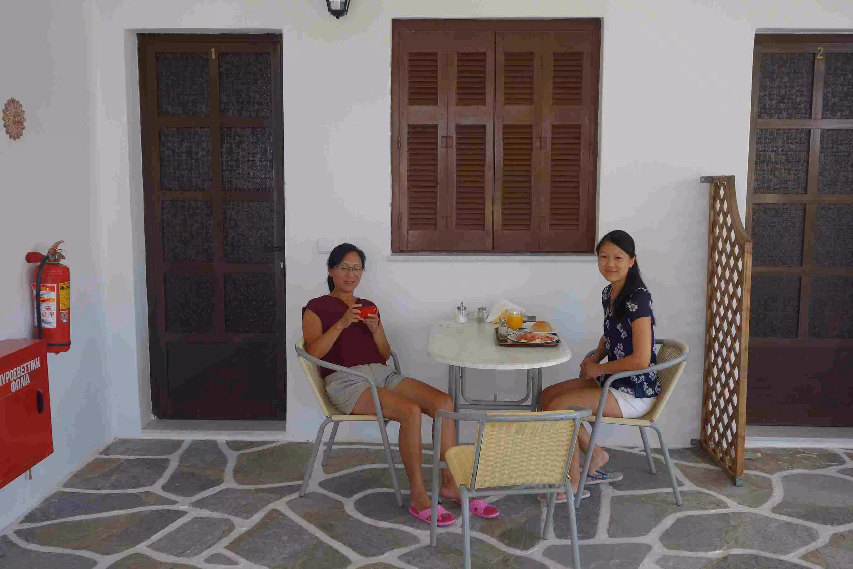 We had an early wake-up at 5am as we had to commute to Pirareus for our 8am departure to Syros. We checked-out of our hotel after reluctantly paying our stay in cash. We took the 5:30am subway and quickly made our way to the Pirareus dock. We stopped at the nearby ATM for another cash withdrawal. We boarded our first large ferry boat (Naxios) as we arrived in the E7 dock area. It appeared like the ferry was fully reserved. When we boarded, we did not pay attention to the sun’s direction and as result we got baked on our seat facing east. The four hours ferry sailing appeared fairly long (and warm) to us. Upon our arrival at the Syros dock, we inquired about the bus service to the small town of Galissa. We waited 30 mins for the bus scheduled for 12pm. The dock area was rather chaotic traffic as a result of the ferry passenger disembarkation. We arrived in Galissa and easily found our hotel, Hotel Maistrili, which was located very close to beach. After settling into our room, we had a quick lunch of pita souvlaki. After that, we headed to the beach which was very nice and not too crowded. We settled in the shade of a tree using our camping mattress. Jenny and I enjoyed very much the water while Victoria stayed on the beach. We had supper at a nearby restaurant. The hotel staff appeared to sympathize with our Booking.com constraint, but they insisted they could not do much to help. The staff helped us to book a taxi for a pick-up at 7am the next morning as we needed to catch once again a 8am ferry – this time to Paros. We really enjoyed our nice balcony and super comfortable chairs. Jenny also appreciated the integrated clothes line for drying our clothes wash. Late in the evening, the hotel staff dropped by our room to give us some breakfast supplies since we would be missing the hotel breakfast tomorrow morning.