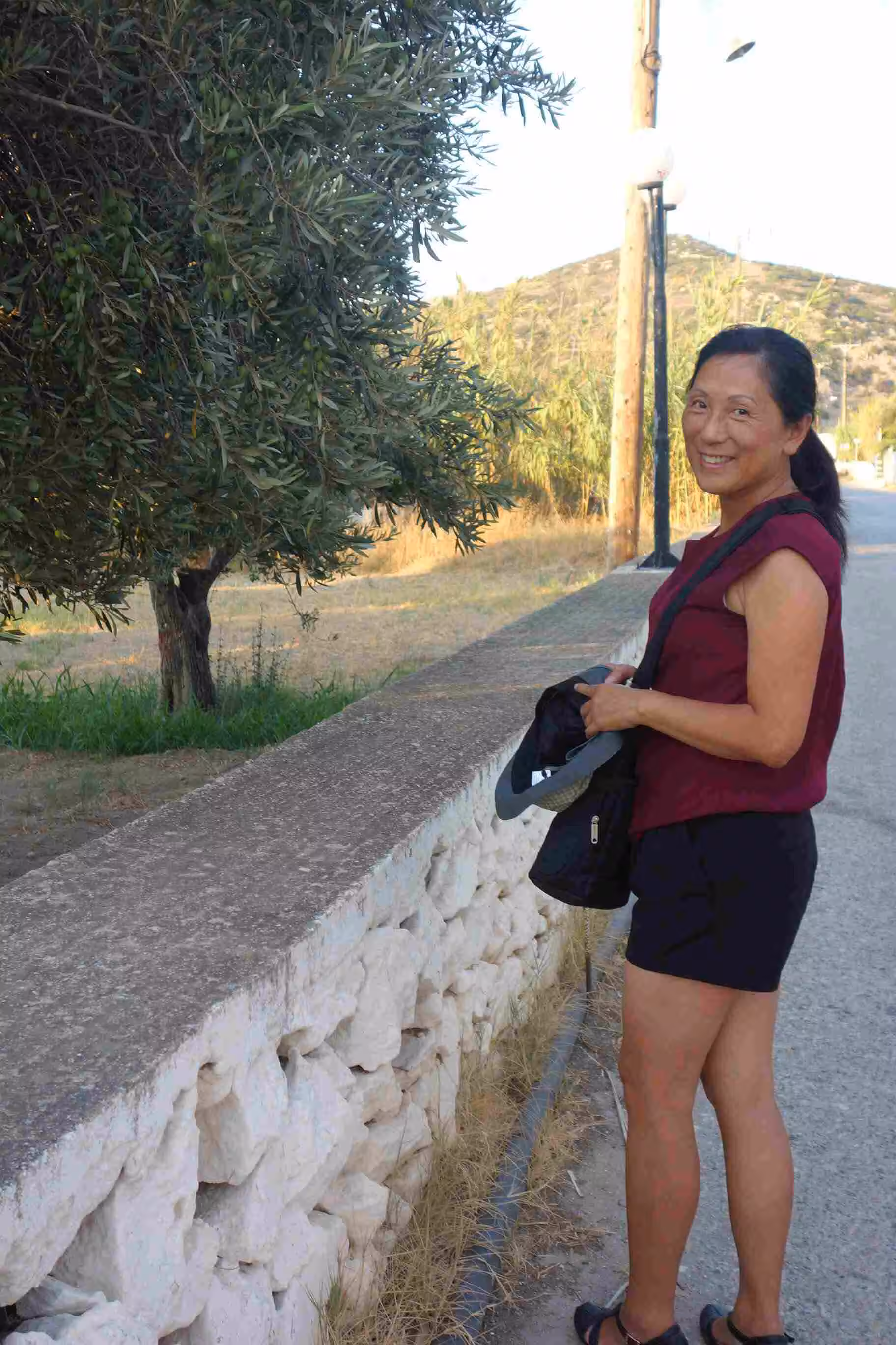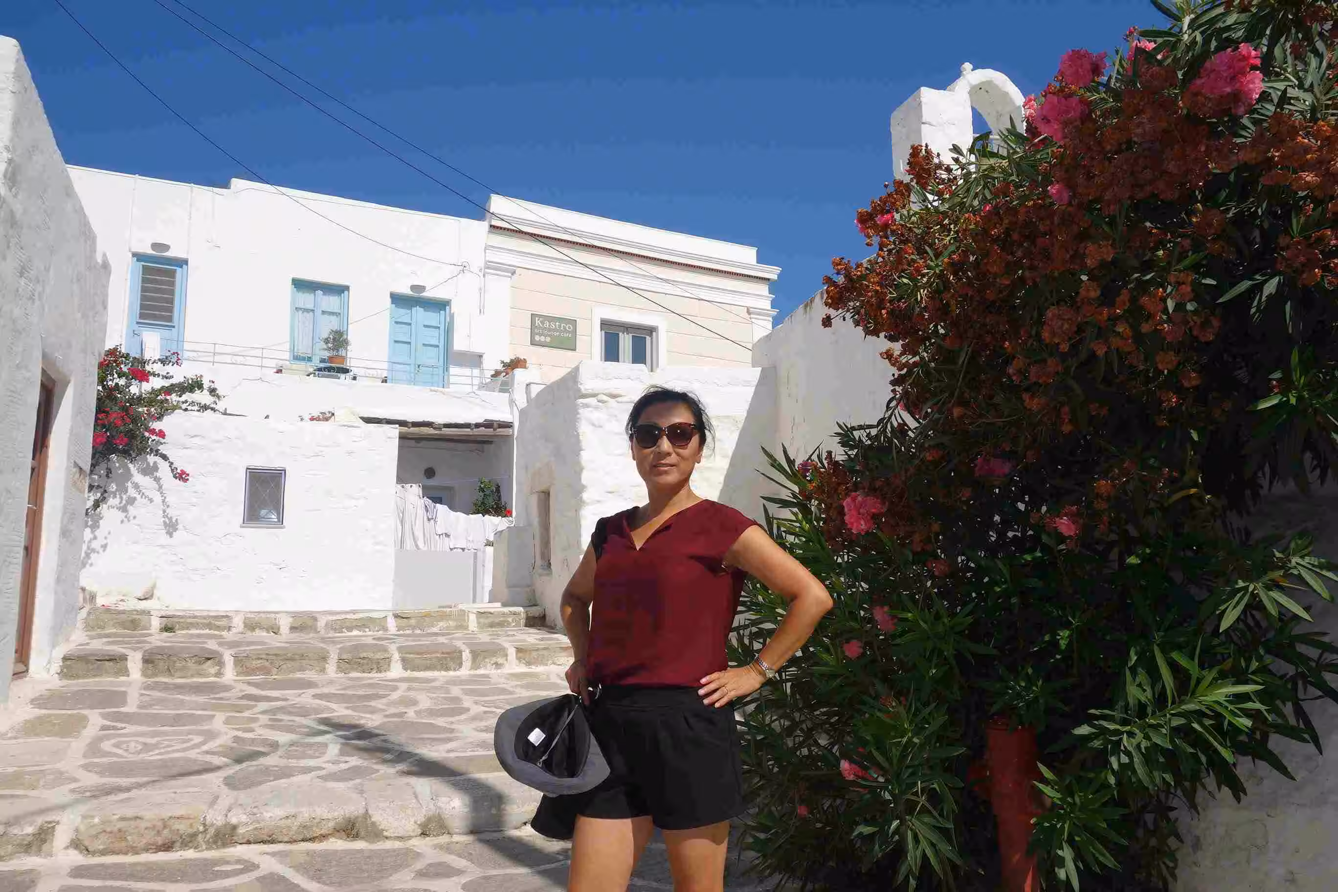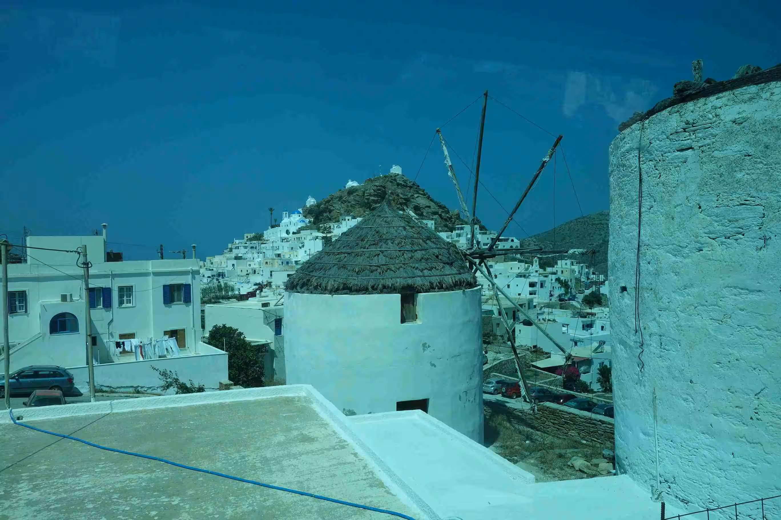 We had a nice breakfast at our hotel. We headed to the dock area to catch the 11:30am bus to the Manganari Beach. The 45+ mins bus ride was amazing. We kept on wondering how costly this paved road to the beach must have been. Once at the beach, we were more or less enticed to rent two sunbeds and an umbrella for 9 euros. This was the first time we splurged on beach rentals as in the past we had always managed to simply rely on our camping mattress and some tree shade. The beach sand was one of the finest we had seen and the water was clear and beautiful. After some time in the water, we ordered take-away panini sandwiches from the beach restaurant for lunch. Jenny was afraid of missing our 5pm bus back to town – so we dried-up around 4:30pm. We waited beside our bus until its doors opened to let the passengers board. The drive back to town offered once again some amazing views – unfortunately the road would also make for very strenuous cycling. Back at the hotel, we showered and walked up the ancient steps to Chora for supper at Neil’s Restaurant. We wrapped-up the day by walking down the ancient steps to our hotel. A great beach day.
