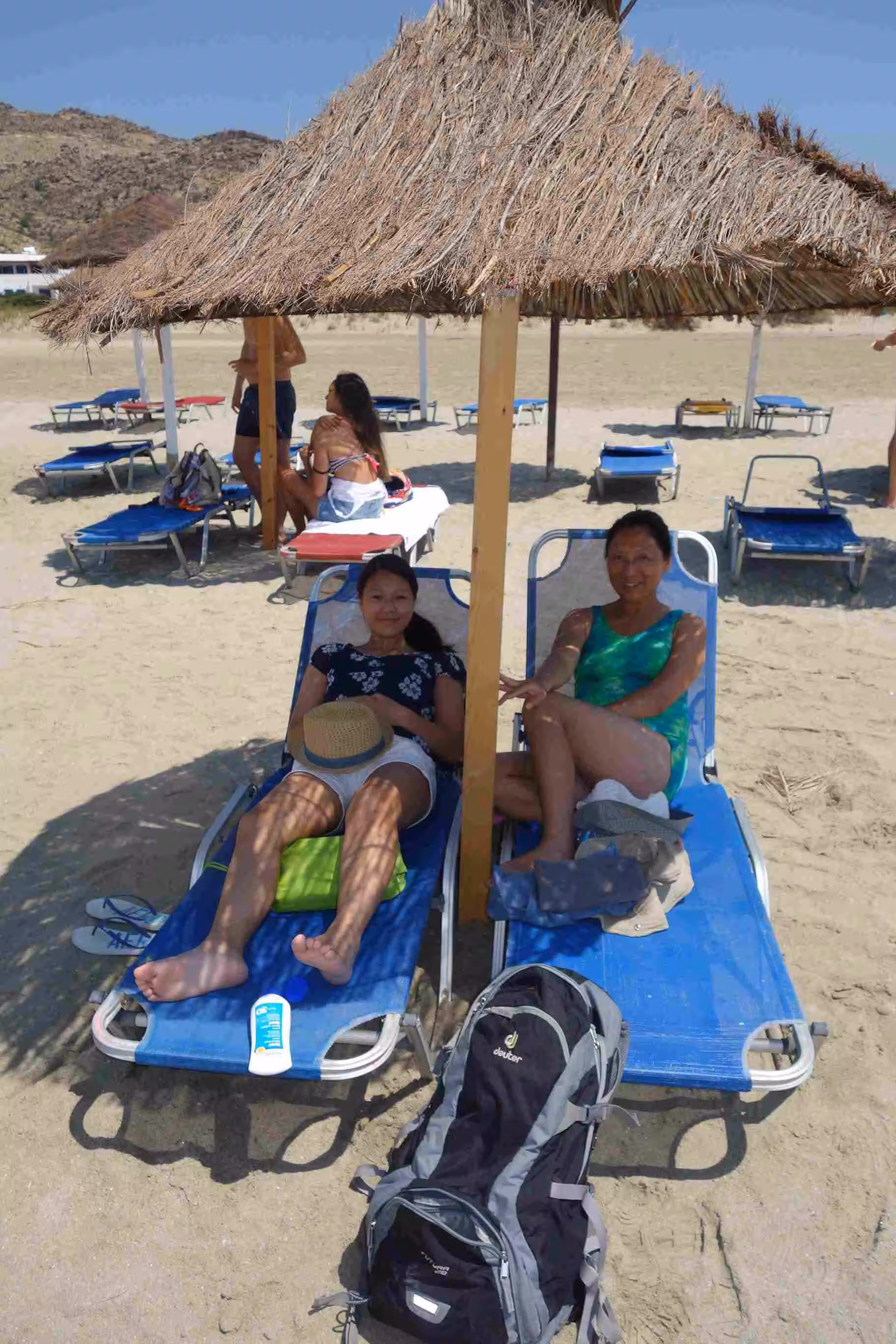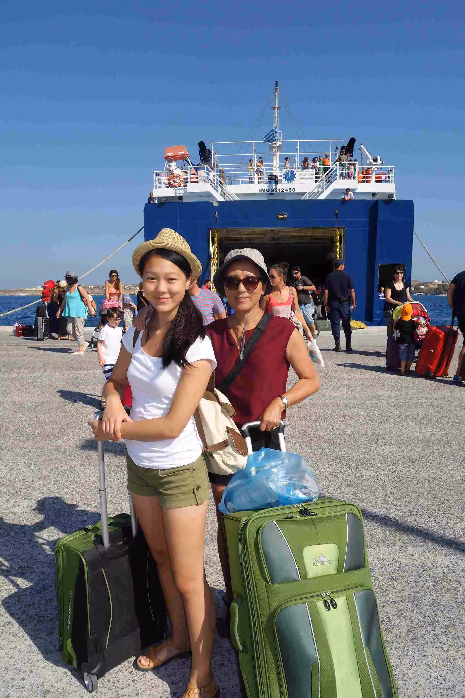 Although Nostos Studios offered pick-up and drop-off services, it appeared Dina was booked for 11am hence we opted to walk from our hotel to the dock for our 12:45pm ferry to Ios. Although the sun made us for a warm walk, we managed to get to the dock without a big sweat. As usual the dock appeared very chaotic with some many people queuing for the ferries. We discovered that most were headed somewhere else than Ios. Once we boarded our Blue Star Ferry (Itako), we seated ourselves at the snack bar court where I wrote up earlier parts of our trip journal. The 2.5 hours crossing went by fairly quickly. At Ios, we were greeted by our hotel owner/host which promptly picked up our bags and gave Jenny and Victoria a ride in his car to the hotel. The hotel was fairly close to the dock. Our Hotel Helena owners/hosts were very friendly and provided us with some good tourist info. After spending a bit of time at the nearby beach, we understood why the owner encouraged us to take a day trip to the Manganari Beach. The beach sea bed was mostly covered with weeds. In the evening, we took the local bus up to Chora, the village built on the side of the mountain. We discovered the village was composed of narrow white alleys crisscrossing the village. The area reminded us a bit of Venice. It took a bit of trial and error navigation before finding the Thai Smile restaurant. Who would think that you could eat some of the best Pad Thai on a Greek Island? Later we took the long and enjoyable Ancient Steps down to our hotel area. Before going to bed, we had agreed to visit Manganari Beach the next day.