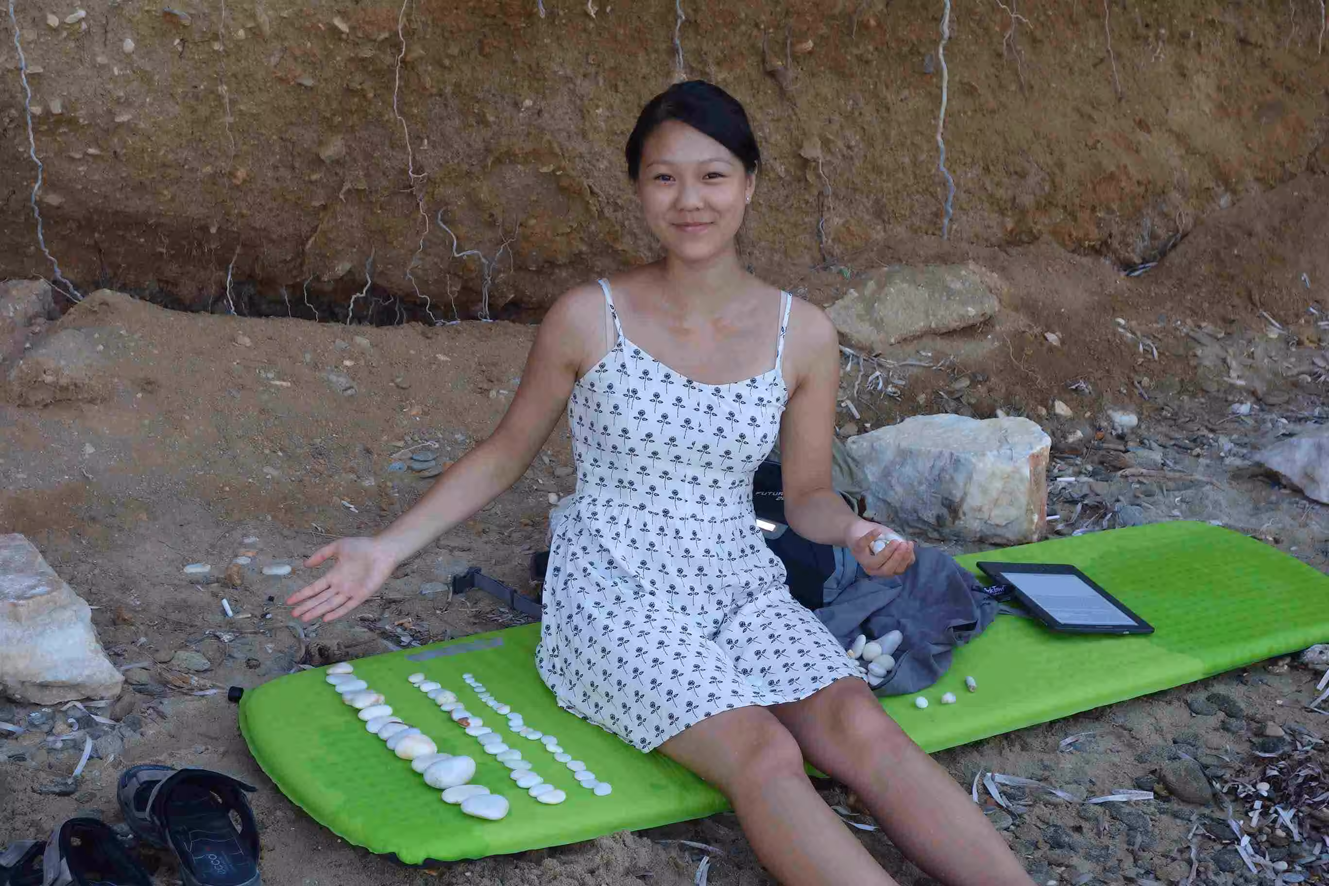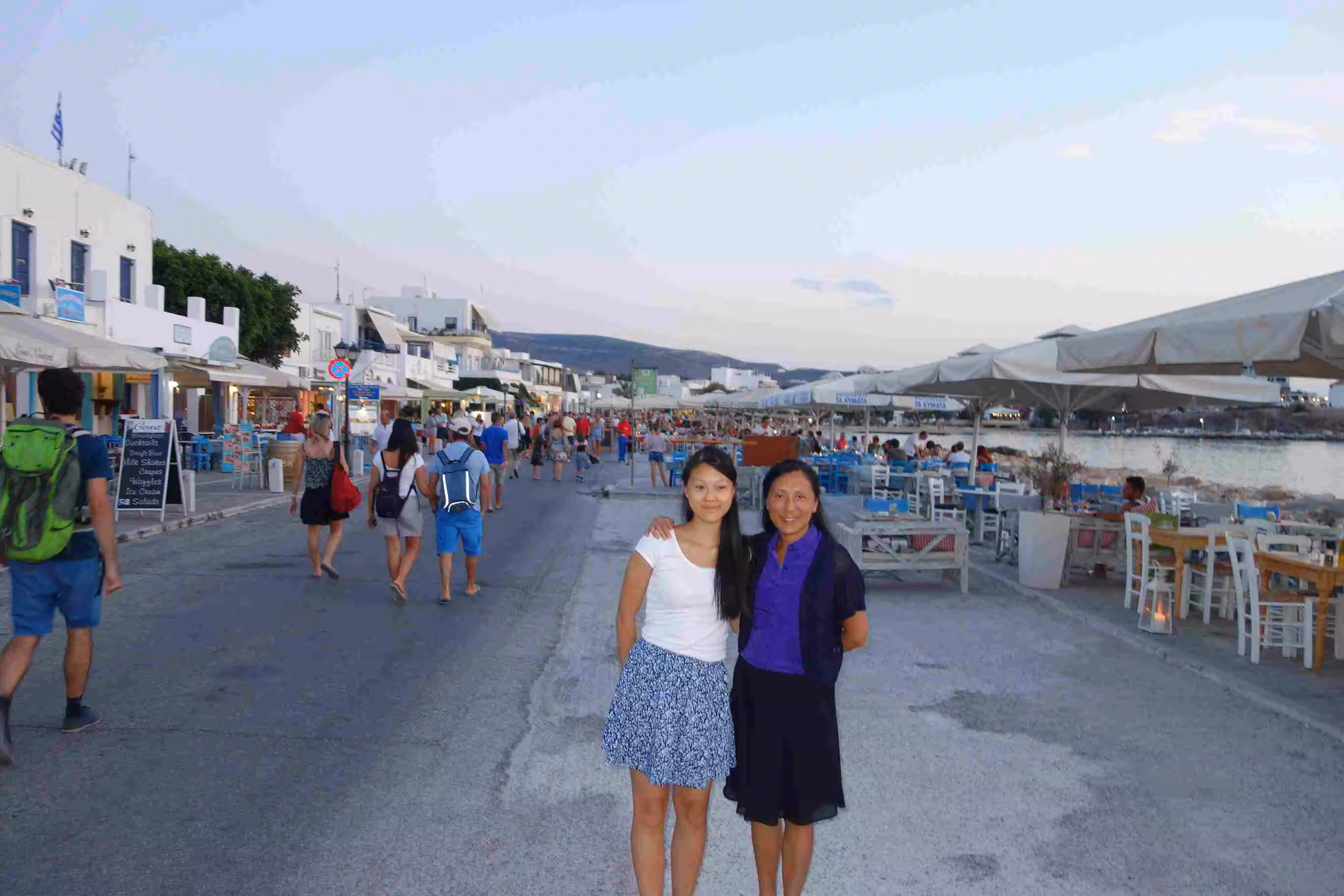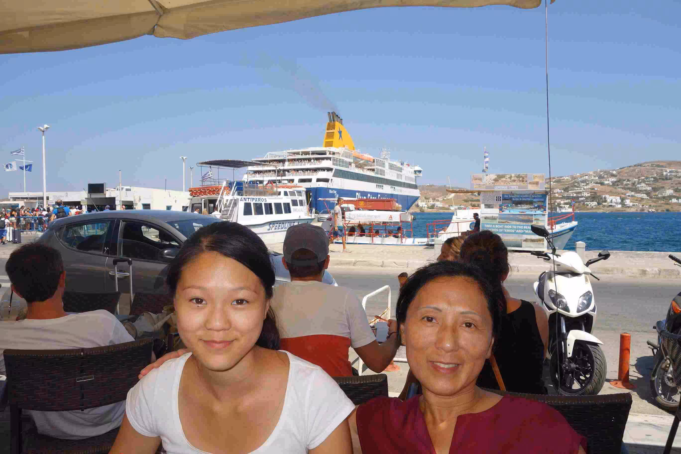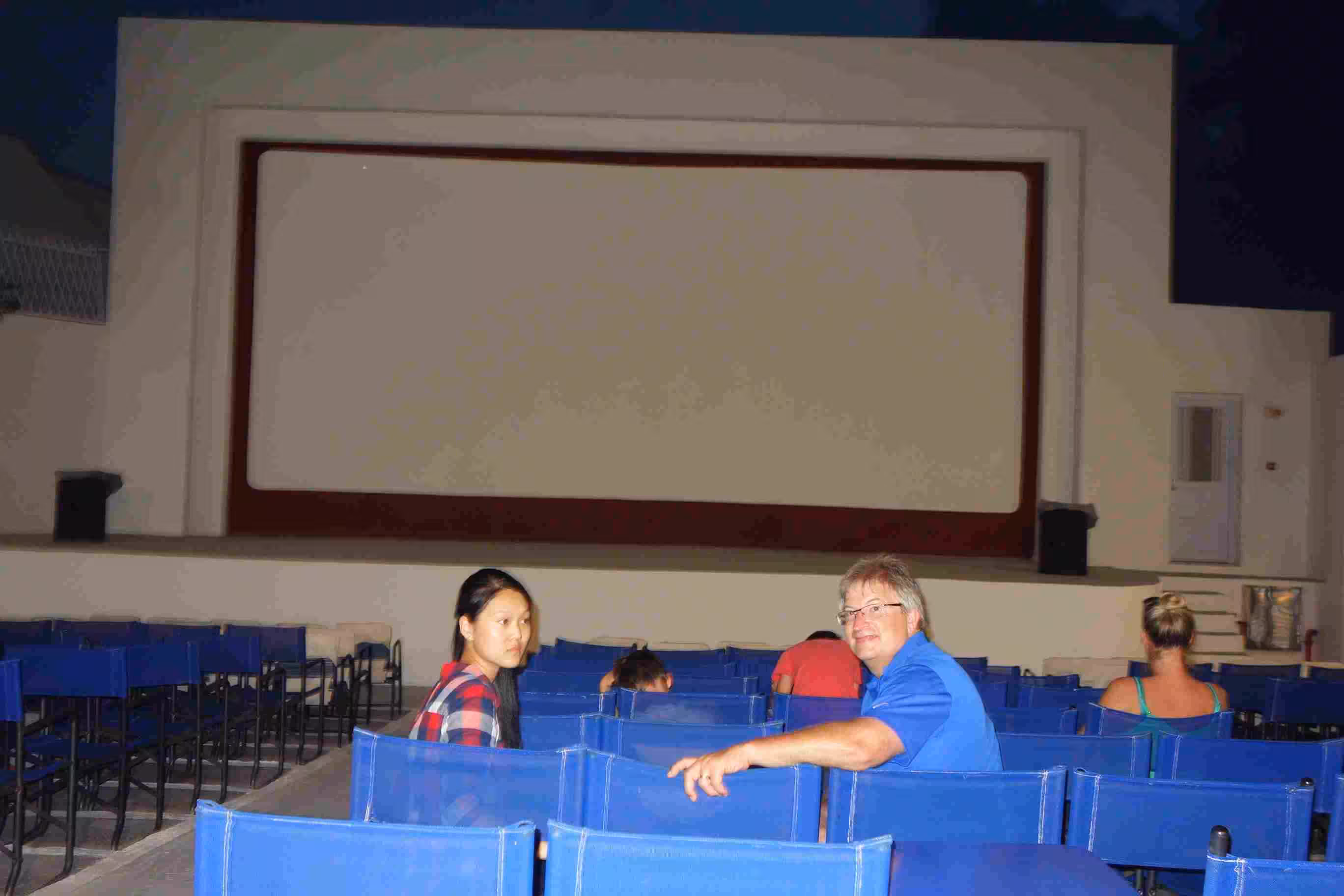 We had a slow morning wake-up. We walked out of the hotel for breakfast at one of the many cafe on seafront. The service was a bit slow but we were clearly not in any rush. Jenny and Victoria headed out for more boutique browsing while I sipped another coffee at a sidewalk cafe. We were back at the hotel for our checkout from the Dina Hotel which we were only able to reserve for one night. The rest of our stay in Paros would be at Nostos Studios which coincidentally was owned by another lady named Dina. Dina #1 escorted us to our meeting point to be picked up by Dina #2 as per our email exchange from yesterday and earlier in the morning. After greeting Dina #2, we packed our luggage in her small Fiat and she drove us to her hotel along a major road out of Paros. Dina and her parents greeted us very nicely. Jenny was initially disappointed with the room, namely because we had steps down to our room. She eventually got use to the room after I agreed to sleep on the bed off the kitchen area. After settling in, Jenny and I took a walk down the road to assess the commodities available in this area. We identified a few bakeries, groceries and more importantly the location of the cinema Rex. We bought a few groceries on way back to the hotel. We headed to the beach in front of our hotel to cool down. Although the beach was not sandy, the pebbles on the beach were very inviting. Jenny and Victoria spent a lot of time collecting the best white pebbles they could find. Back at our room, we showered before walking back into town. Although the walking distance was not really far, the road was subject to a lot of speeding traffic and no sidewalks. We stopped for our evening meal at the closest restaurant we encountered. After our meal, we walked around until we felt it was time to walk over to the outdoor cinema. The cinema was already opened by the time we arrived. It was our first outdoor cinema experience – just like the drive-in, but without the car. We watched Transformer 4 which was a long movie that required two intermissions. After the movie, we had no problems walking back to our hotel even after 11pm.
