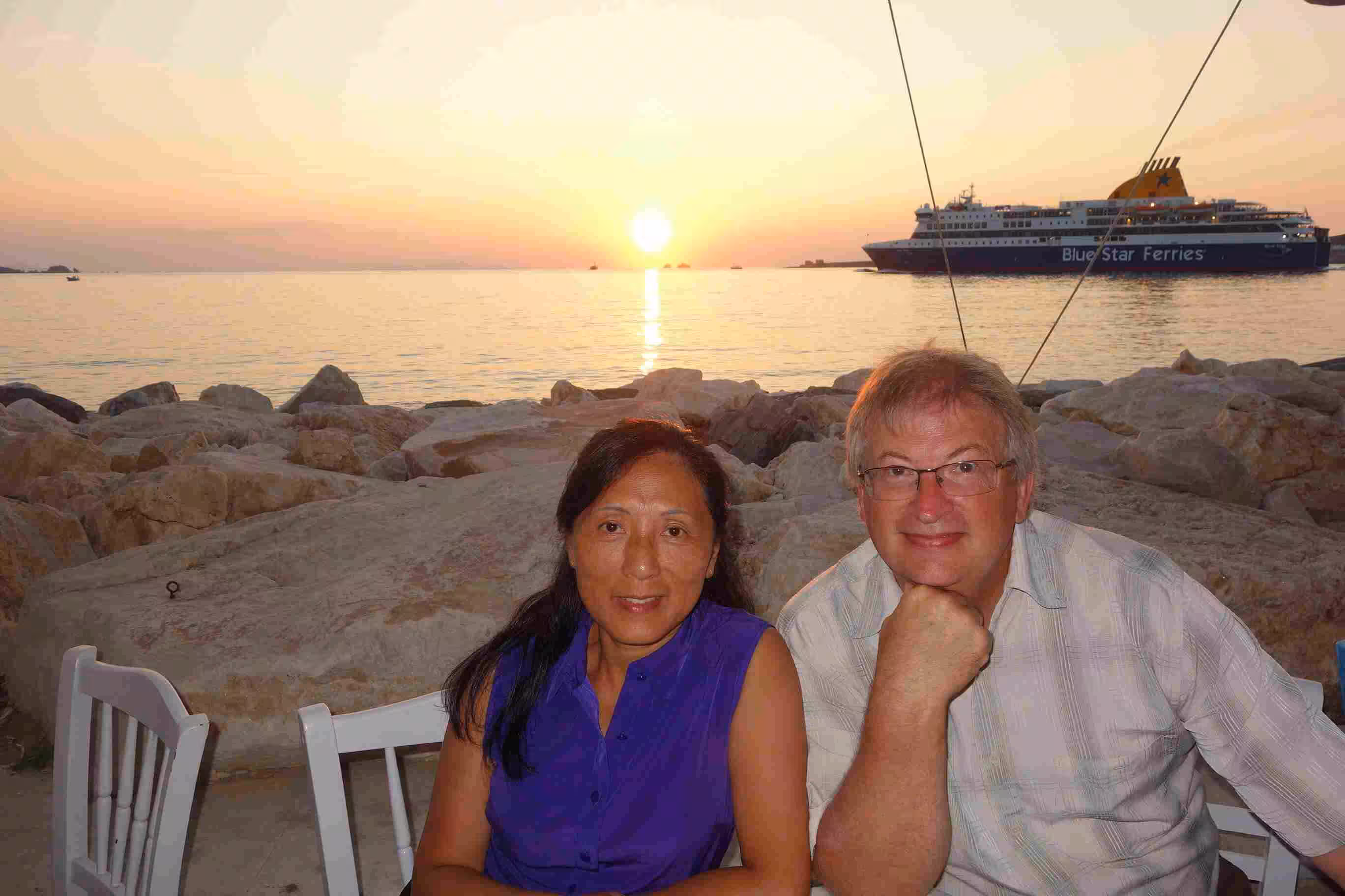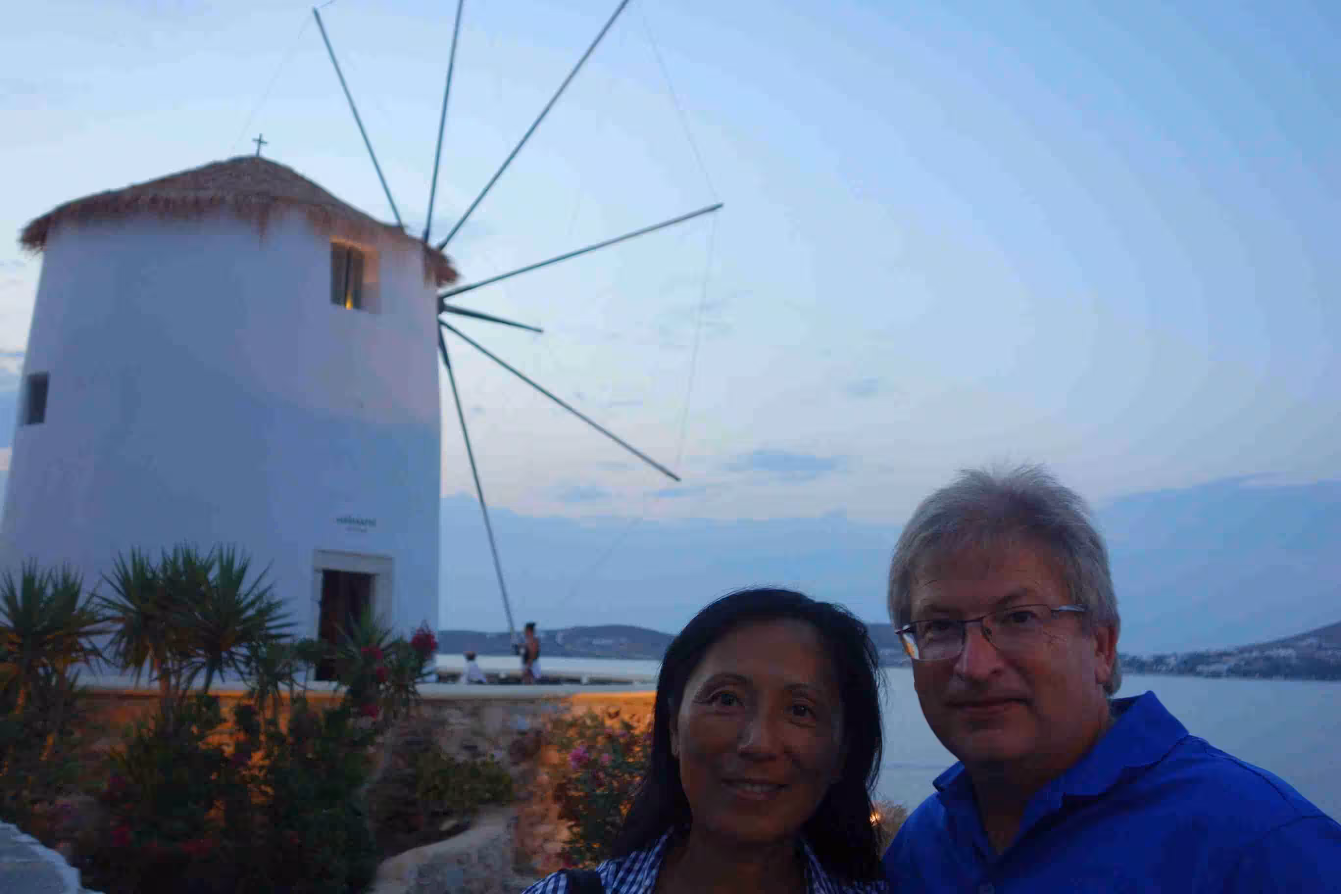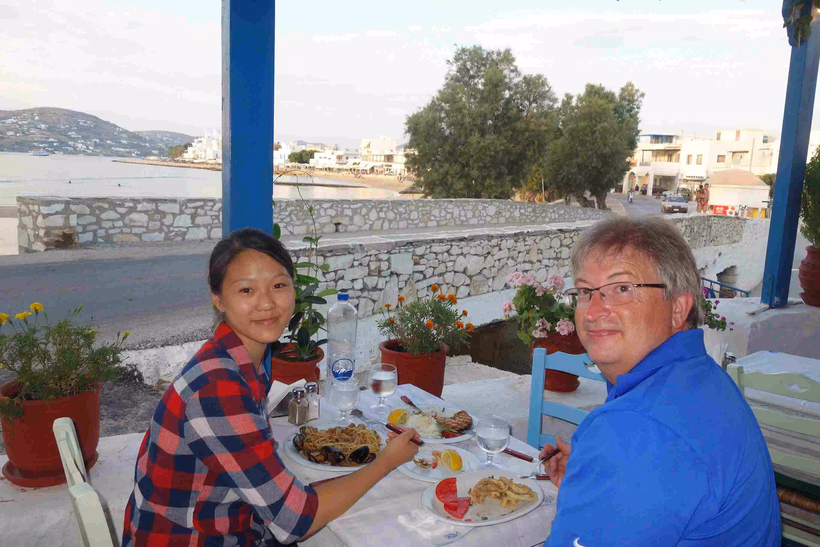 We woke up in plenty of time to pack our luggage and step outside for our 7am taxi. A quick ride into town, we were dropped off at the dock in front of our ferry to Paros. This smaller ferry boat offered more comfortable seating than our first ferry boat. The crossing took less than 2 hours. As we arrived in Paros, we headed to our short one night stay at Hotel Dina, in the heart of town. The narrow maze of alleyways reminded us of Venice. Our host Dina allowed us to drop off our luggage until we could check-in later in the afternoon – as it was not even 10am yet. We enjoyed walking the alleyways filled with boutiques along Market St – our hotel’s pedestrian street. Jenny allowed herself to be tempted by a silver necklace. We had coffee at the dock while we observed the various ferry boats getting unloaded and loaded. At 1pm, we returned to our hotel to check-in to our room. The hotel and room were immaculately clean. After resting until 4:00pm, we headed to the beach for a swim. The water was a bit colder than in Galissa, but still warmer than in Corfu. Back at the room, we showered and set out for supper a Taverna Mira located right beside the sea. We marvelled at the sunset. Although we had expected to catch an outdoor cinema this evening, we discovered that cine Rex was some distance from our current location. Hence, we opted to wait until tomorrow. A very nice first day in Paros.