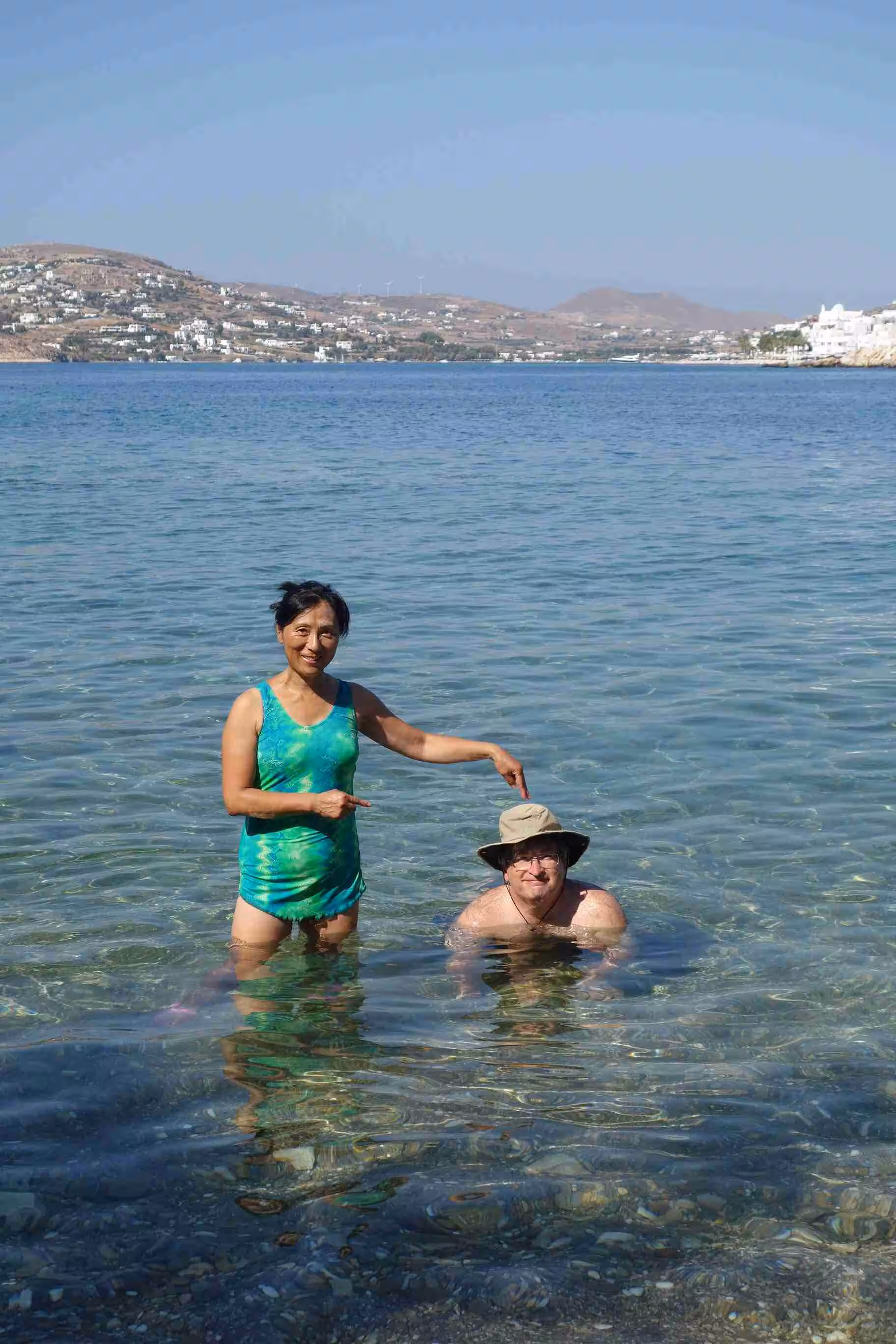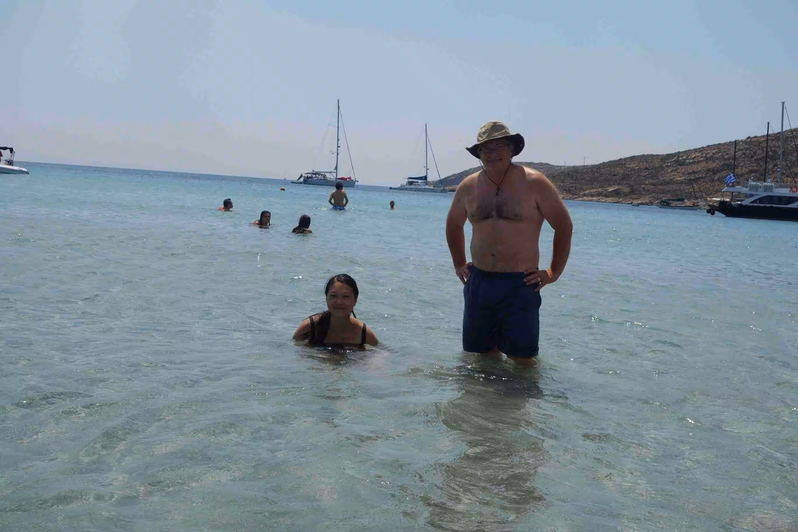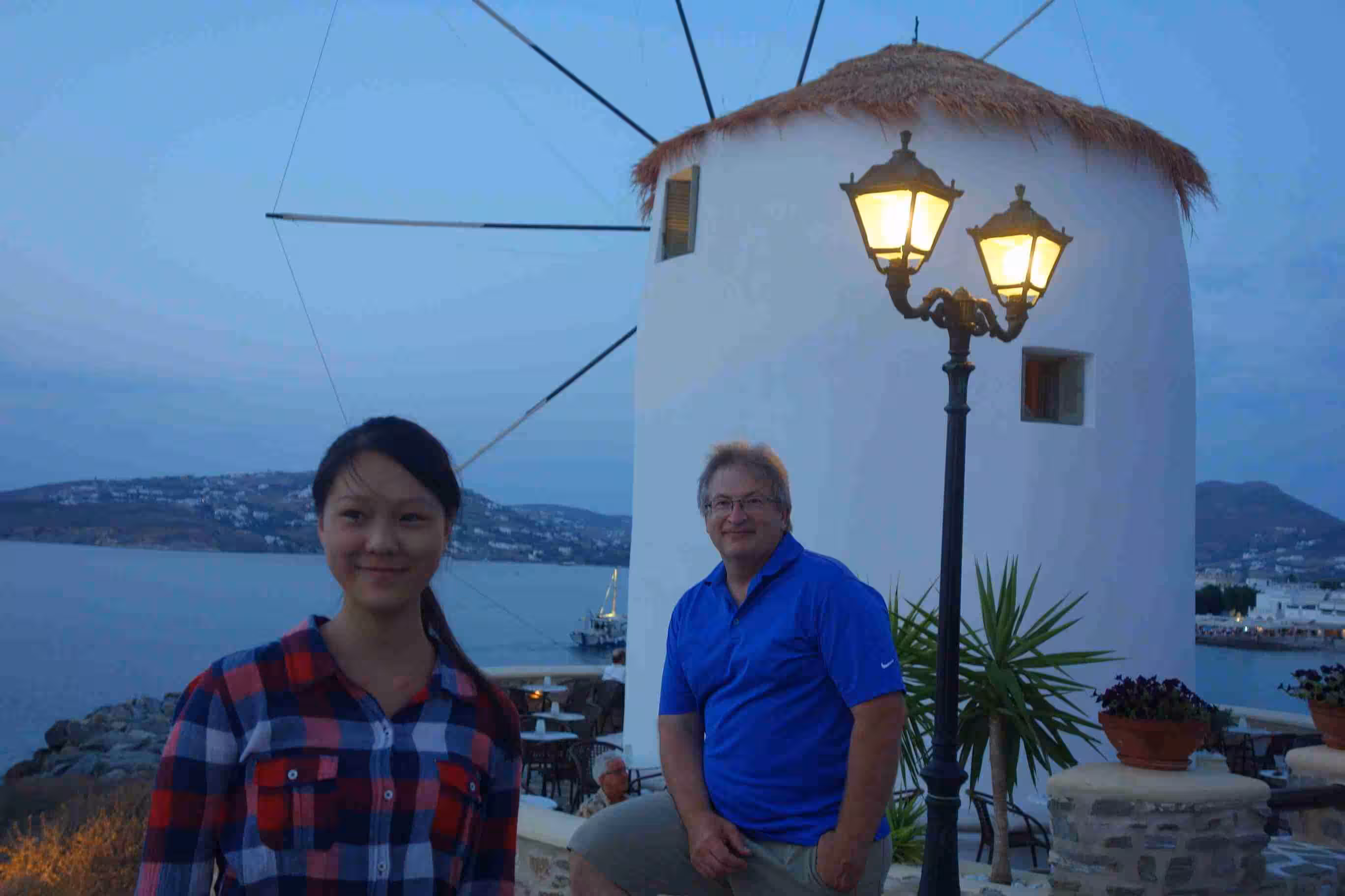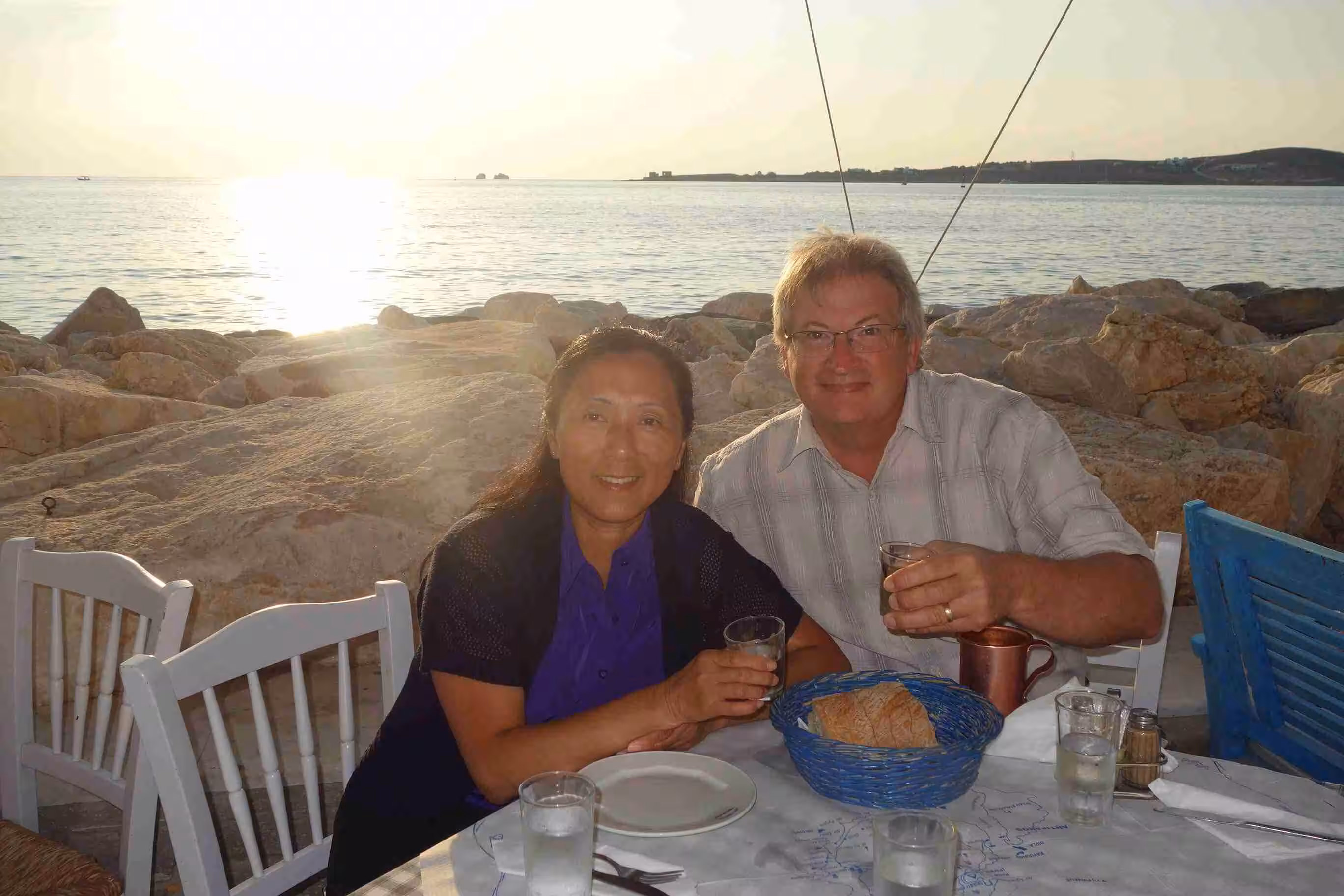 We woke up in plenty of time to pack our luggage and step outside for our 7am taxi. A quick ride into town, we were dropped off at the dock in front of our ferry to Paros. This smaller ferry boat offered more comfortable seating than our first ferry boat. The crossing took less than 2 hours. As we arrived in Paros, we headed to our short one night stay at Hotel Dina, in the heart of town. The narrow maze of alleyways reminded us of Venice. Our host Dina allowed us to drop off our luggage until we could check-in later in the afternoon – as it was not even 10am yet. We enjoyed walking the alleyways filled with boutiques along Market St – our hotel’s pedestrian street. Jenny allowed herself to be tempted by a silver necklace. We had coffee at the dock while we observed the various ferry boats getting unloaded and loaded. At 1pm, we returned to our hotel to check-in to our room. The hotel and room were immaculately clean. After resting until 4:00pm, we headed to the beach for a swim. The water was a bit colder than in Galissa, but still warmer than in Corfu. Back at the room, we showered and set out for supper a Taverna Mira located right beside the sea. We marvelled at the sunset. Although we had expected to catch an outdoor cinema this evening, we discovered that cine Rex was some distance from our current location. Hence, we opted to wait until tomorrow. A very nice first day in Paros.