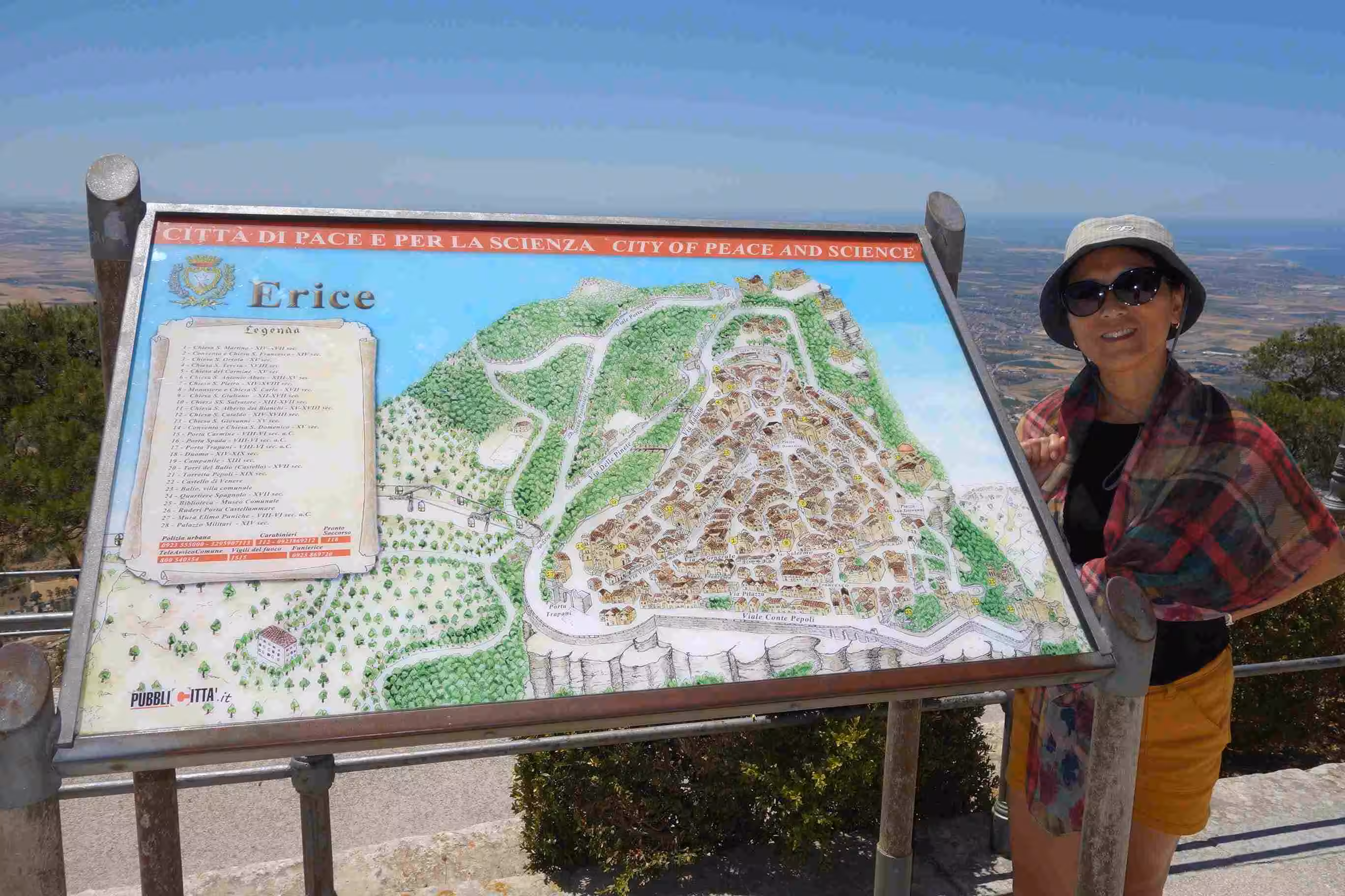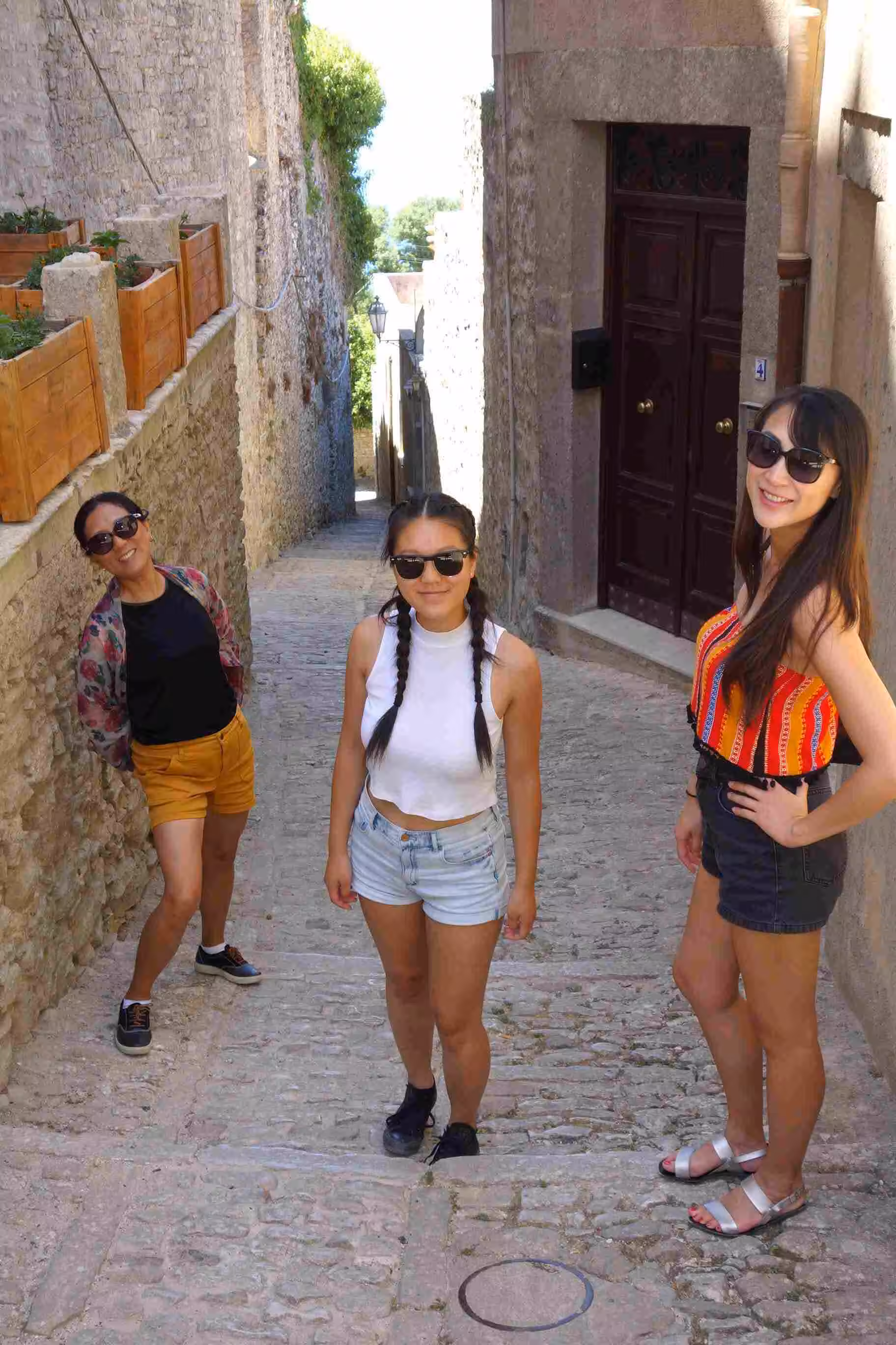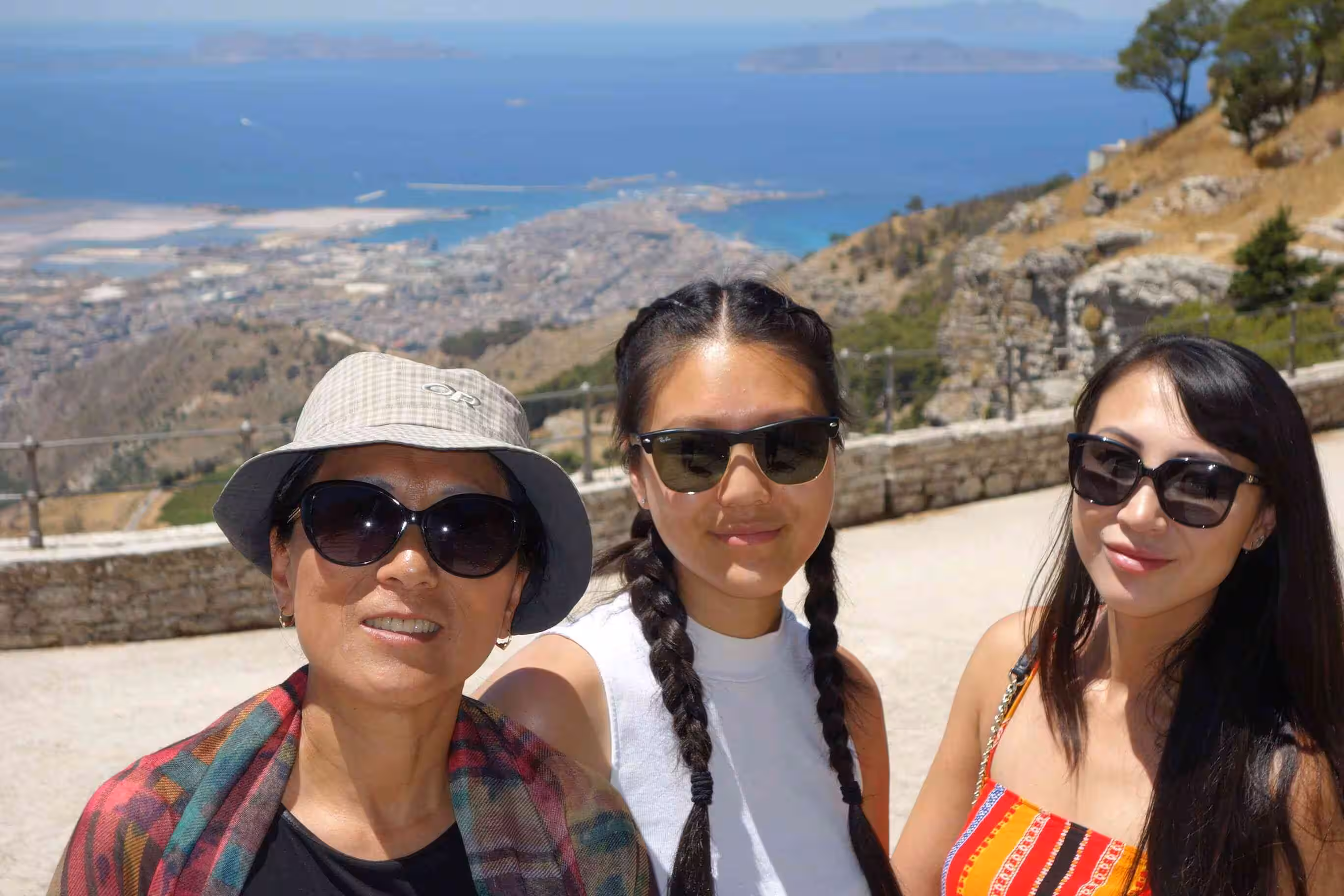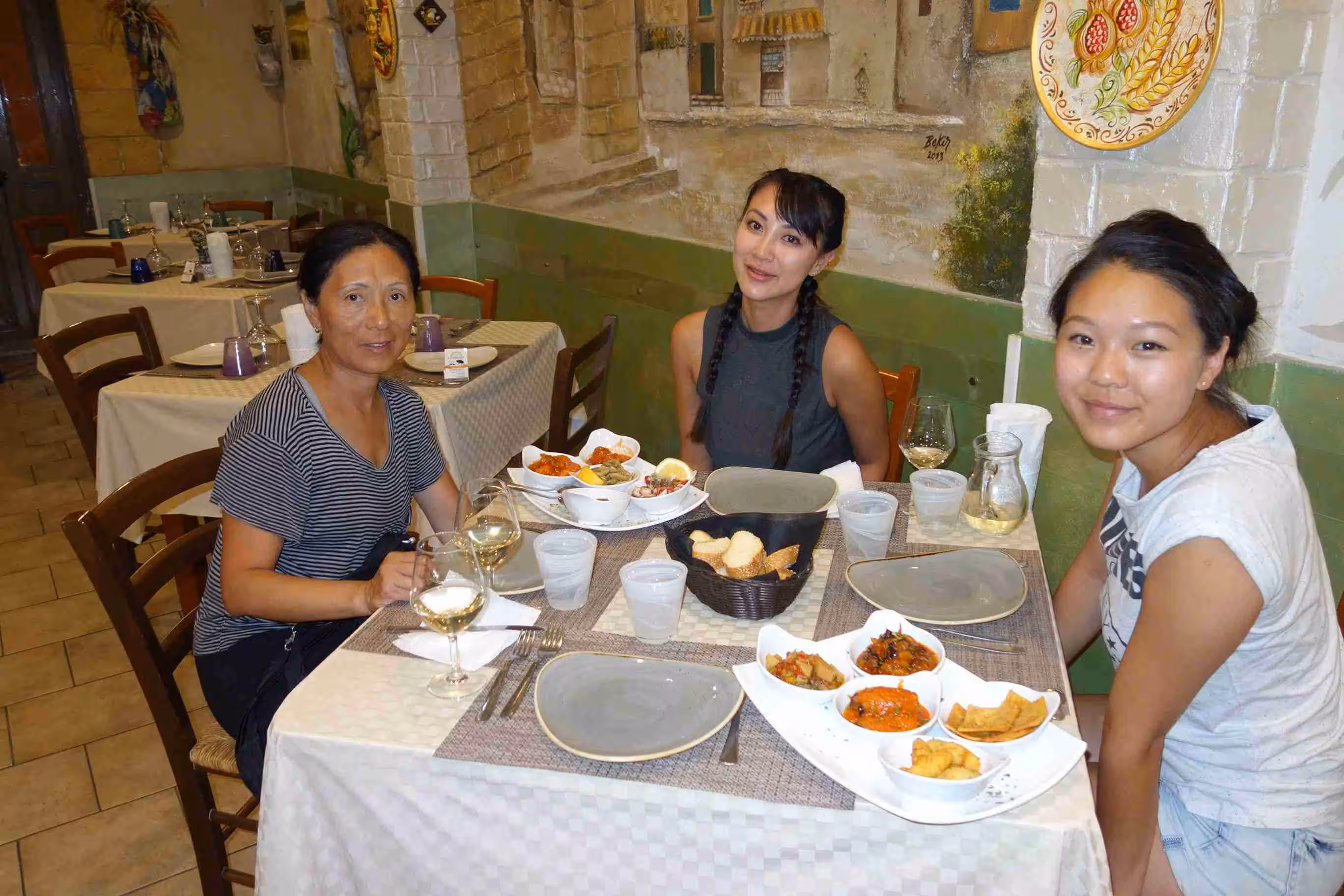 After having Jenny’s refreshing (i.e. non-continental) breakfast of scrambled eggs and bacon, we headed out to visit Erice, a medieval town high above Trapani. We could have taken a 40 to 60 mins bus ride all the way up there but instead, we opted to take a bus only to the edge of town (Trapani) and take a 10 mins. funicular ride up. After, we enjoyed strolling Erice’s cobblestone streets and taking in the views of the entire area. Along the way, Jenny stopped at a souvenir booth and pointed to her broken shoe lace, the shop owner was quick to offer her a hat matching her shoe lace! After having a snack of cannoli, we headed back to our apartment via the funicular and the bus. We rested a few hours before cooking our evening meal. Later on, we walked along the sea waterfront. Jessica convinced Victoria to go out to a local bar to enjoy a few late night drinks and have some good older sister chat.