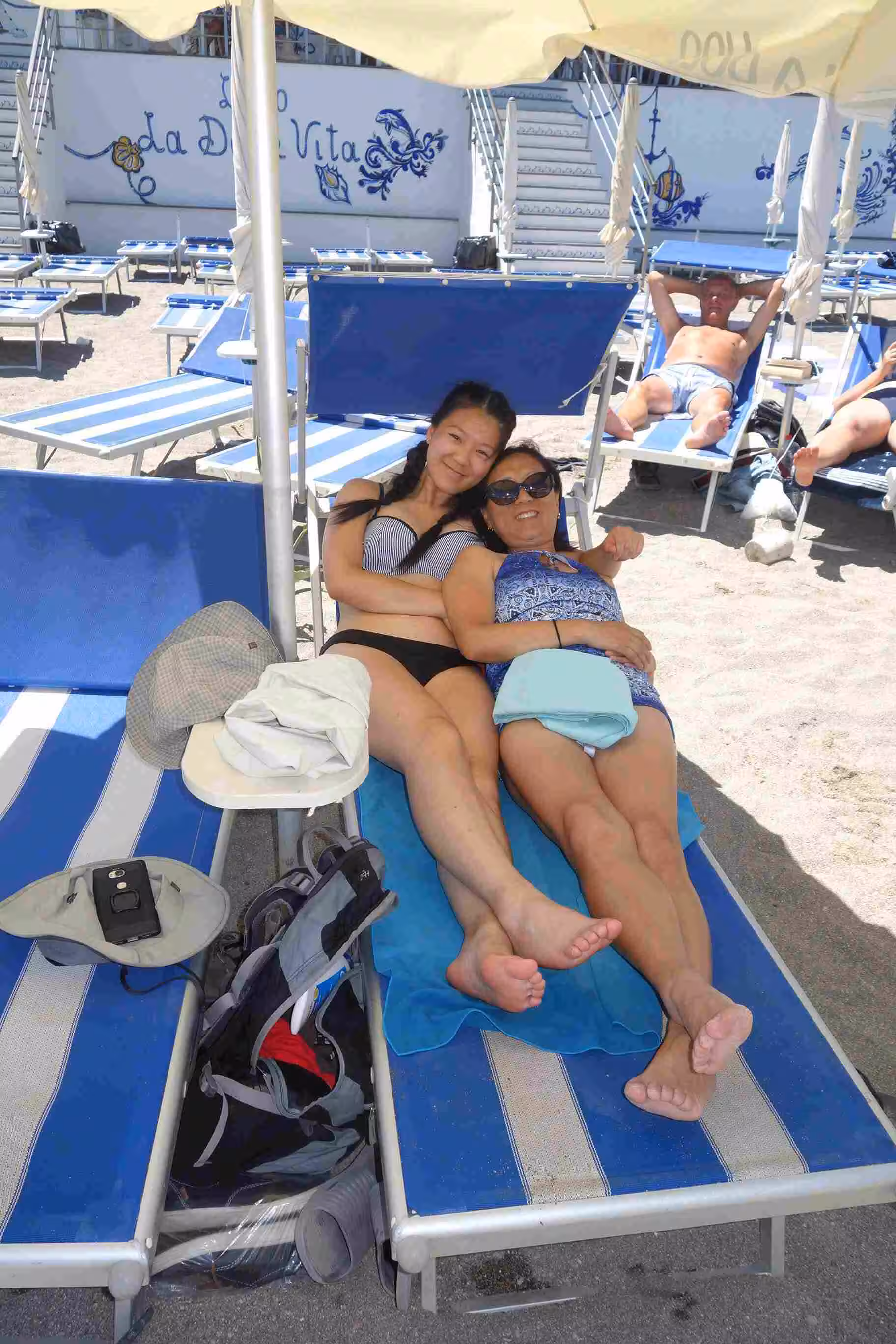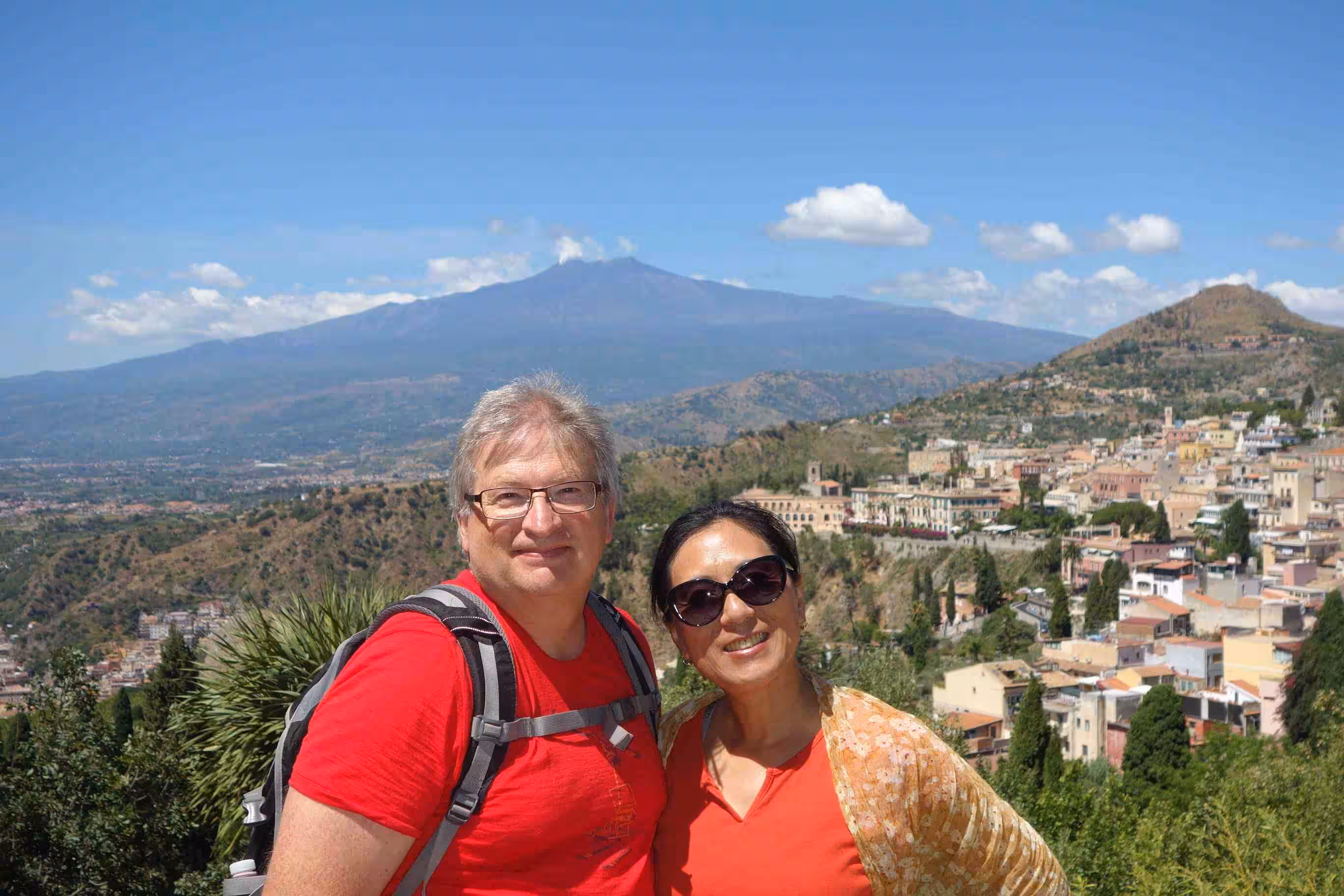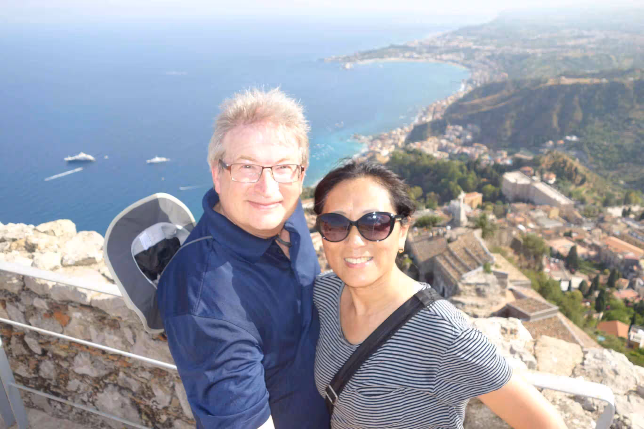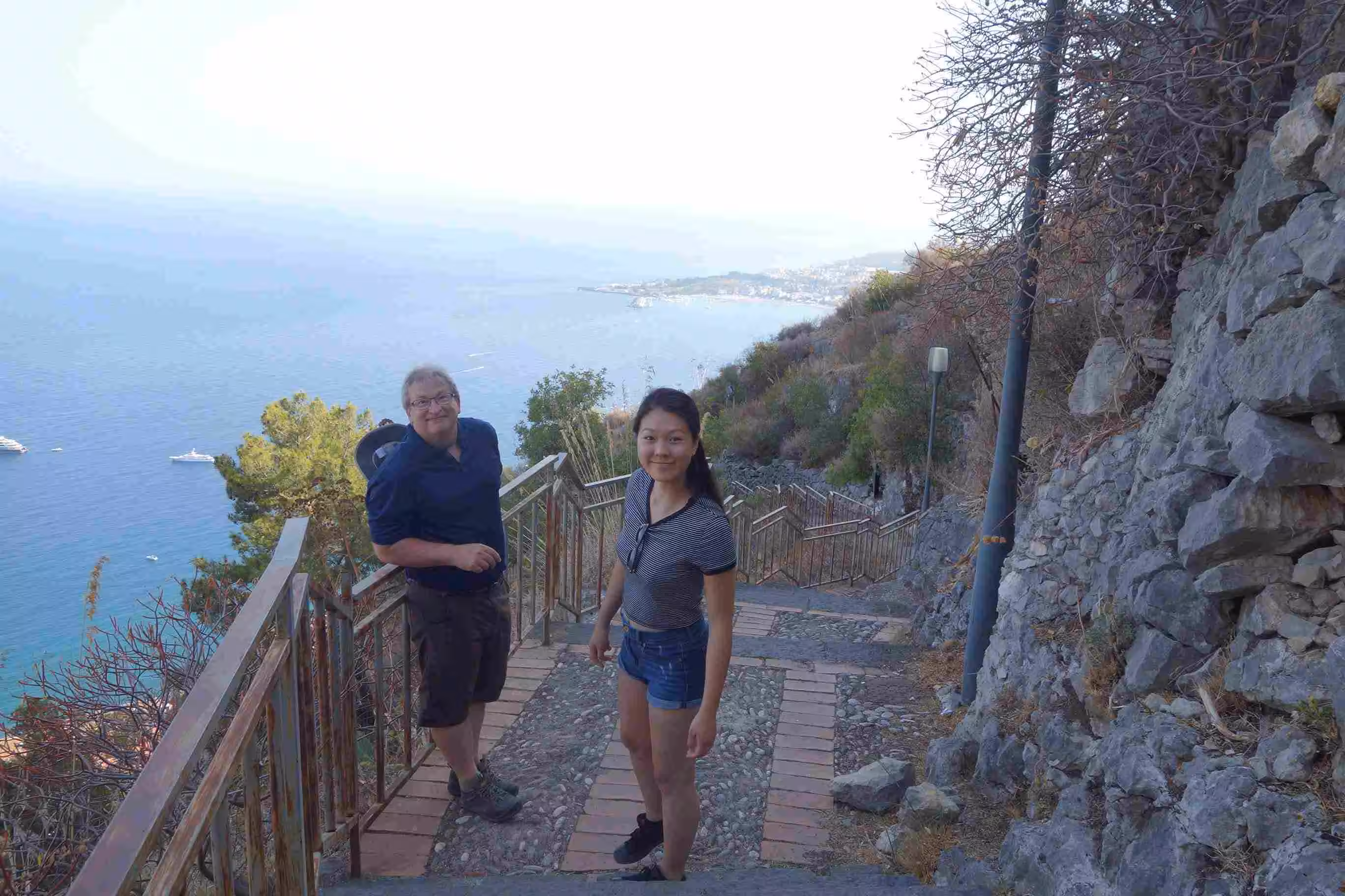 Beach day! After breakfast, we walked, once again, to the end of a tourist pedestrian walkway (Umberto I) which led us to the Ancient Greek amphitheater – an impressive site with Mt Etna as a backdrop. After our visit of the site, we opted to walk to a beach area that offered some sand as opposed to the pebble stone beaches we saw near Isola Bella yesterday. My offline Maps.me application guided us on a route which we followed enthusiastically at the beginning but at mid-way the staircase/path turned into a rather Roman path from the antiquity – mostly covered in overgrowth. Clearly no one, especially tourists, had come along this path for some time. Nonetheless, we managed to come out near the beach. At the first beach kiosk we stopped at, we were shocked by their asking price for two sun bathing chairs and an umbrella – 50€. We naturally moved on to the next beach area which cost only 14€. Although the beach was sandy, the sea floor was lined with polished stones. The water was surprisingly cold on entry. We had a light lunch at the beach’s restaurant. While inquiring about our options for returning into town, the restaurant owner offered us a seat on the 5:00pm mini bus operated by the restaurant – for free. Back in town, we stopped for some gelato. We bought some additional groceries and our first cannoli of our Sicilian stay. Jenny prepared another great pasta meal followed with our cannoli for dessert. We were increasingly appreciative of our apartment’s opportunities to allow us to cook most of our meals.