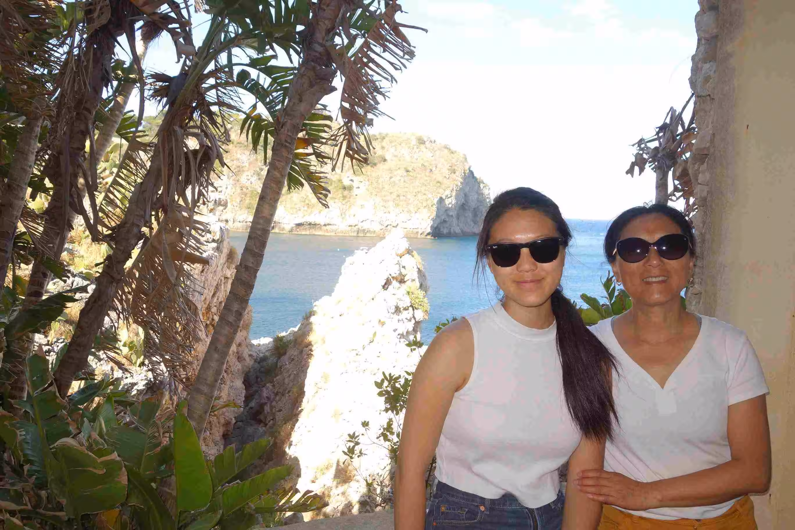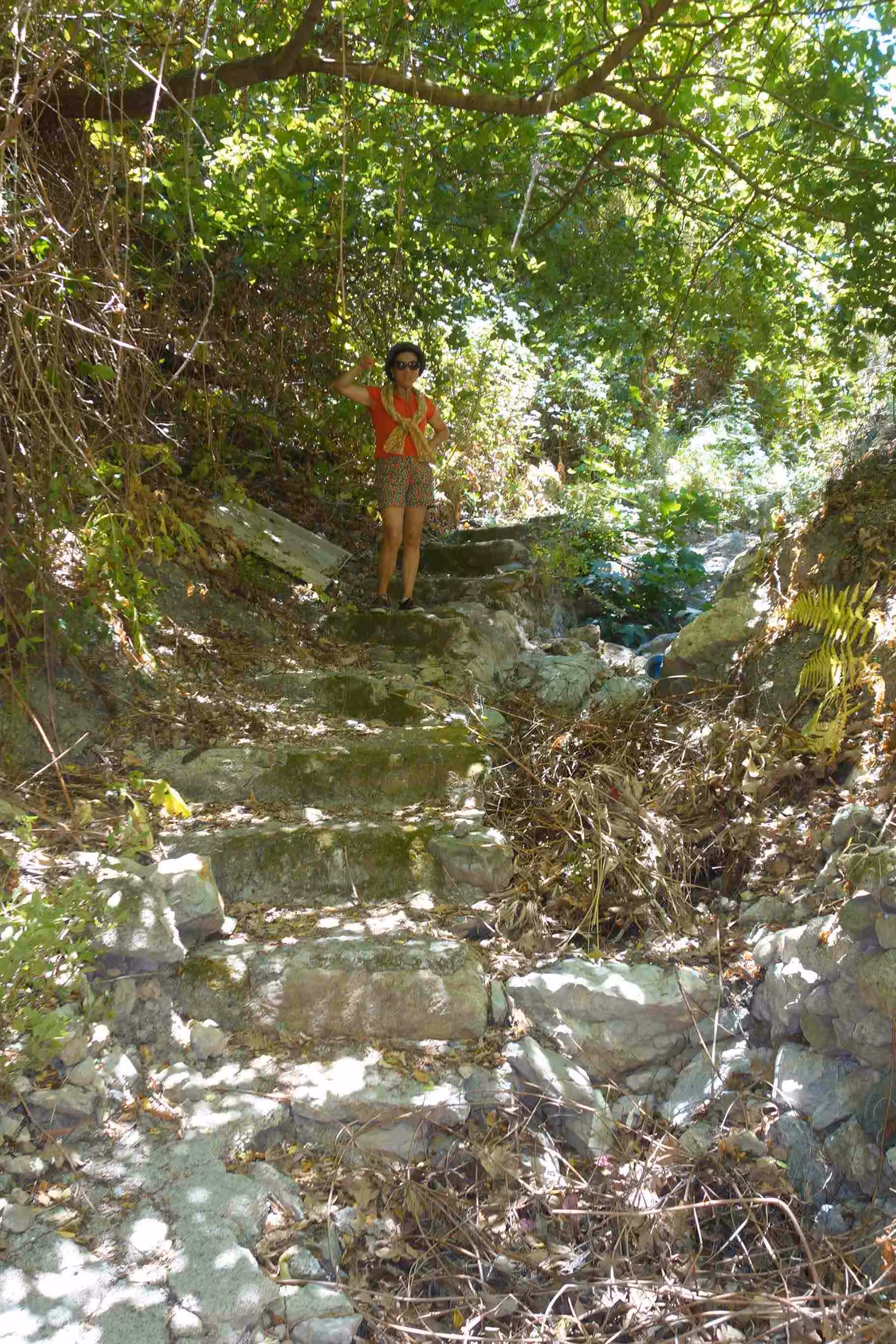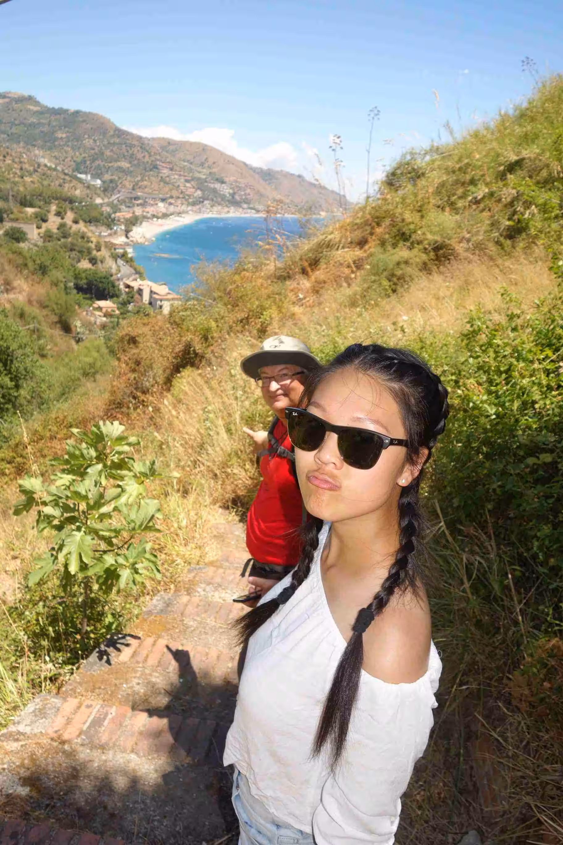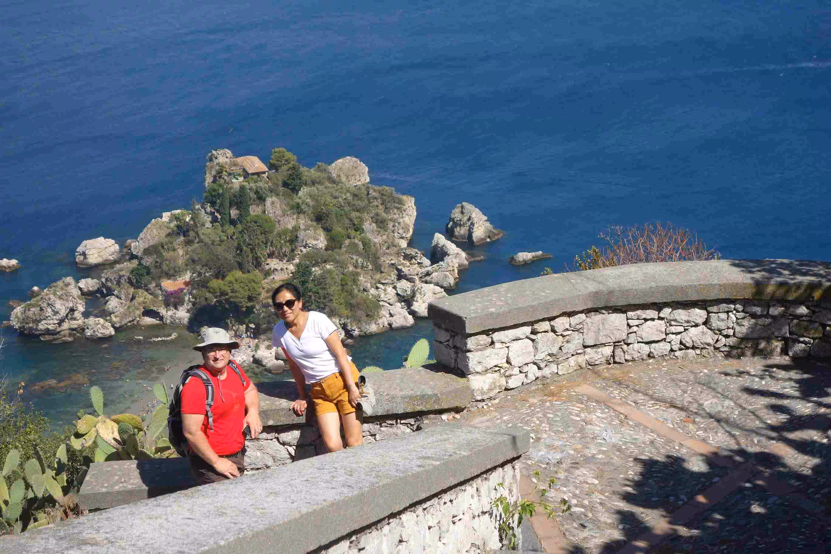 After our home made breakfast, as Jenny and Victoria had not complained about yesterday’s 20 mins. hike, I suggested a similar one hour adventure to a small town overlooking Taormina. By navigation accident, we stumbled on a staircase/path that offered a different route to the village of Castelmola. After some effort, we were rewarded with grand views of the area. We took the roadway back to Taormina. After lunch, we dropped by the bus station to check out the itineraries and we then walked towards the sea – another long staircase downwards. We visited the tiny island of Isola Bella as the entrance was free on the first Sunday of the month. We took a cable car back up to Taormina’s town center. We had some take-out pizza for this evening’s meal.