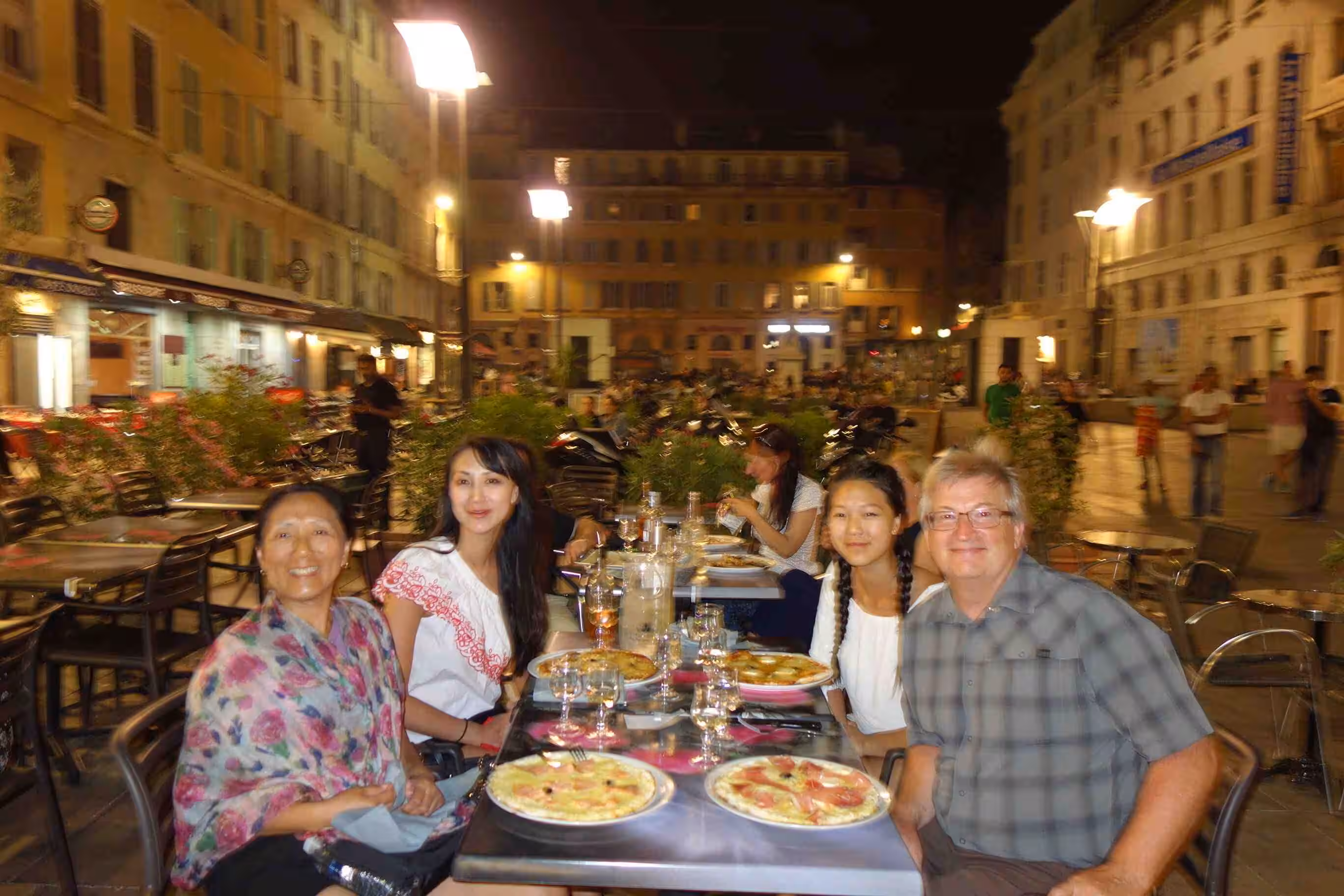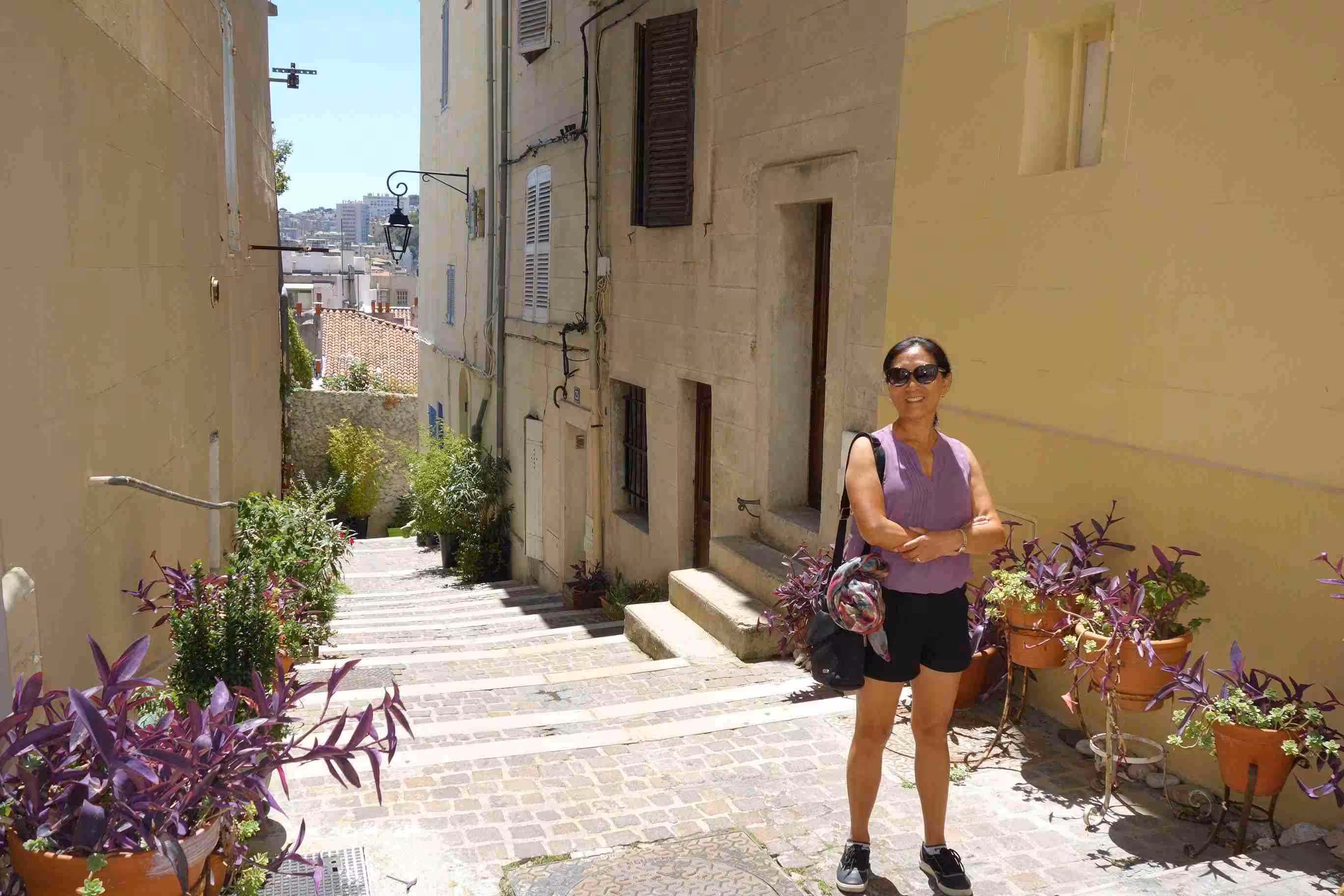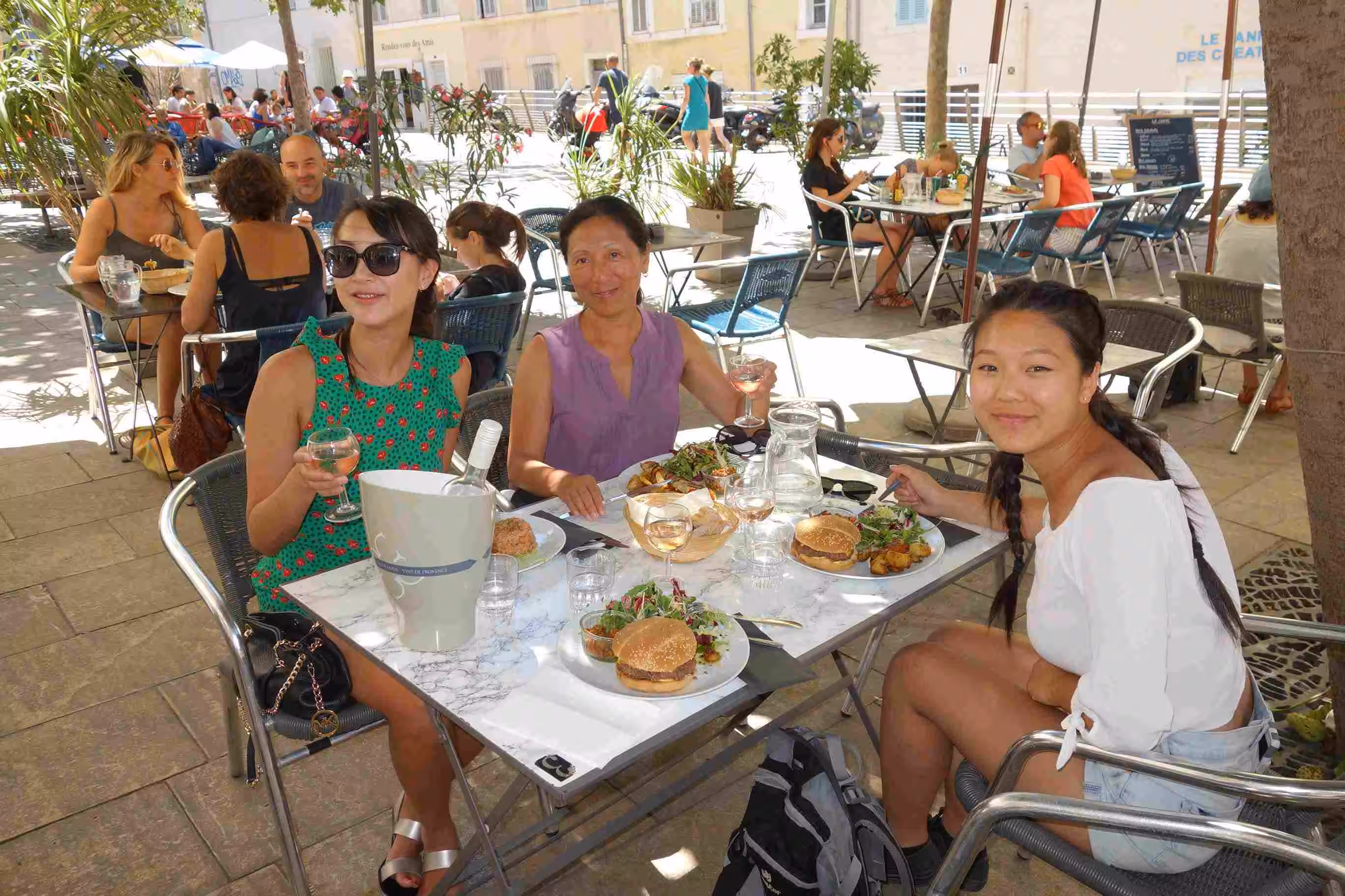 After a nice breakfast at our Ibis Style hotel, we headed out to explore the city equipped with some daily transit passes. We started our visit at the Vieux Port (Old Port). We later hopped on a bus to tour the Basilique Notre Date de la Garde perched on top a hillside of Marseille. Back in the Vieux Port, we headed for a stroll through the old part of town called Le Panier. We had a long and very enjoyable lunch at a neighborhood café. Late in the afternoon, we headed back to the hotel for a rest. We noticed in the metro that some disruption in service would be taking place at night due to the re-scheduled fireworks that were postponed yesterday as part of France’s Bastille Day. Late evening, we took the metro to the closest station to the Vieux Port which was still accessible to folks wanting to see the fireworks. We stopped for an evening meal along a pedestrian walkway dotted with restaurants. Although we were several blocks away from the Old port, the launch point of the fireworks, we managed to enjoy quite a good display of fireworks while we were eating our pizza and sipping wine.