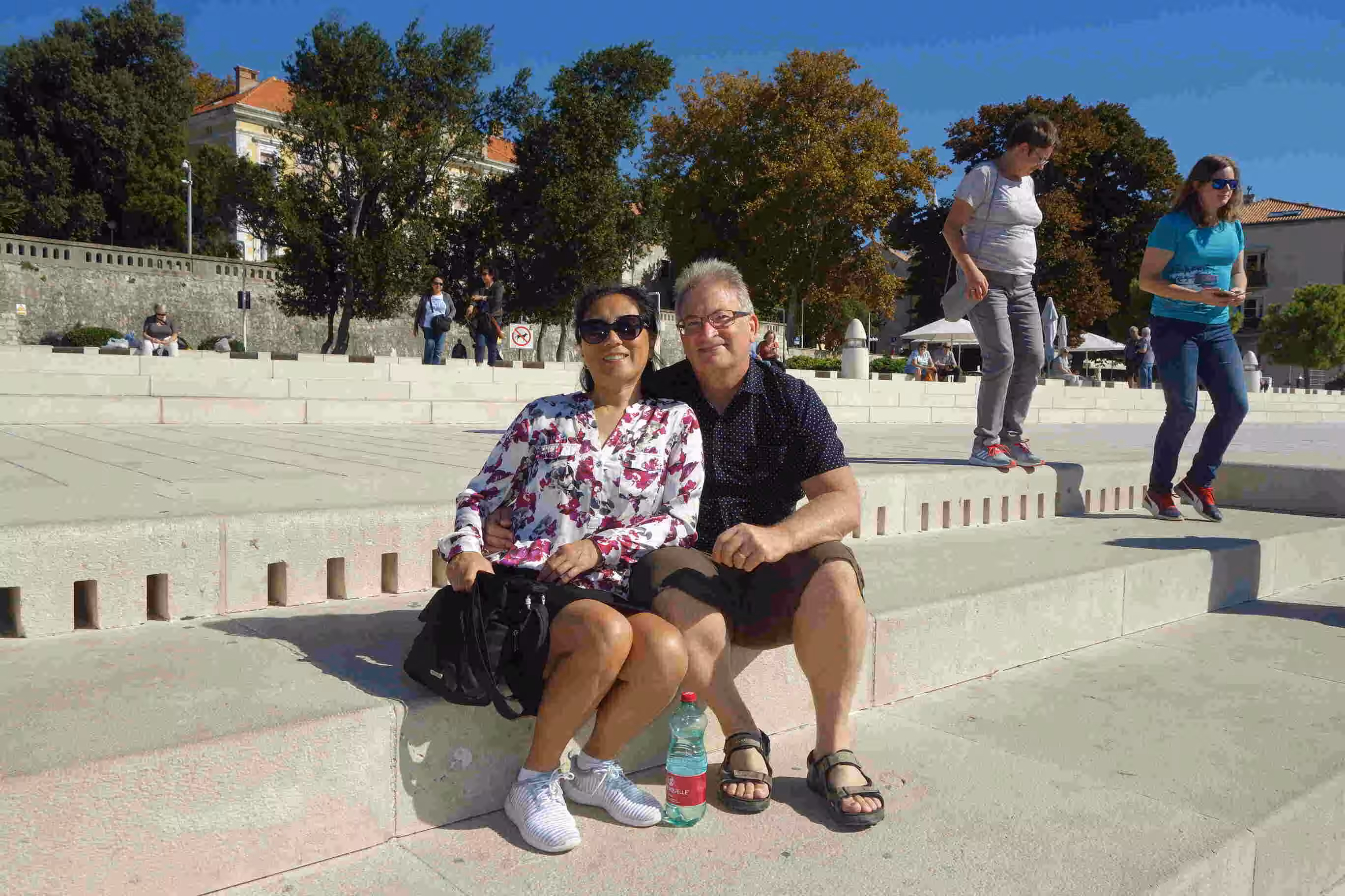 2018.10.03 – Rijeka – Zadar (Croatia) – We had some coffee before leaving our comfortable apartment. We walked to the bus station and boarded the bus shortly after 9:00am. The bus took the coastal road which provided us with amazing views on both sides of the road. The route was far from being flat but it was rather jagged. We saw a few courageous touring cyclists along the way. The 4.5 hours bus ride passed by quickly as we were continually entertained by the beautiful scenery. The bus stopped every hour and half in a small town for a road side break. After arriving in Zadar, we walked 1.4 km from the bus station to our apartment in the old town of Zadar. As we crossed the bridge and an archway leading to the old town, we quickly felt in love with the charm of the old town. We secured our accommodation keys after connecting with the apartment manager. We enjoyed exploring the narrow cobblestone paths spread throughout the old town. After our humongous evening meal of mixed grill meats, we walked to one of Zadar’s unique attraction: the Sea Organ. The organ-like sounds are produced by the sea water being pushed into pipes installed under a series of staircases on the edge of the sea. It’s truly unique.