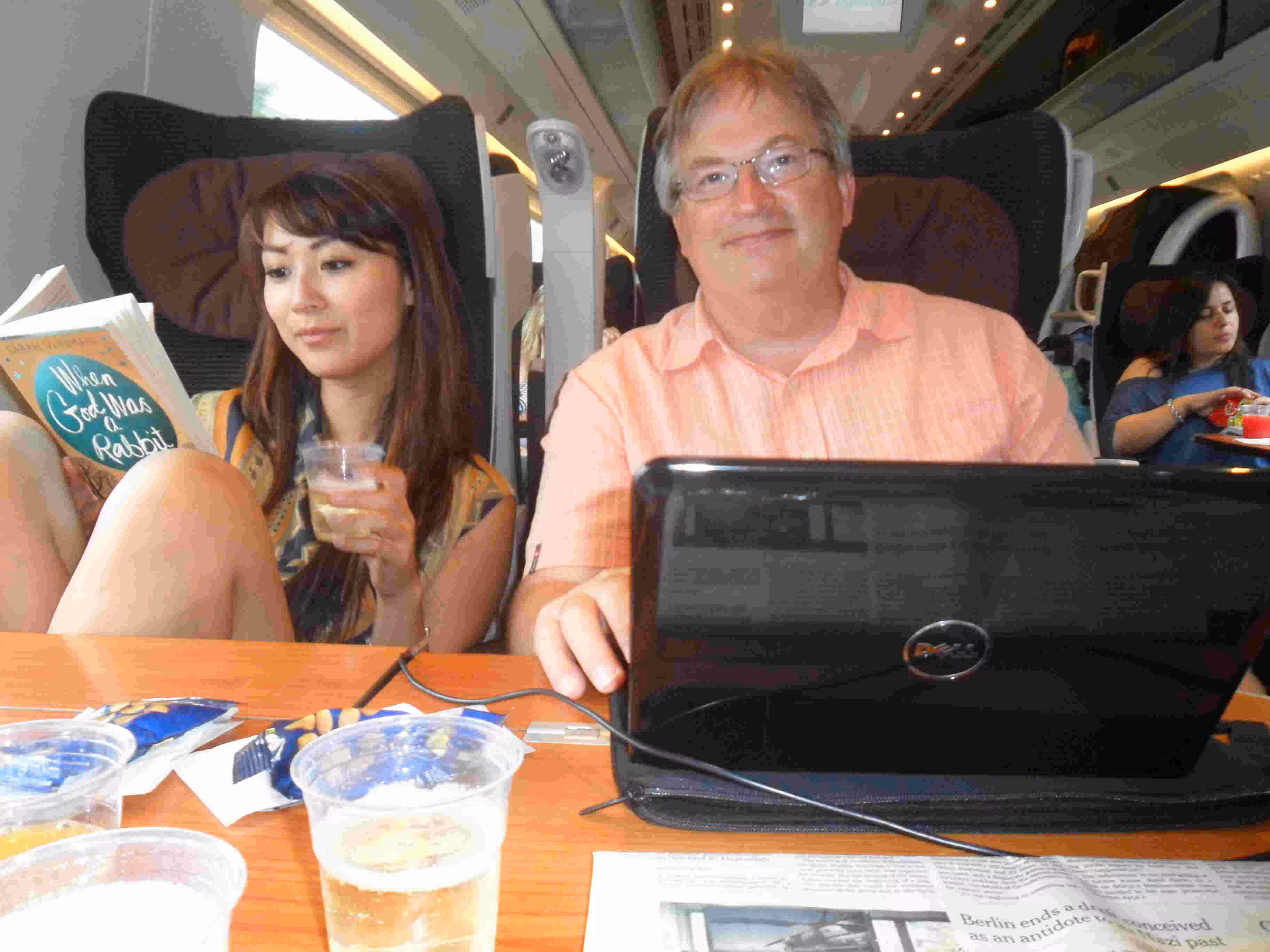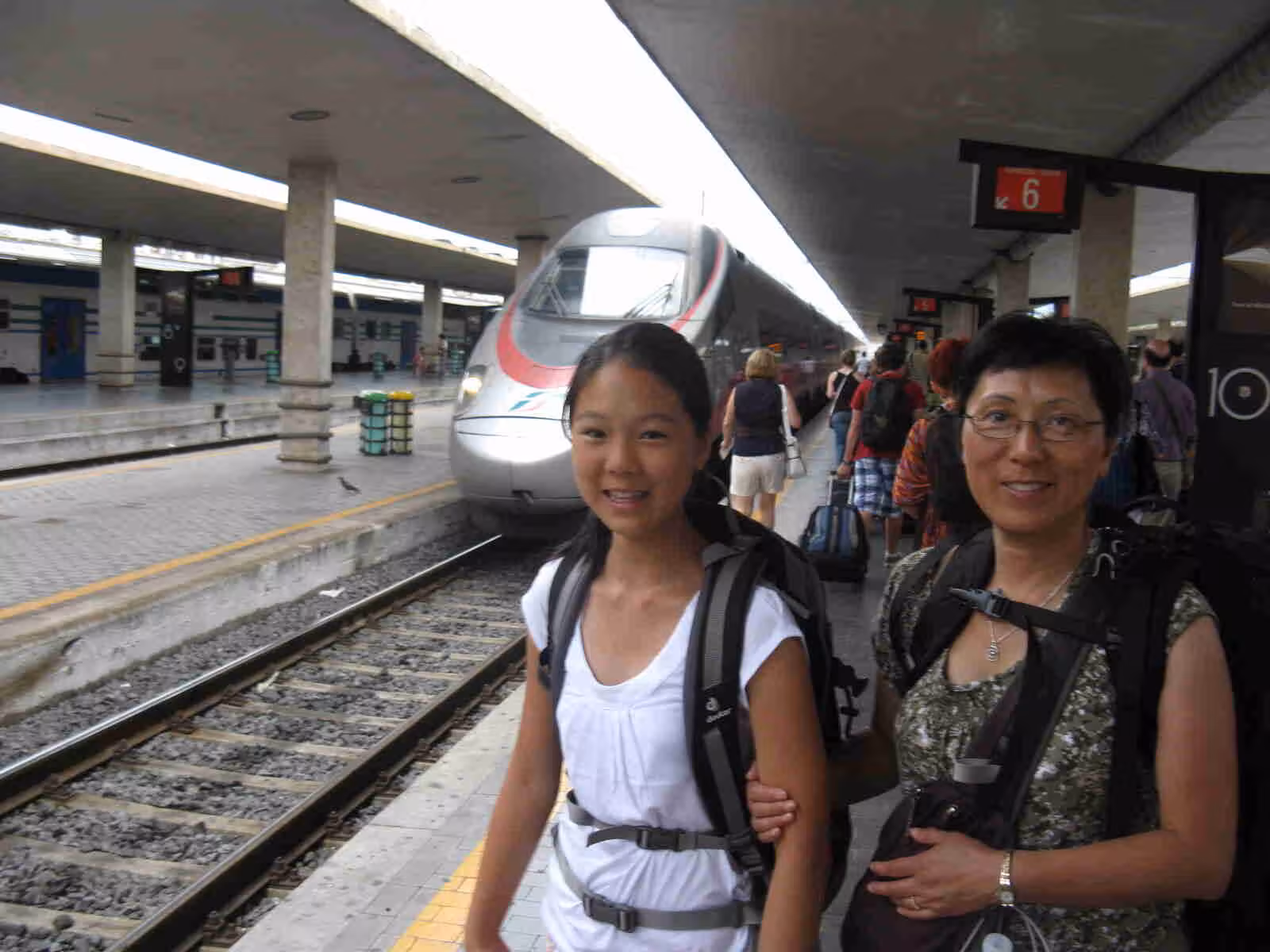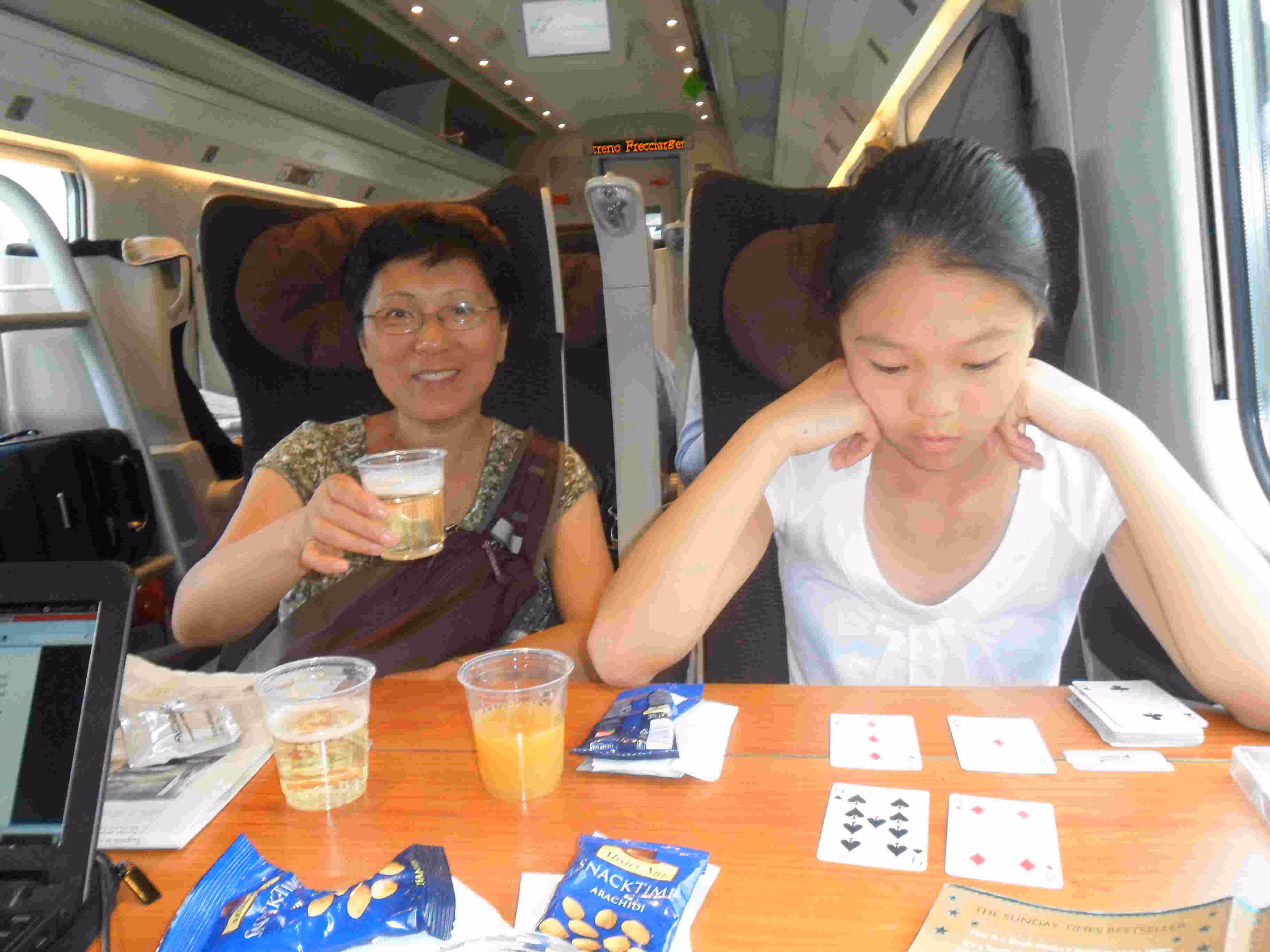 We woke up to the sound of rain this morning. We reminded ourselves that we had been quite lucky with the weather up to now โ€“ not too hot or too cold. We had breakfast at a different cafe closer to our hotel. The hotelโ€™s tiny lift was not working this morning. Carrying Jessica’s suitcase down the five floors to the ground level was quite a haul. We walked to the Termini train station with our luggage. We waited for our train for another hour or so. We all looked forward to the four hour train ride to take a break from our recent walking days.
