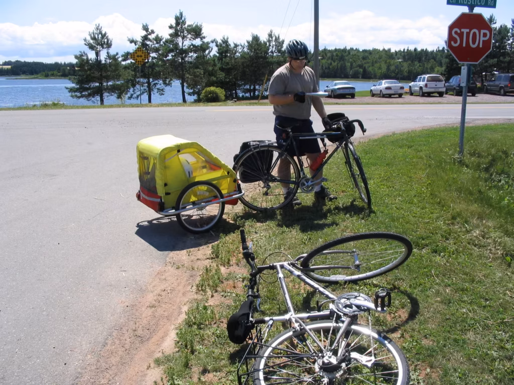 Bonne nuit. Après avoir plié bagage, nous passons au musée “Believe It or Not – Ripley”, Jenny et moi attendons Victoria et Jessica. Nous reprenons la route vers Charlottetown où nous parcourons le centre-ville en auto. Nous nous y attarderons peu. Nous reprenons la route vers Wood Islands où nous devons prendre le traversier vers 13h30. Nous arrivons suffisamment tôt — une fois que je profite de mon vélo pour visiter les lieux. Je visite un phare — seul — tout en gardant un œil sur l’arrivée du traversier afin de ne pas faire paniquer Jenny. De retour à l’auto, je remarque que nos co-voyageurs sont dans la file pour le traversier de 15h30. Nous échangeons quelques plans de voyages — ils proposent d’aller directement au parc du Cabot Trail, sur le sentier Cabot (Cabot Trail). De notre côté, nous nous dirigeons vers Louisbourg mais planifions nous arrêter à Ben Eoin. La route est parsemée de montées et descentes. Nous arrêtons pour des épiceries en route. À notre grande surprise et angoisse, je remarque, à quelques kilomètres du camping, que l’auto semble chauffé. Nous nous rendons au camping. L’endroit est très désagréable et très décevant. Les campings saisonniers sont empilés – les douches sont très dispendieuses ($1) Aucun de nous prenons de douche en guise de protestation.