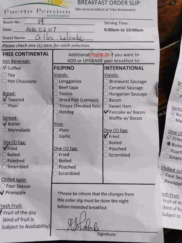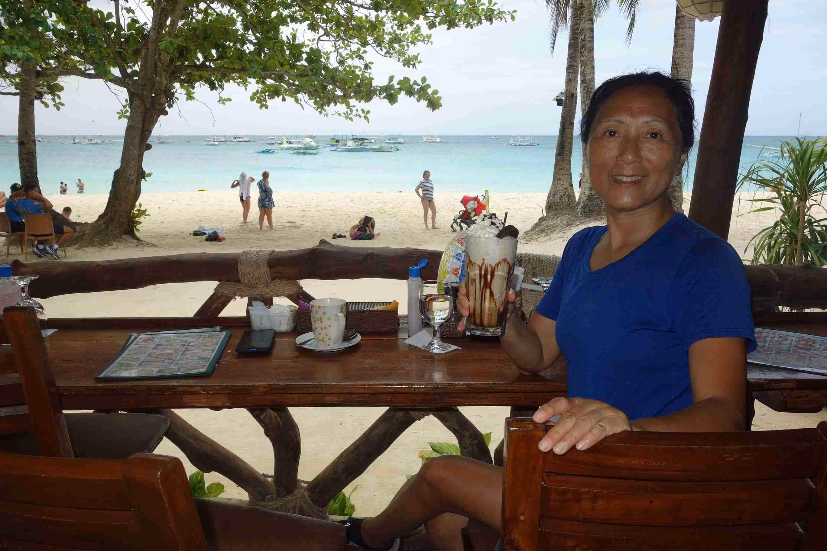 2020.02.10 – Boracay – Boracay (Php) – After our hotel’s courtesy breakfast, we strolled over to the jewel of Boracay – White Beach – some 500m away. Under a covered sky, we enjoyed walking along the 4km shallow fine white sand beach. We saw a dozen of boat loads of day trippers leaving the beach. Although the beach was lined up with restaurants and a wide range of accommodations, it was nice to see the new island rules ensured that no sun beds or touts cluttered the nice beach. After our 7+kms long walk along the beach, we stopped for some coffee. Back at our hotel, we relaxed for the remainder of the afternoon. Neither of us felt the urge to swim on the nice beach as we had enjoyed plenty of swimming during our 3D2N tour. To our surprise, it started to rain again at the same time as yesterday. We opted to have our evening meal at a Japanese restaurant across the street from our hotel.