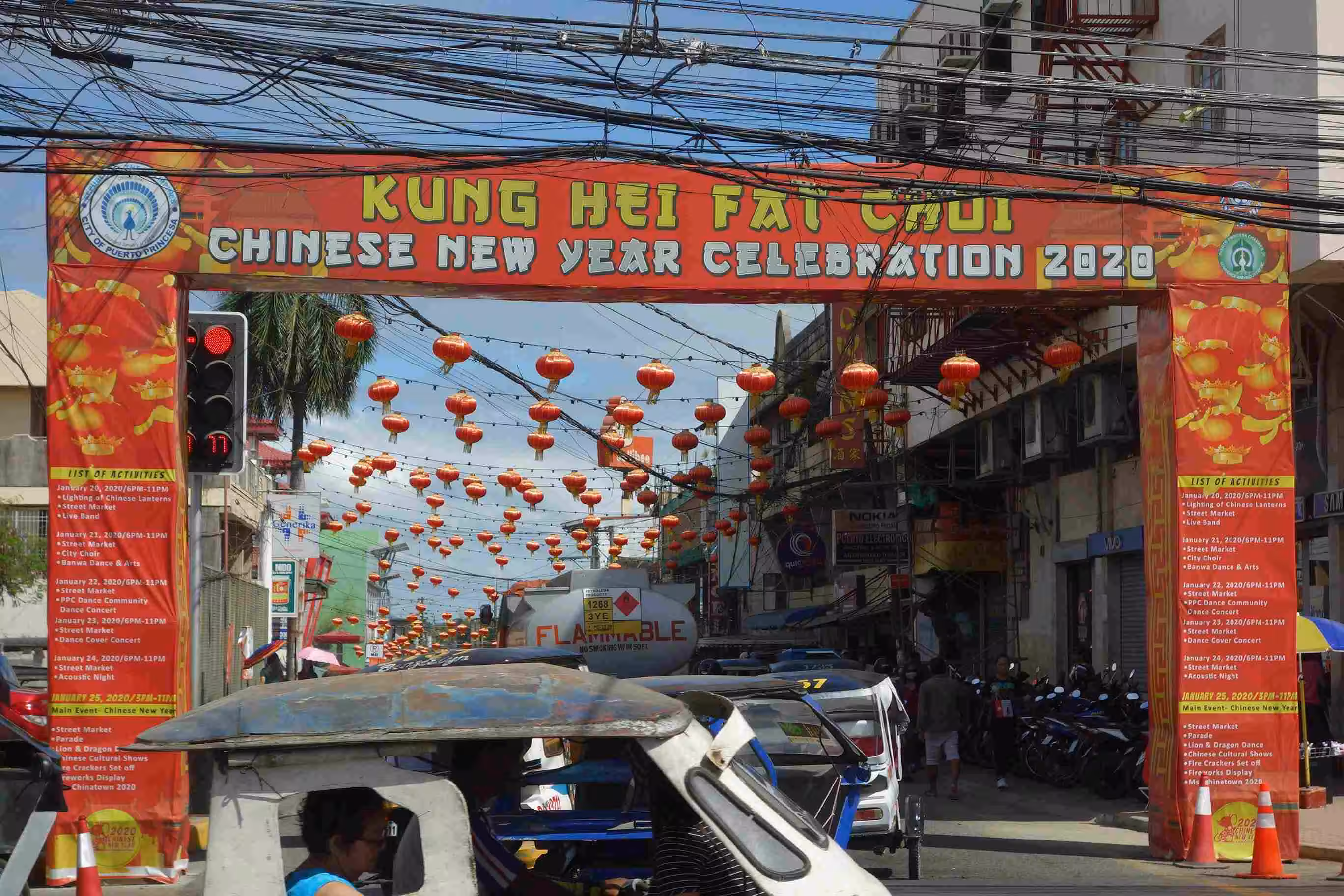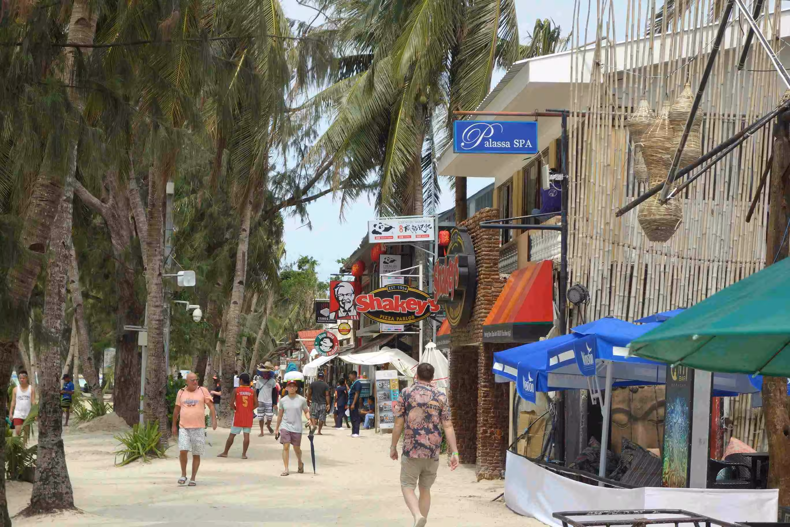 2020.02.09 – Puerto Princessa – Boracay (Php) – We had an early wake up as we caught a moto-tricycle at 5:45am for the nearby airport. As we had previously done our check-in on-line, we only had to drop-off our luggage. Although we preferred a direct flights from Puerto Princessa to Boracay, none were available. We had a long 4 hour connection in Cebu, the 2nd largest city of the Philippines, before arriving at the tiny airport of Caticlan. Before reaching our hotel on the island of Boracay, we had to take a moto-tricycle from the airport to a dock ferry area. Along the road, an army check point inspected at length our passports. At the dock, we had to pay various eco/entrance fees in addition to our transportation cost of the 15 min ferry. Before boarding the ferry, we also had to show proof that we had our booked accommodation on the island of Boracay. We learned, while in Puerto Princessa, that the extremely popular island of Boracay had been completely closed, by government officials, to tourists in April 2018 for a period of six months. In order to sustain the livelihood of the island many new rules were introduced including no sand castle building! As our ferry docked in Boracay, the rain started to fall, slowly at first but more heavily later on. Under a downpour, we scrambled to secure an e-tricycle to reach our hotel some 4 kms further. After relaxing a bit after our hotel check-in, we dropped by a nearby Korean restaurant for our evening meal. Later we walked along the busy streets to discover that we had landed in the middle of resort-filled island catering mostly to Korean tourists.