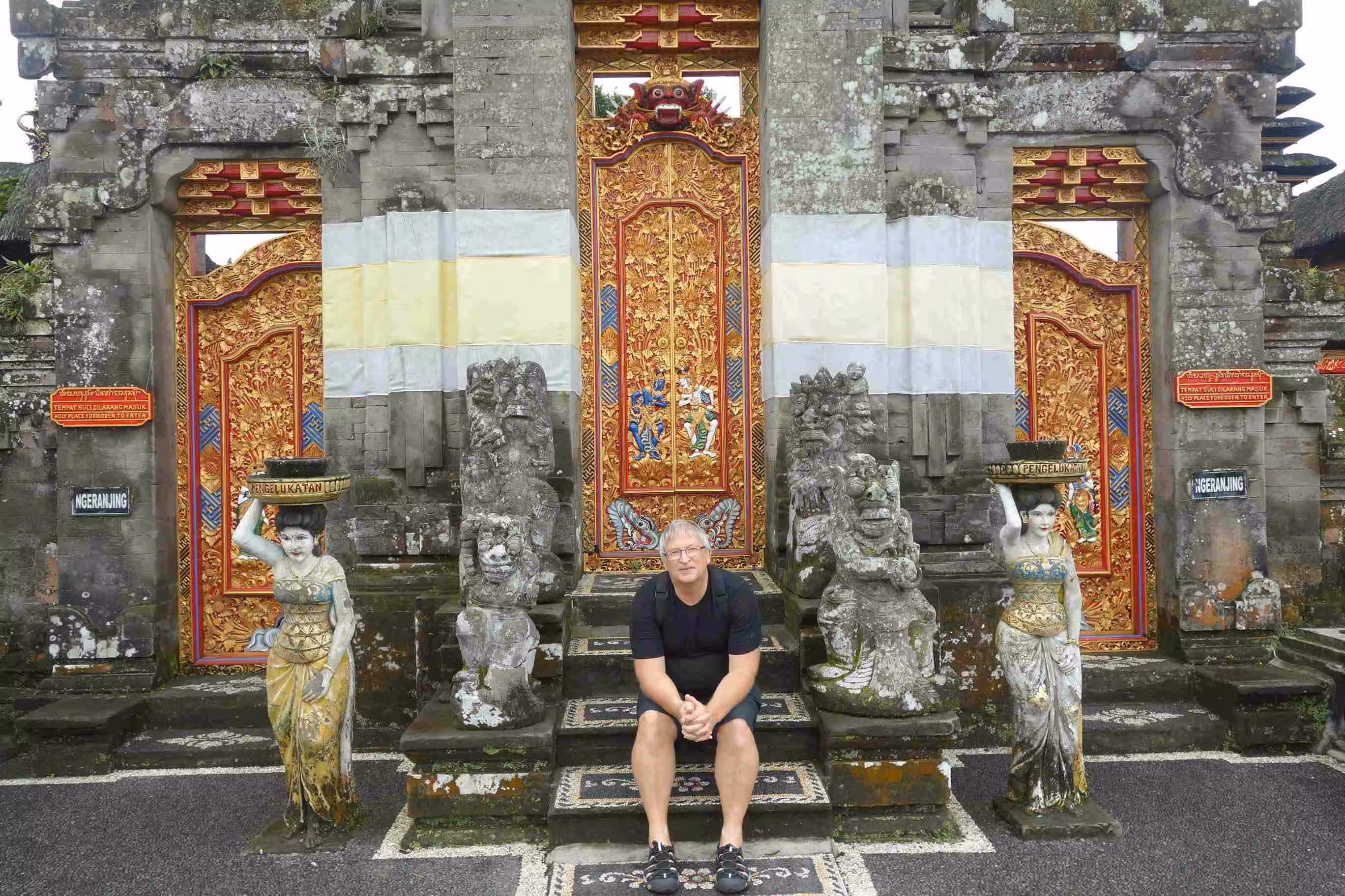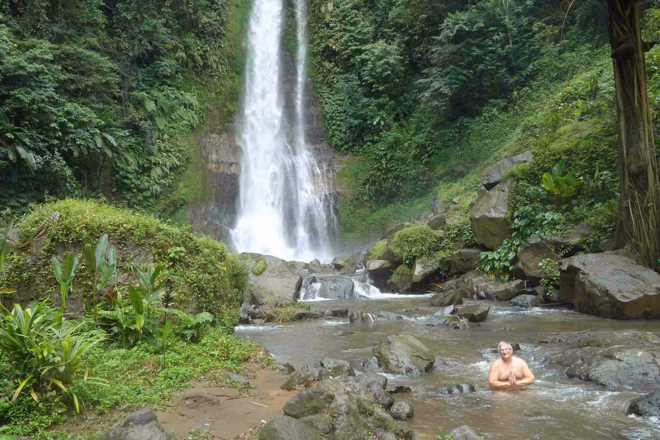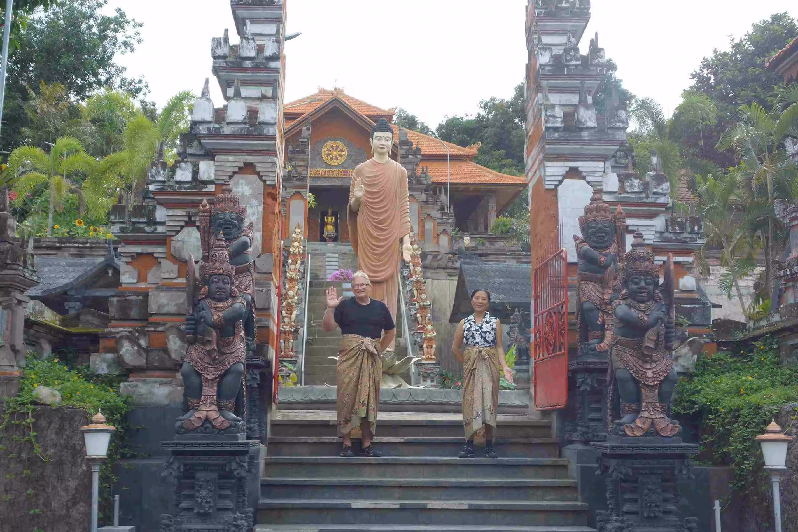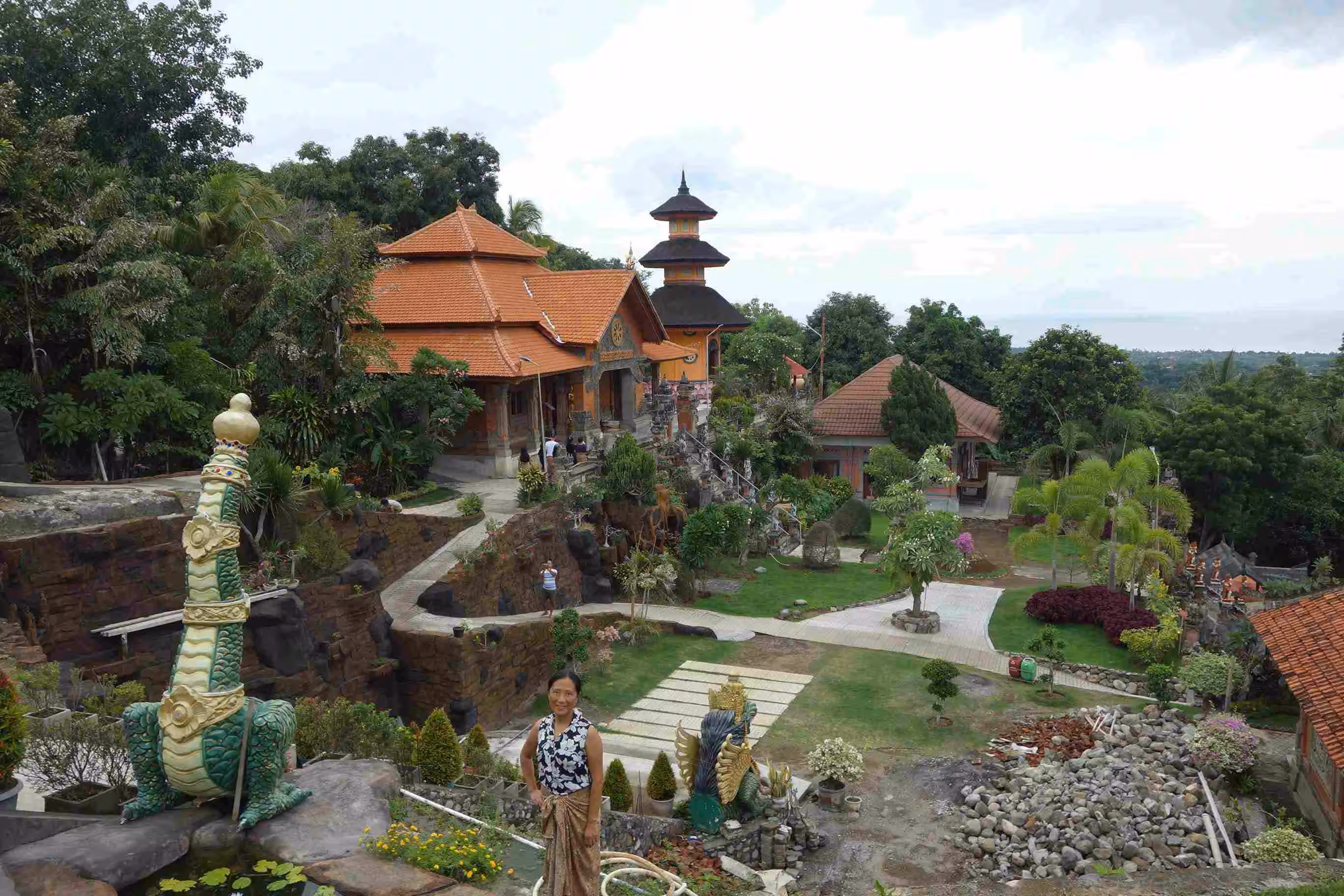 2020.03.04 – Lovina – Lovina (Indonesia) – In the morning, shortly after stepping out of our bungalow for breakfast, we asked staff to book the services of a driver for a 1-day Lovina tour. As it was the low tourist season in Indonesia (rainy season), it was fairly easy to get a driver to show up at our accommodation promptly at 9am. We drove for 45 mins to our first stop of the day: a trek and swam at the Git-Git Waterfalls. Our second stop was at the very beautiful (and busy) major Hindu Shaivite water temple of “Ulun Danu Beratan” on the shore of a lake. Our third stop was at a coffee plantation where we had a very informative visit and a nice complementary tea and coffee tasting. We were introduced to Kopi luwak coffee. A coffee that consisted of partially digested coffee cherries, which had been eaten and defecated by the Asian palm civet. I tried a small cup for $5 cdn. According to Wikipedia, it had been called one of the most expensive coffee in the world. But I must agree with some critics that claim more generally that kopi luwak was simply bad coffee, purchased for novelty rather than taste. For lunch, we stopped at an expensive tourist buffet restaurant overseeing some rice terraces. Later, we stopped for some photos at a viewpoint above the popular Twin Lakes. After we made our way to the “Holly Hot Springs” at the nearby Banjar village where we relaxed for an hour. Finally we wrapped up the day by a visit at the expansive Buddhist temple of “Brahama Vihara Arama”. We returned to our accommodation shortly after 5:00pm. As Jenny had passed on the lunch buffet, she had some food delivered at our accommodation for her evening meal.