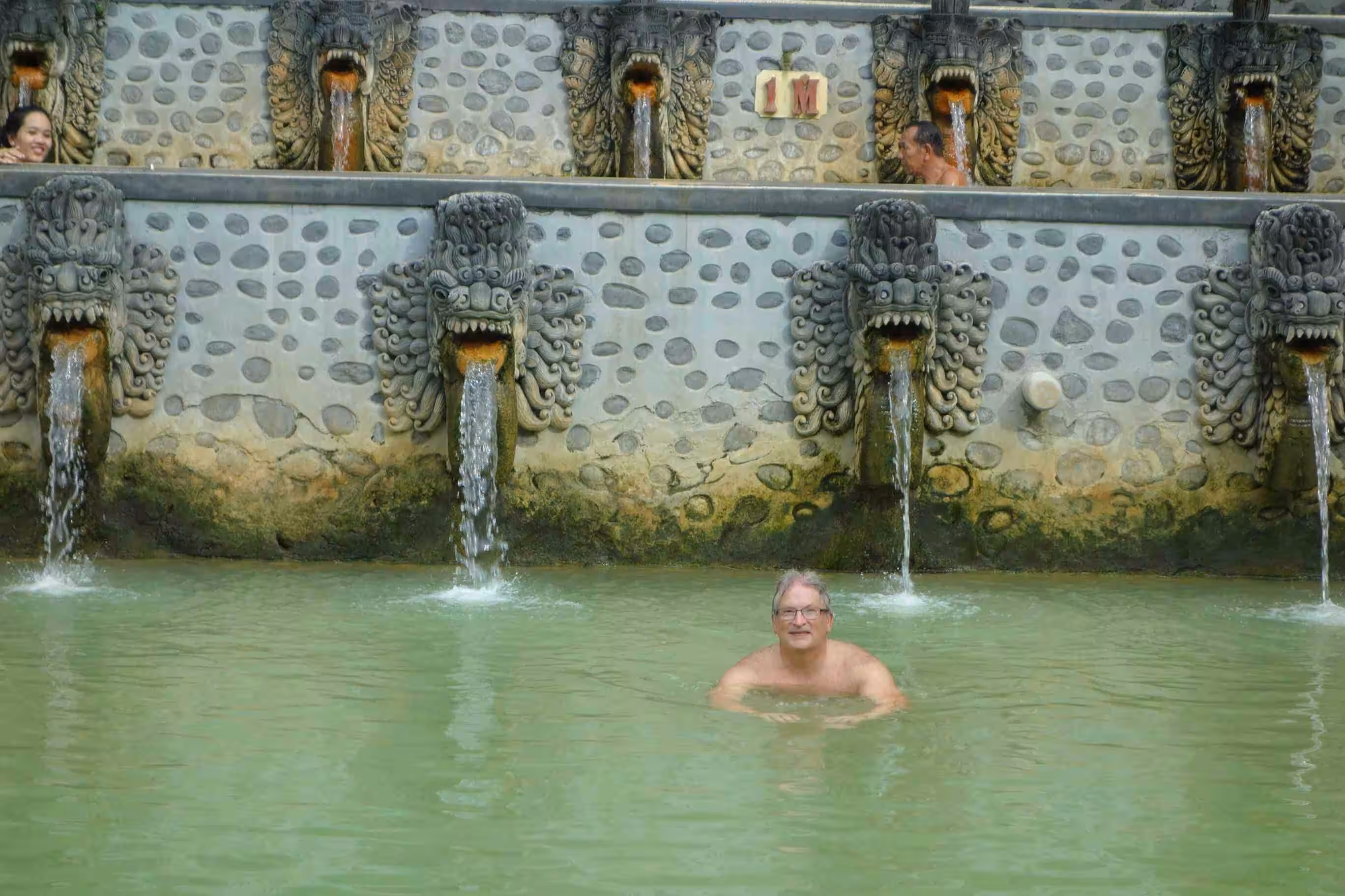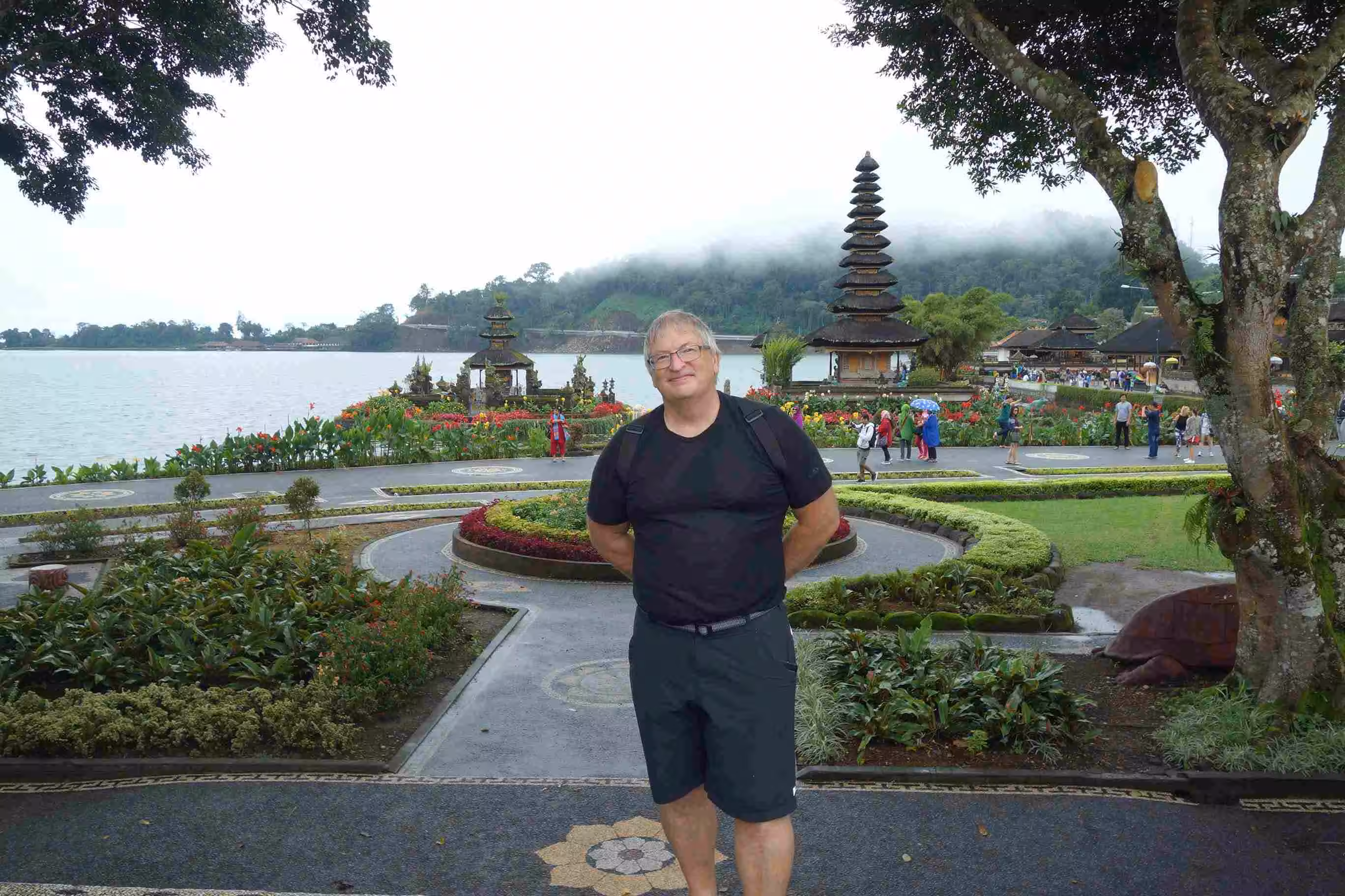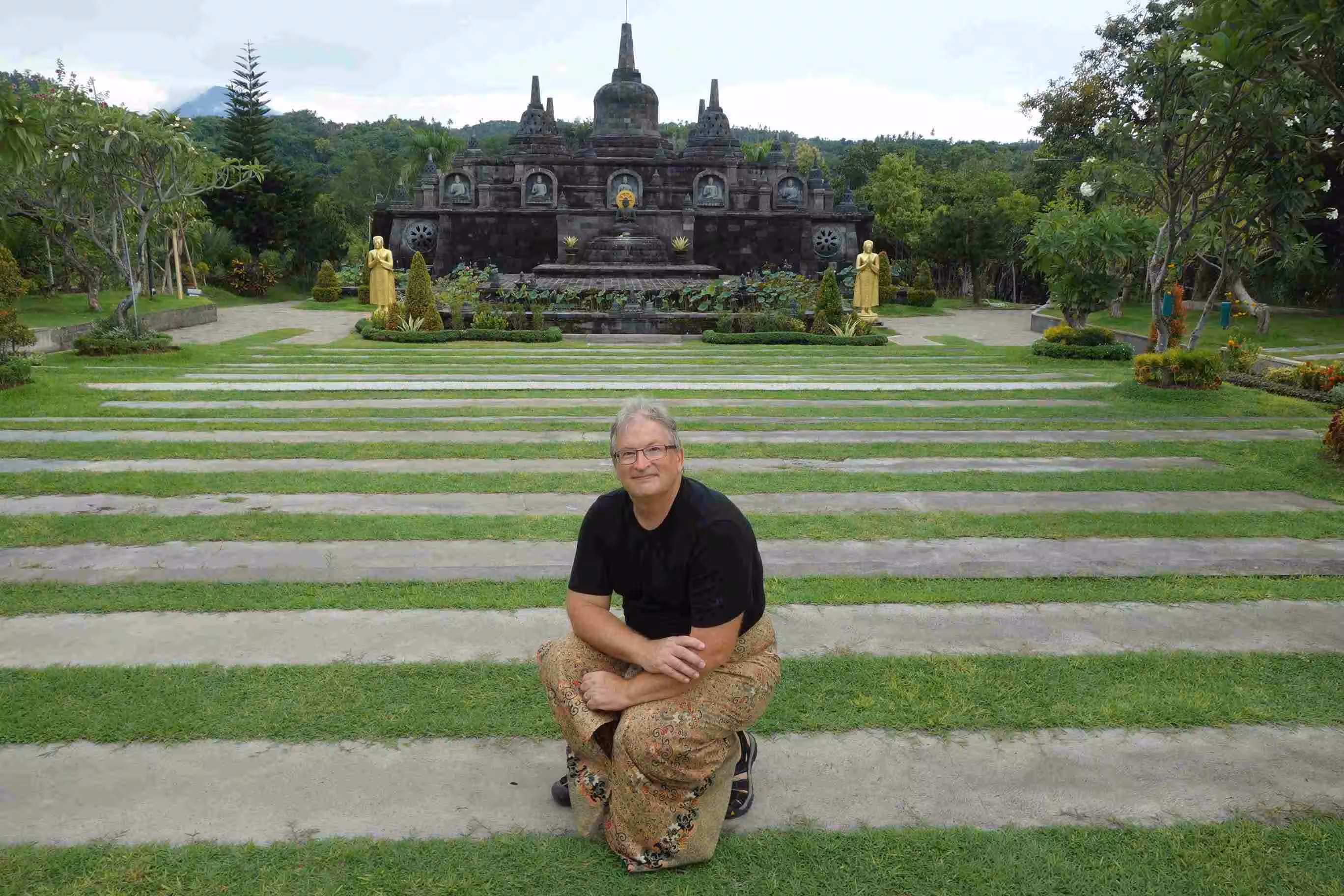 2020.03.04 – Lovina – Lovina (Indonesia) – In the morning, shortly after stepping out of our bungalow for breakfast, we asked staff to book the services of a driver for a 1-day Lovina tour. As it was the low tourist season in Indonesia (rainy season), it was fairly easy to get a driver to show up at our accommodation promptly at 9am. We drove for 45 mins to our first stop of the day: a trek and swam at the Git-Git Waterfalls. Our second stop was at the very beautiful (and busy) major Hindu Shaivite water temple of “Ulun Danu Beratan” on the shore of a lake. Our third stop was at a coffee plantation where we had a very informative visit and a nice complementary tea and coffee tasting. We were introduced to Kopi luwak coffee. A coffee that consisted of partially digested coffee cherries, which had been eaten and defecated by the Asian palm civet. I tried a small cup for $5 cdn. According to Wikipedia, it had been called one of the most expensive coffee in the world. But I must agree with some critics that claim more generally that kopi luwak was simply bad coffee, purchased for novelty rather than taste. For lunch, we stopped at an expensive tourist buffet restaurant overseeing some rice terraces. Later, we stopped for some photos at a viewpoint above the popular Twin Lakes. After we made our way to the “Holly Hot Springs” at the nearby Banjar village where we relaxed for an hour. Finally we wrapped up the day by a visit at the expansive Buddhist temple of “Brahama Vihara Arama”. We returned to our accommodation shortly after 5:00pm. As Jenny had passed on the lunch buffet, she had some food delivered at our accommodation for her evening meal.