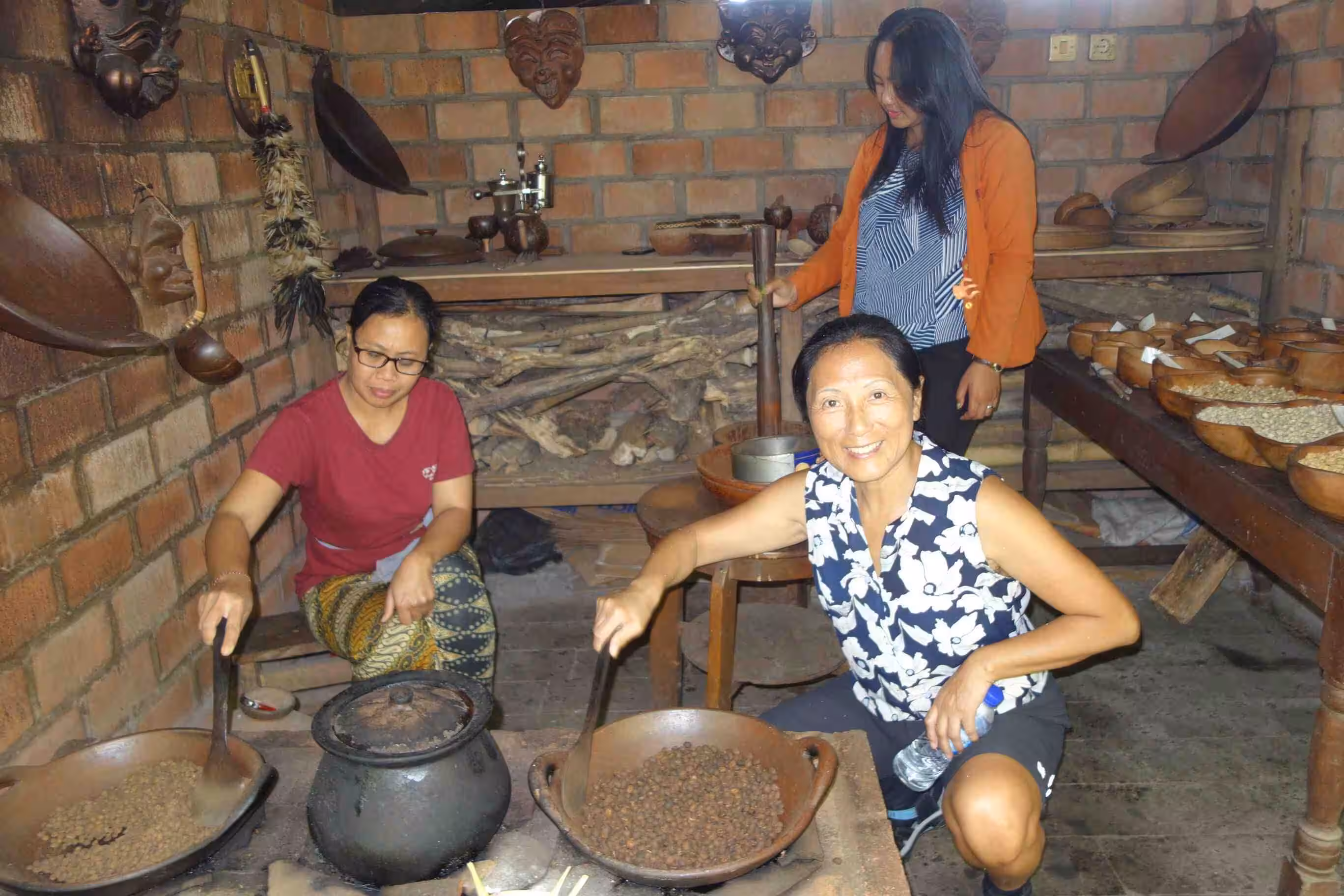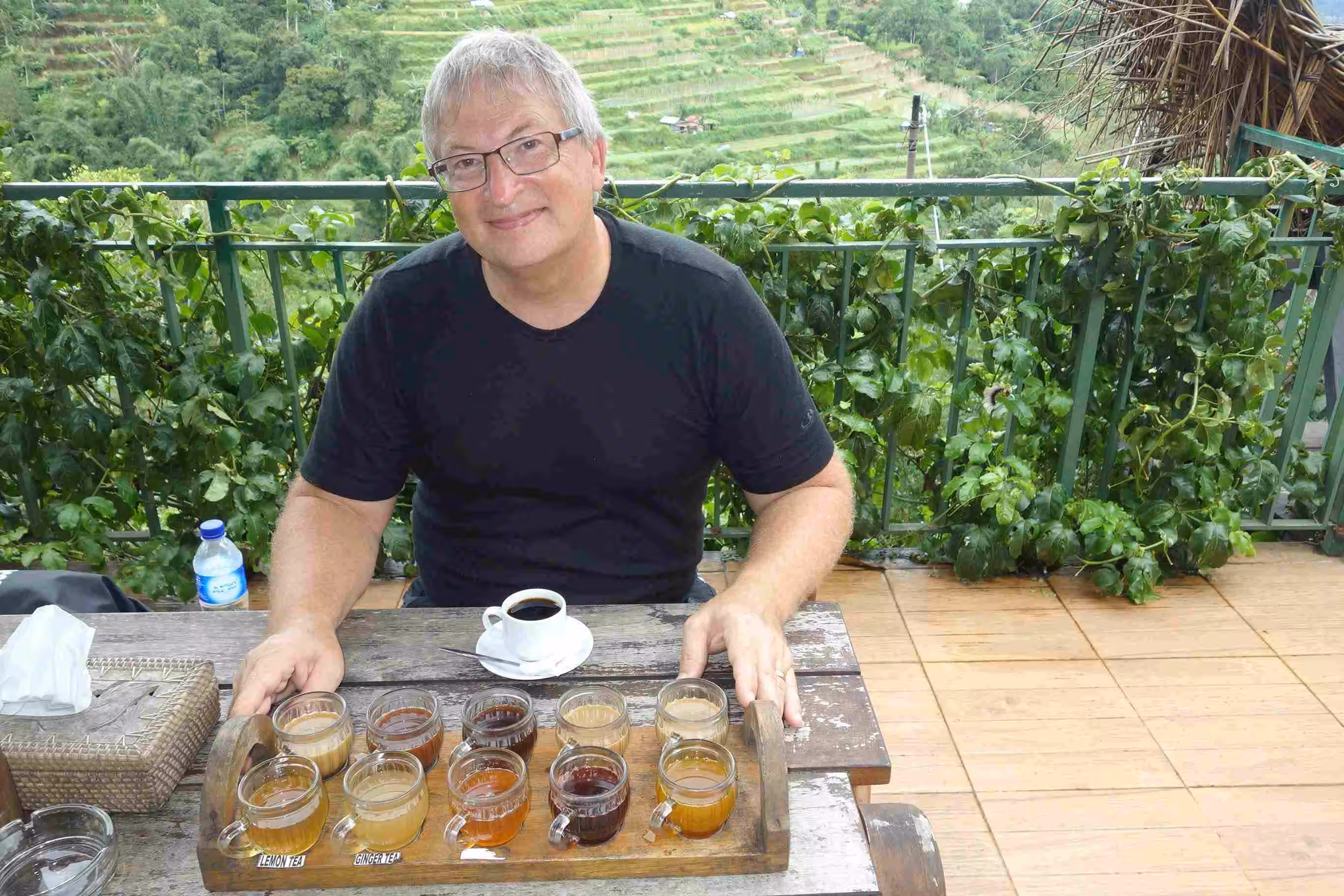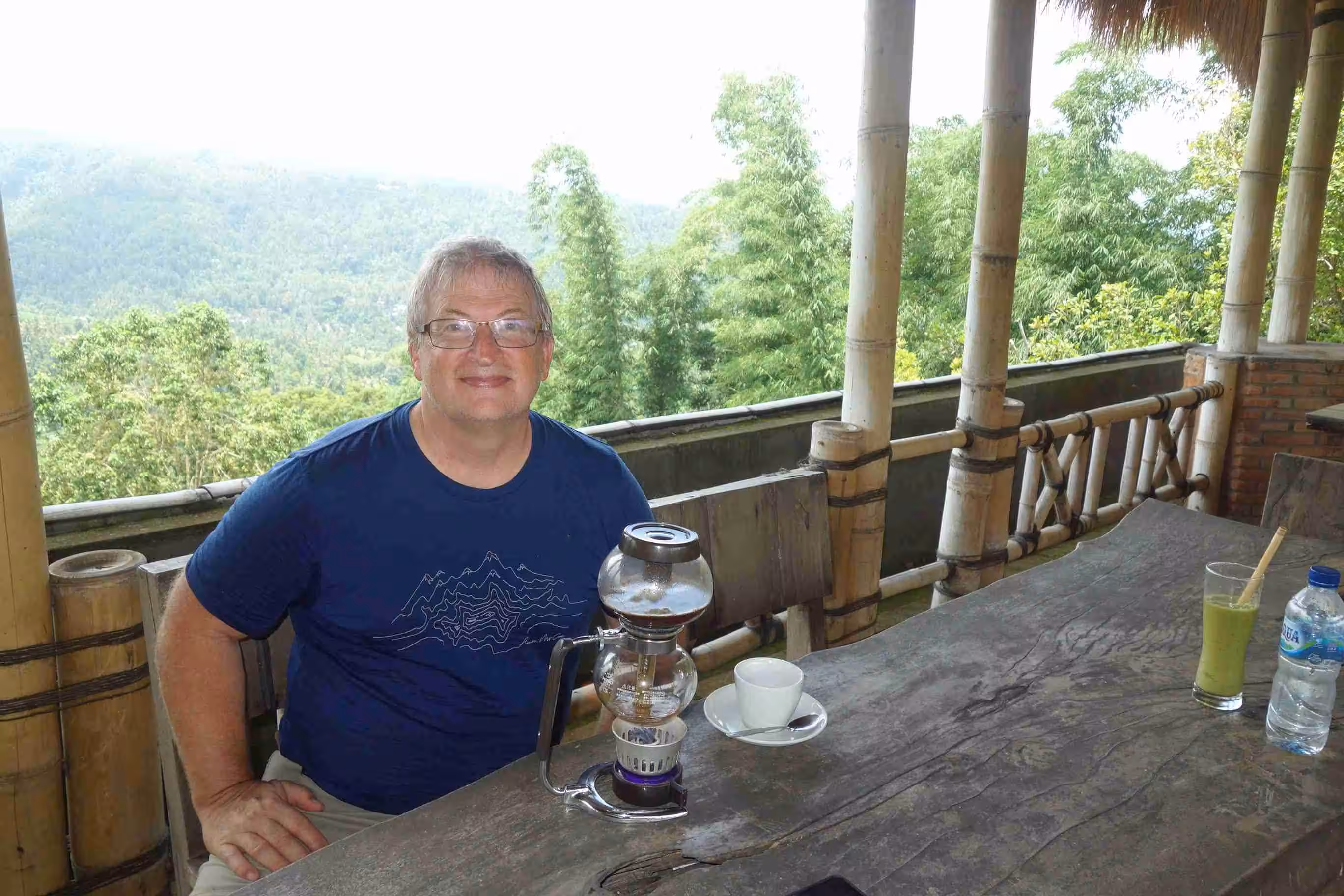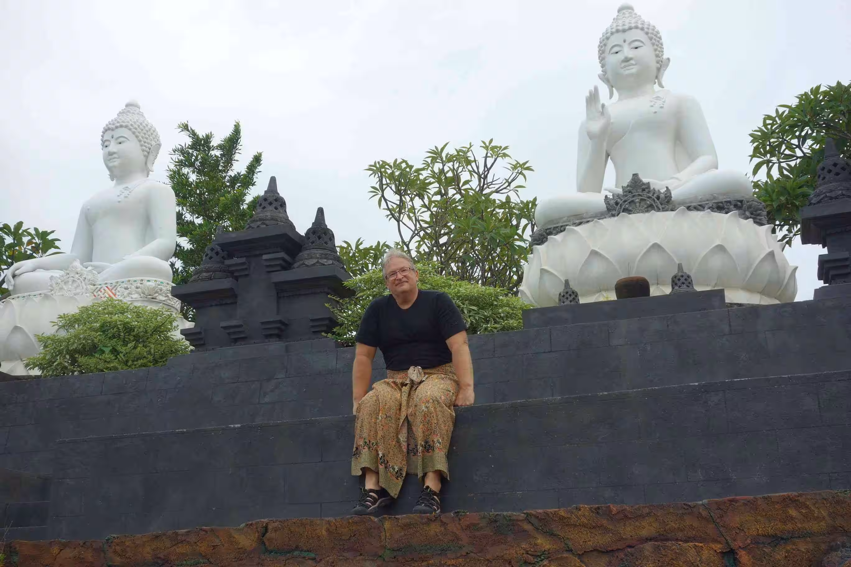 2020.03.04 – Lovina – Lovina (Indonesia) – In the morning, shortly after stepping out of our bungalow for breakfast, we asked staff to book the services of a driver for a 1-day Lovina tour. As it was the low tourist season in Indonesia (rainy season), it was fairly easy to get a driver to show up at our accommodation promptly at 9am. We drove for 45 mins to our first stop of the day: a trek and swam at the Git-Git Waterfalls. Our second stop was at the very beautiful (and busy) major Hindu Shaivite water temple of “Ulun Danu Beratan” on the shore of a lake. Our third stop was at a coffee plantation where we had a very informative visit and a nice complementary tea and coffee tasting. We were introduced to Kopi luwak coffee. A coffee that consisted of partially digested coffee cherries, which had been eaten and defecated by the Asian palm civet. I tried a small cup for $5 cdn. According to Wikipedia, it had been called one of the most expensive coffee in the world. But I must agree with some critics that claim more generally that kopi luwak was simply bad coffee, purchased for novelty rather than taste. For lunch, we stopped at an expensive tourist buffet restaurant overseeing some rice terraces. Later, we stopped for some photos at a viewpoint above the popular Twin Lakes. After we made our way to the “Holly Hot Springs” at the nearby Banjar village where we relaxed for an hour. Finally we wrapped up the day by a visit at the expansive Buddhist temple of “Brahama Vihara Arama”. We returned to our accommodation shortly after 5:00pm. As Jenny had passed on the lunch buffet, she had some food delivered at our accommodation for her evening meal.
