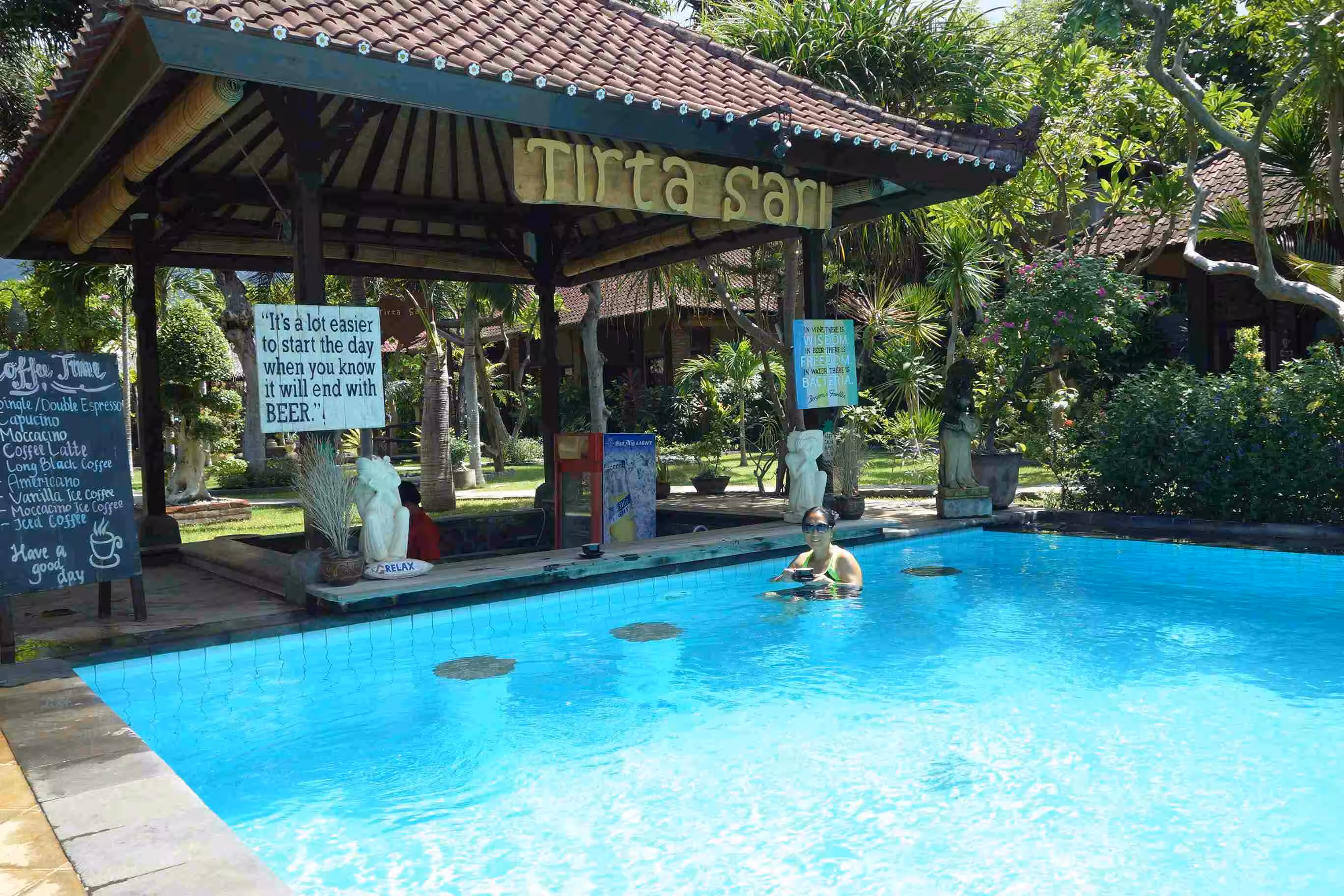 2020.03.17 – Pemuteran – Pemuteran (Indonesia) – During our breakfast, we discussed our travel options as to whether we should stop our travel and attempt to fly back home as per the government’s request. As we currently feel quite comfortable on the road and no one has been fighting over toilet paper, we’ve agreed to continue our journey until Jakarta after which we’ll reassess our options. We had planned for a nearby hike to a temple but we opted to take it easy due to the hot weather. Nonetheless, we spent some time investigating our home internet outage since the last couple of days. With the generous help of our neighbor friends, they were able to get our internet access at home working again. In the afternoon, we went snorkeling from the beach to explore the Biorock site. Under the Biorock rehabilitation project, the locals had built metal structures at the bottom of the seabed and fed it with some low voltage to help accelerate the formation of coral. It was an interesting snorkeling discovery. We finished the afternoon in our accommodation’s pool. In the evening, we walked back to the main street to try a different restaurant for our last night meal in Pemuteran.