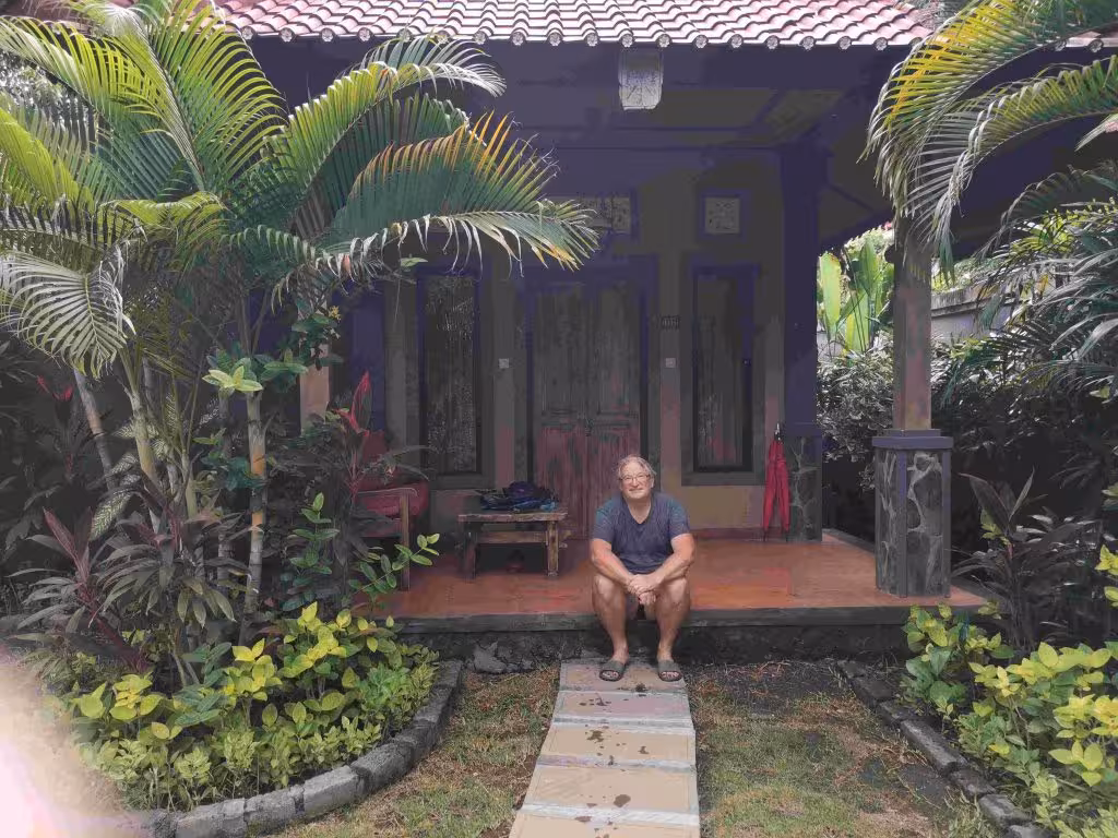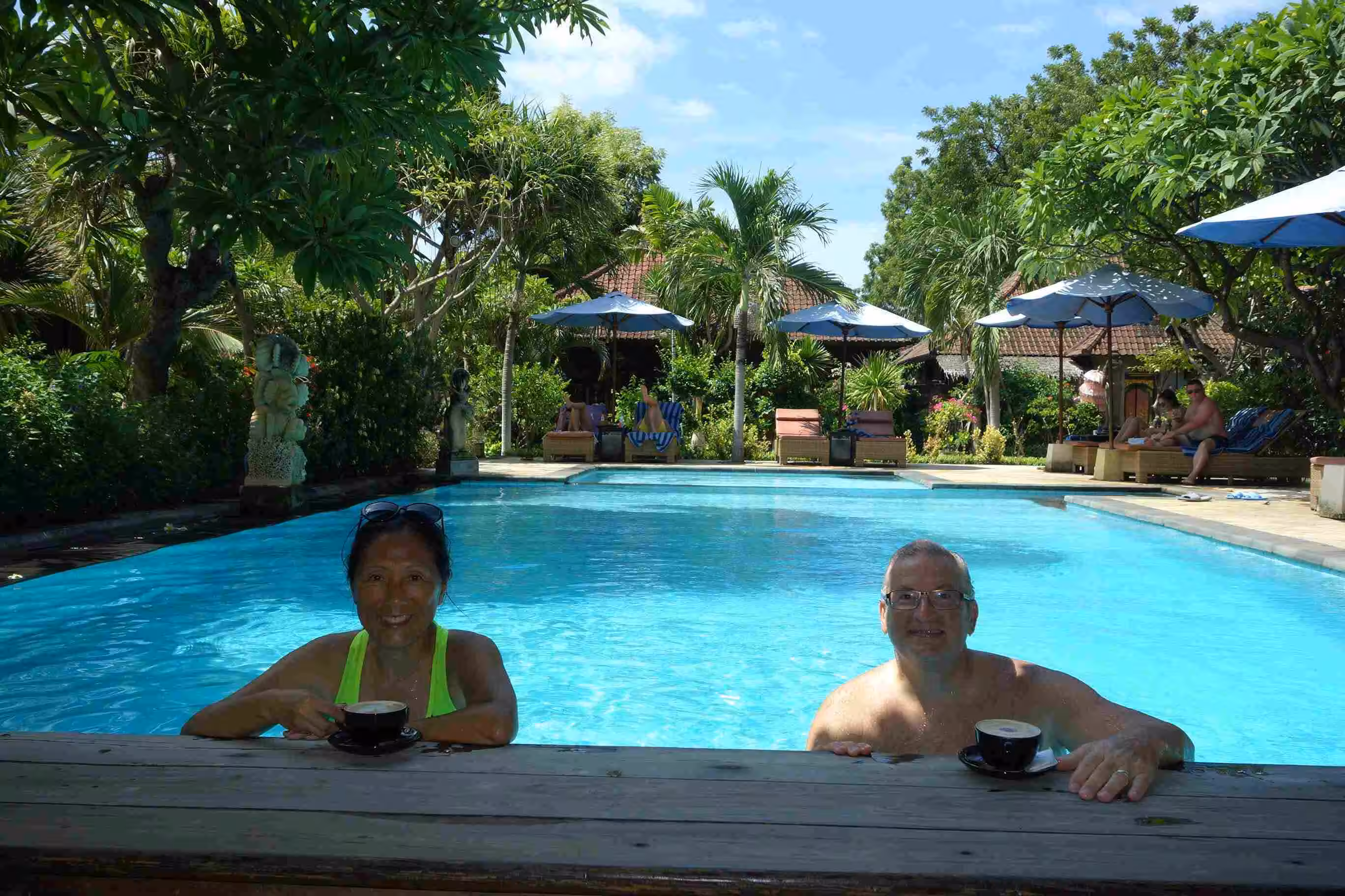 2020.03.15 – Seminyak – Pemuteran (Indonesia) – After an early breakfast, we took a GrabCar from our hotel to the Ubung Bus terminal. Upon our arrival there, we were quickly ushered in a waiting bus and asked to pay our travel immediately. Although we probably paid an extra 2-3 cdn as foreigner on the bus, we were just happy for not have to wait for a transport. After a 3.5h bus ride, we were dropped off at an important roadside intersection. We bargained with a bemo driver for a ride to Pemuteran some 20kms on a side road. As only three passengers from the bus boarded the bemo, the driver waited for more passengers to show up. In the meantime, we looked up our Grab application and discovered we could order a car to Pemuteran. Some 10 minutes after our request, the GrabCar showed up and we boarded the car. Unfortunately, the Grab driver got caught in argument with the bemos drivers waiting for fares. Ultimately, the Grab driver was very apologetic and he explained that he could not take us to Pemuteran. By then the bemo had filled up with more passengers and we started on the road as soon as we boarded. The bemo dropped us off on the main road in Pemuteran just 100m away from our accommodation. After checking in our nice bungalow, we went for a swim in the pool. We enjoyed having a latte and cappuccino from the poolside bar. We were so impressed by the peaceful town and our comfortable accommodation. It had so many activities nearby that we opted to extend our stay by another day before moving on to the island of Java. We were very thankful that we modified our travel itinerary to include a stop in Pemuteran where quickly appeared to be our favorite destination in Bali. In the evening, we ate at our accommodation’s restaurant.